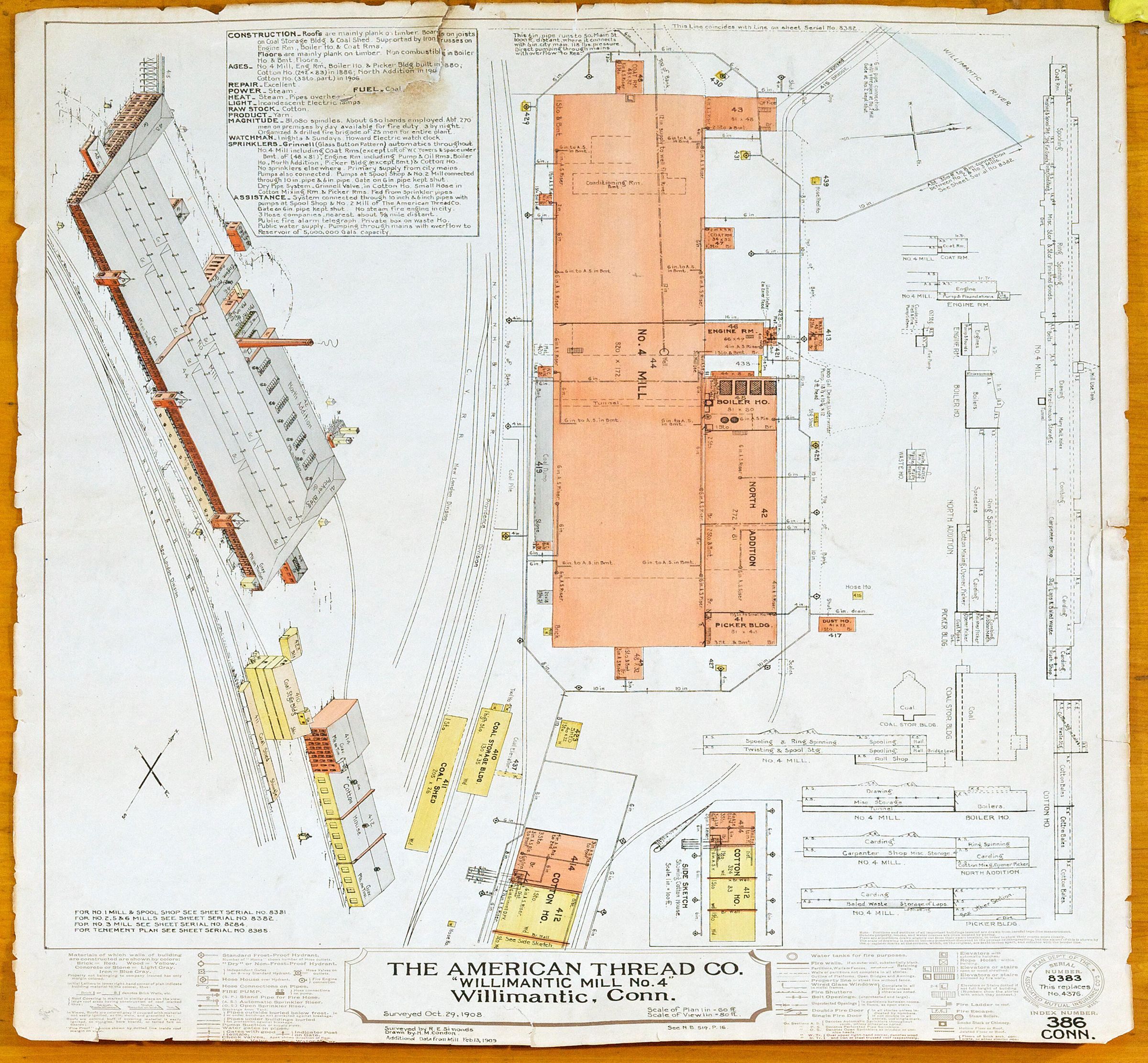 Fire insurance plan of Willimantic Mill No. 4, American Thread Company, Willimantic, CT. Scale of plan: 1 in. = 60 ft. Scale of view: 1 in. = 80 ft. Surveyed Oct 29, 1908. Surveyed by R. E. Simonds. Associated Mutual Insurance Co., serial number 8383, index number 386 CONN. Color coded. Digital photo for the Mill Museum by Harrison Judd.Collection