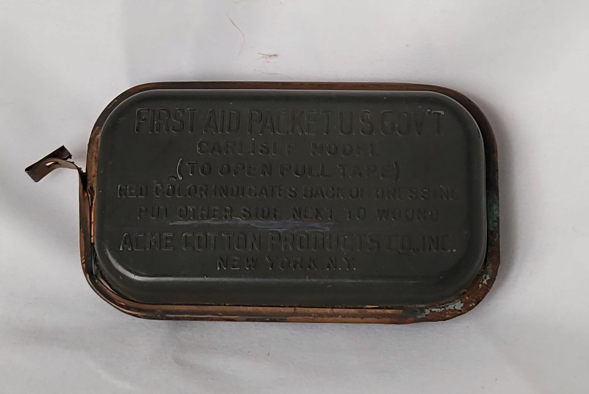 A World War II government issued first aid packet, Carlisle Model. There were a number of variants of the Carlisle Model first aid packet over the course of the war but this was the first to be made of "Tenite" plastic (to conserve brass and/or tin for other war efforts) and to include the Sulfanilamide Shaker Envelope which was to be sprinkled over the wound before the bandage was applied to prevent infection. Acme Cotton Products Co., Inc. received the commission from the government for the dressing. The front of the packet, in raised letters, says