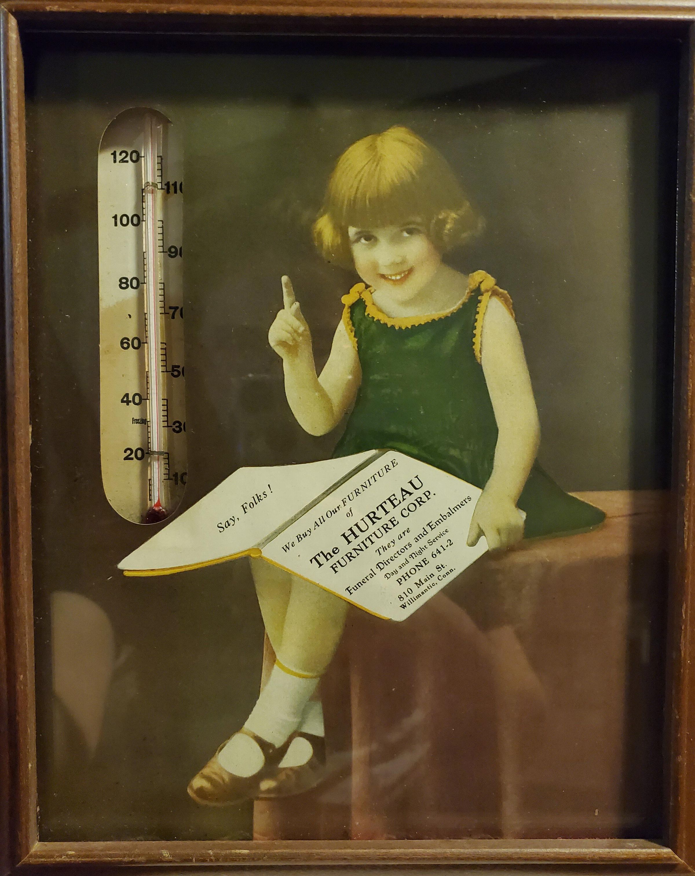 A framed ad with temperature gauge for a furniture store in Willimantic, CTCreated By