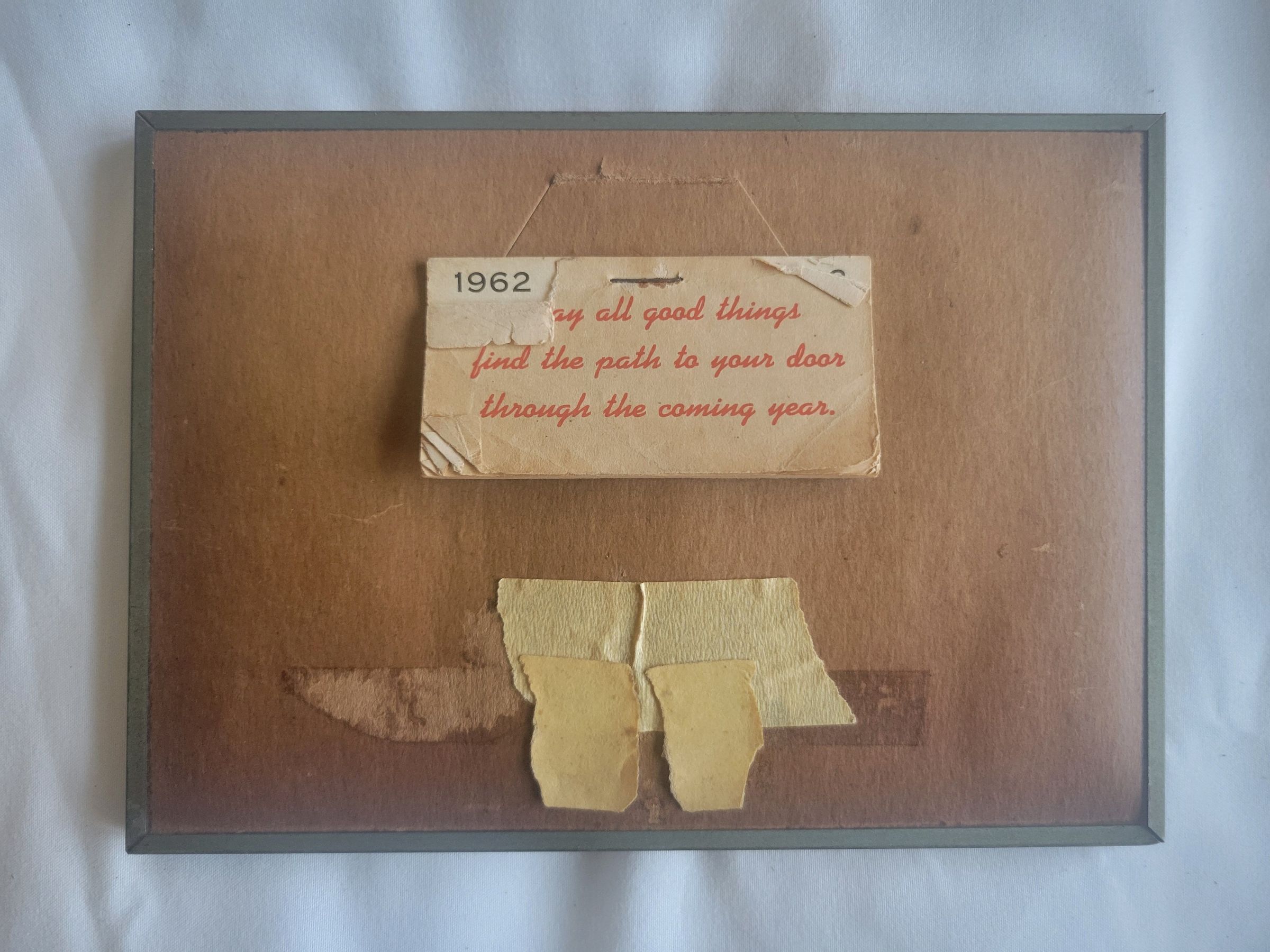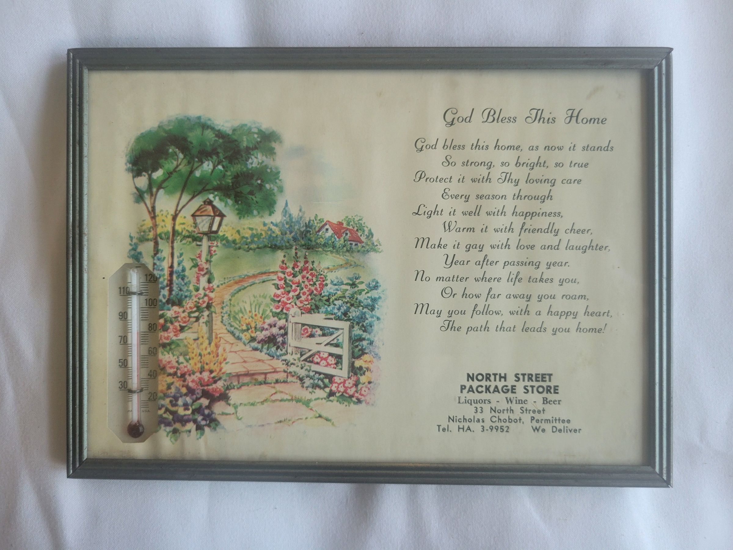 A frame featuring a poem titled "God Bless this Home," a watercolor picture of a garden pathway, and a built in thermometer. Also included is information for the North Street Package Store where the frame was acquired. On the back is a small calendar for 1962.Collection