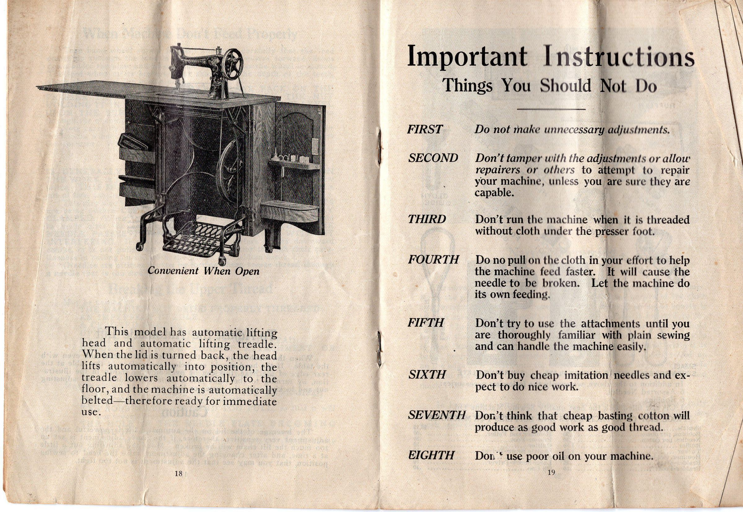 Manual from a model "Free" sewing machine treadle. Missing cover and many other pages.Created By