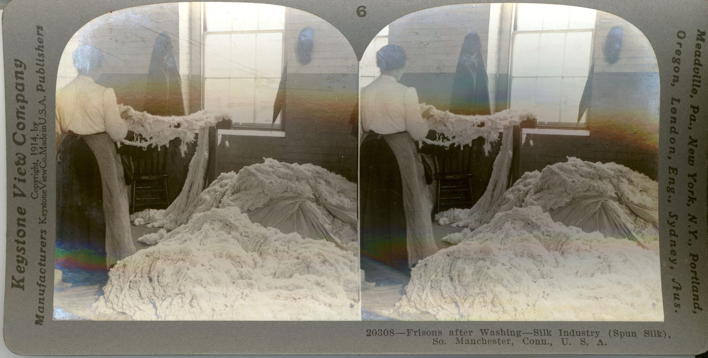 Stereograph of frisons after washing. Frison is waste silk, such as from the outside of the silk cocoon. It is too coarse and uneven for reeling. Taken at Cheney Brothers silk mills in South Manchester, CT 1914. Black and white print on cardboard. Card is warped. Unknown photographer. Studio: Keystone View Company, Meadville, PA. Serial #20308Photograph Details
