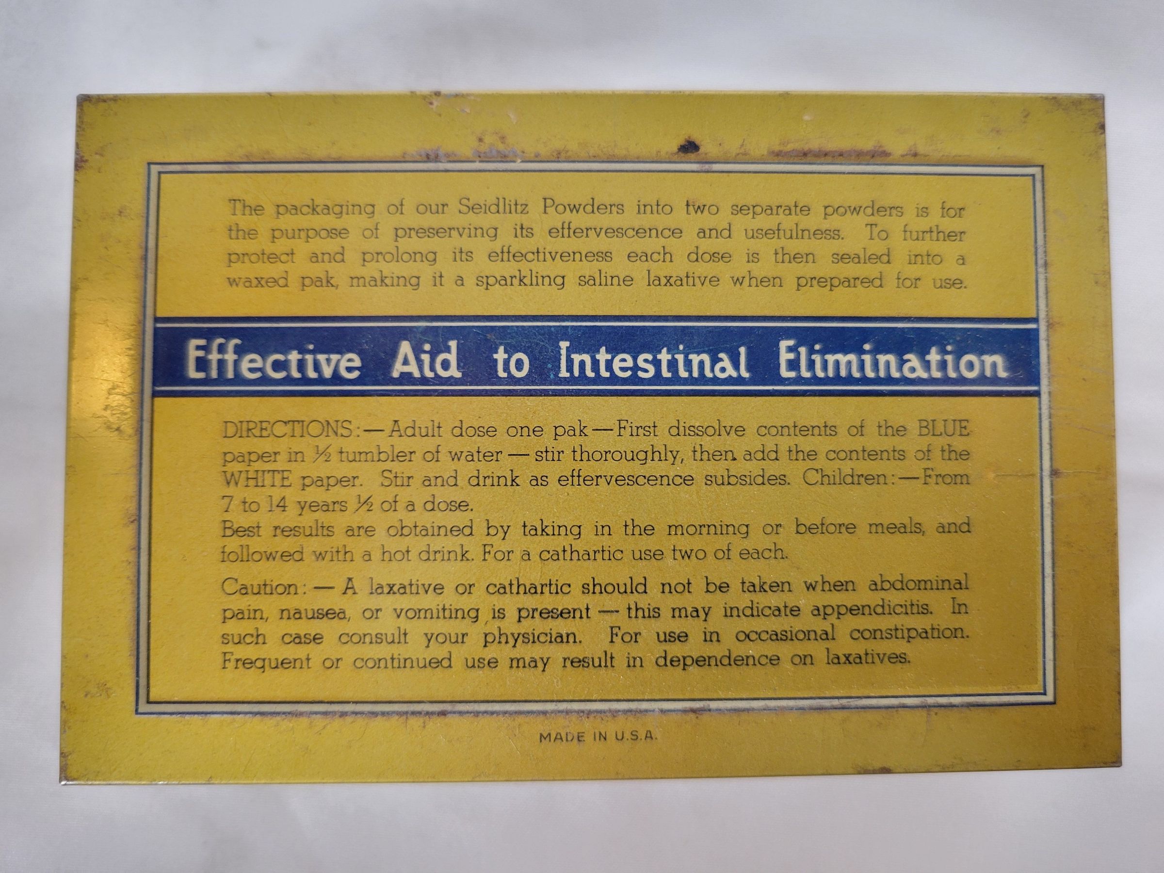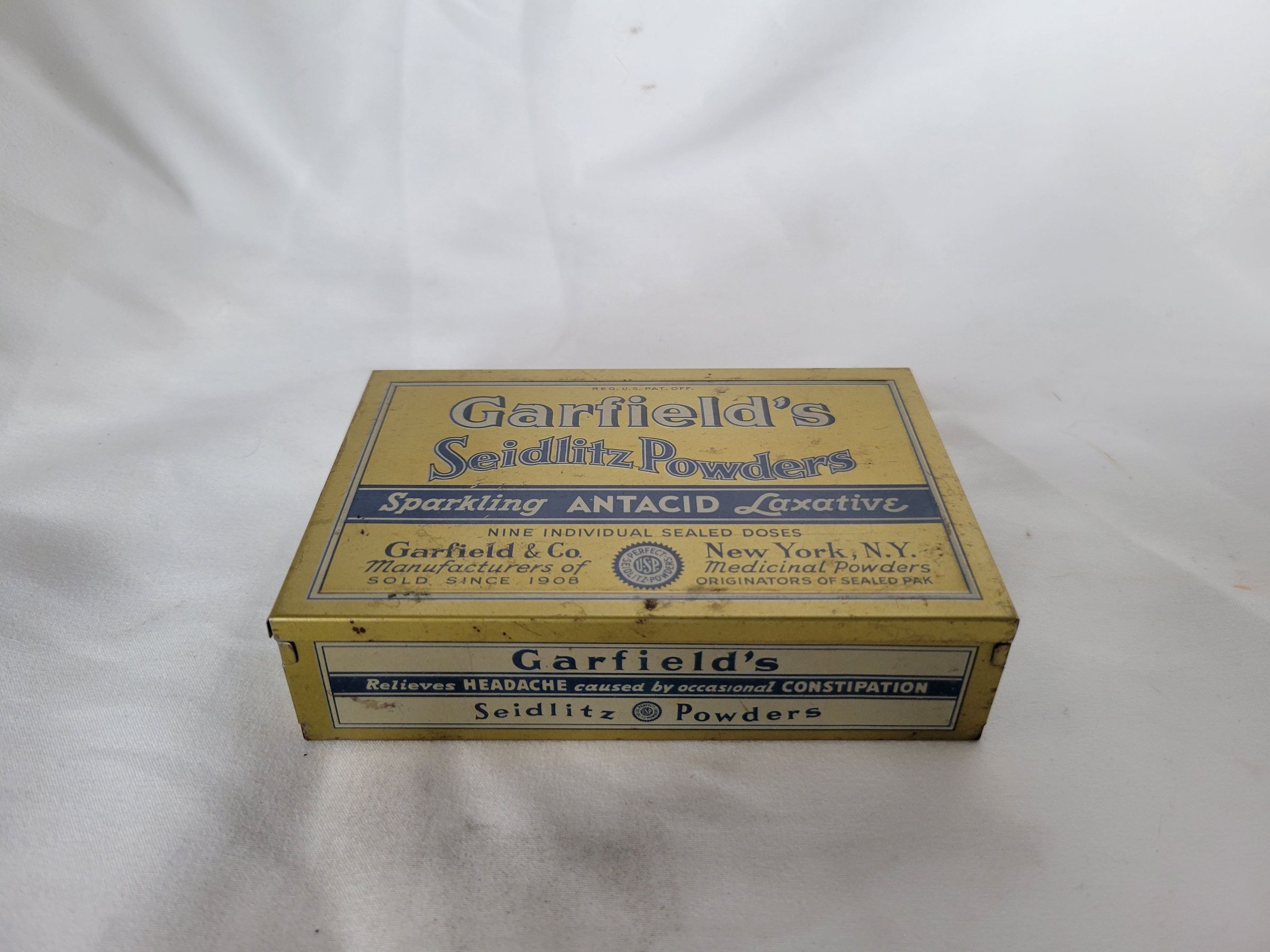A gold, blue, and white rectangular tin made to hold Garfield's Seidlitz Powders. Garfield & Co was established in 1908 and manufactured seidlitz powders, or laxatives. The tin is empty and has a couple of small rust spots but is otherwise in good condition.Collection