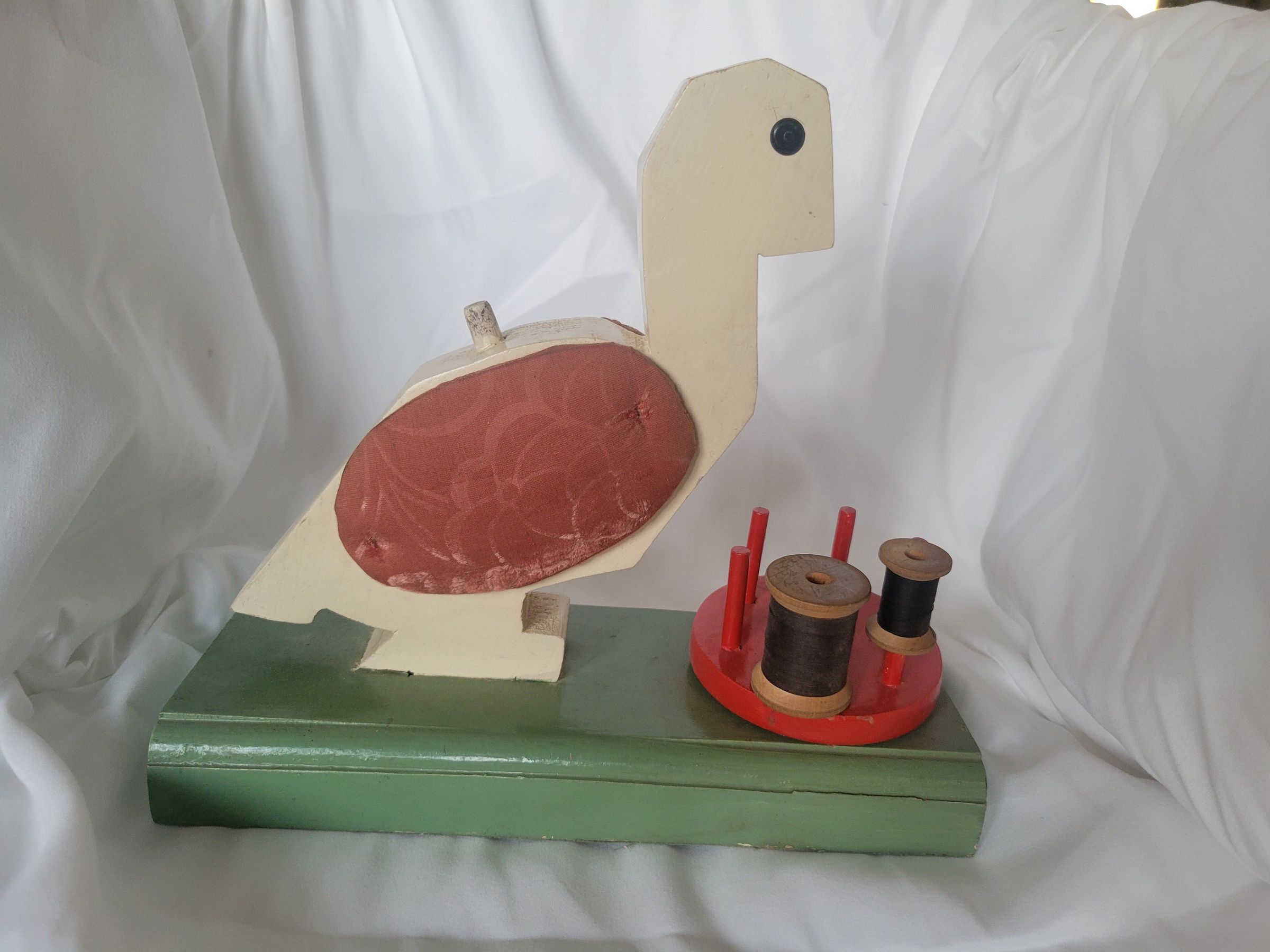 A holder for various sewing notions in the shape of a goose on a green base. The red disc with spindles spins freely and is meant to hold spools of thread, a pair of long thin scissors may be inserted through the top of the goose's head to create its beak, the wings of the goose are padded pin cushions, and the small spindle on its back is meant to hold a thimble.Collection