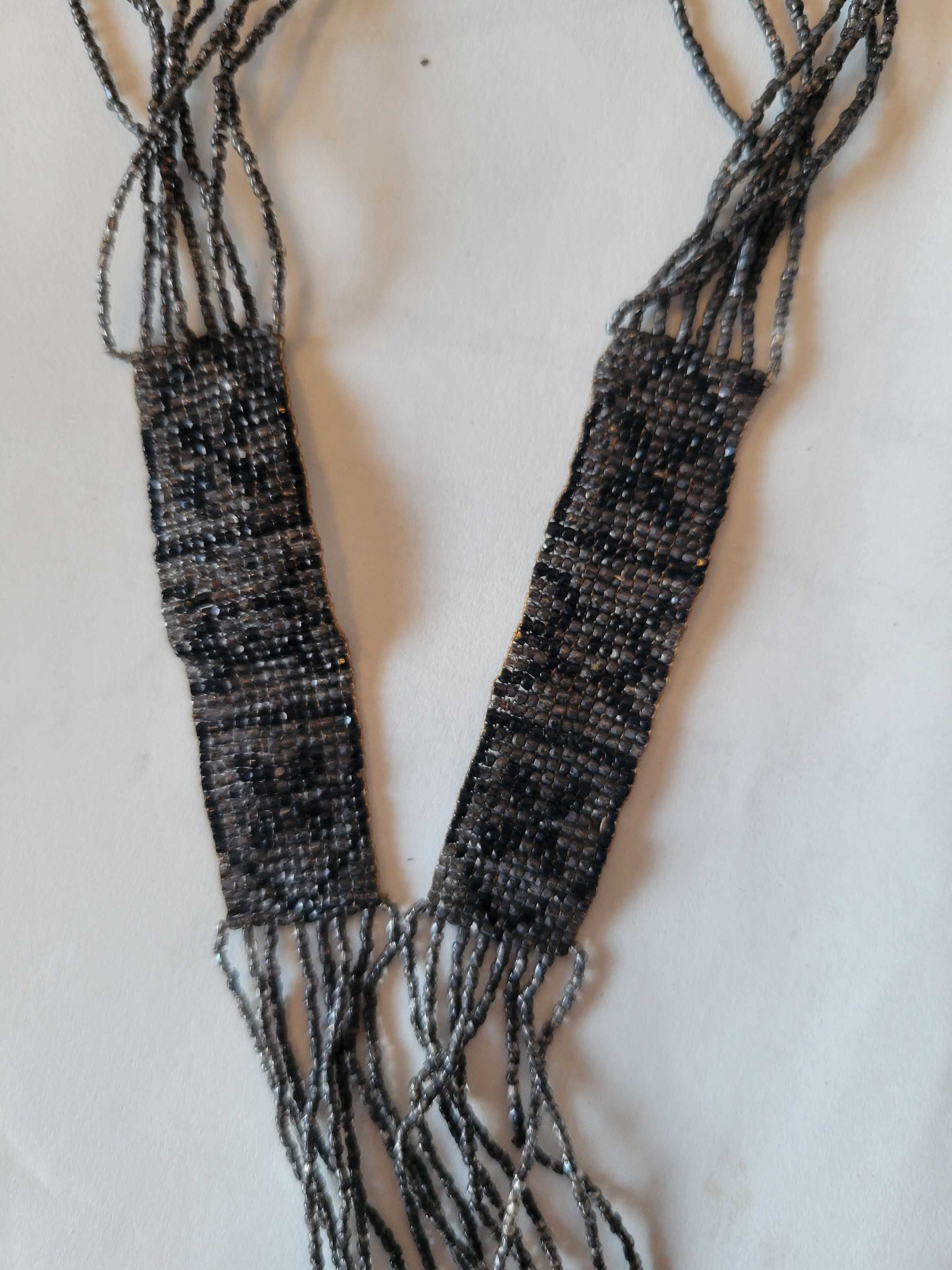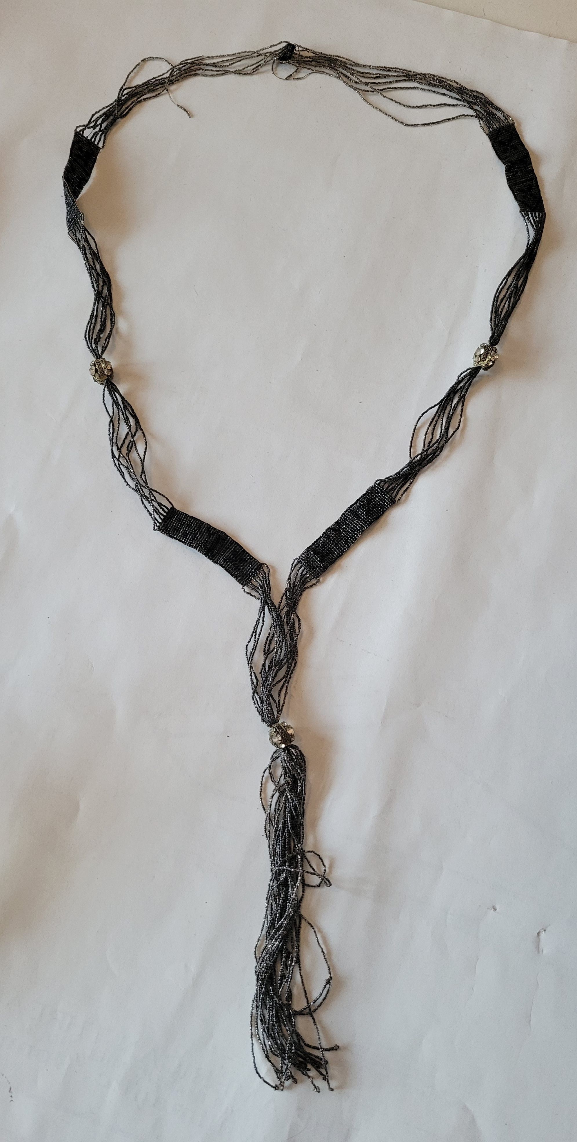 A grey and black beaded art deco style necklace. These types of long beaded necklaces were popular in the 1920s and into the 1930s. This necklace is broken at the top, a few of the beaded strands are loose.Collection