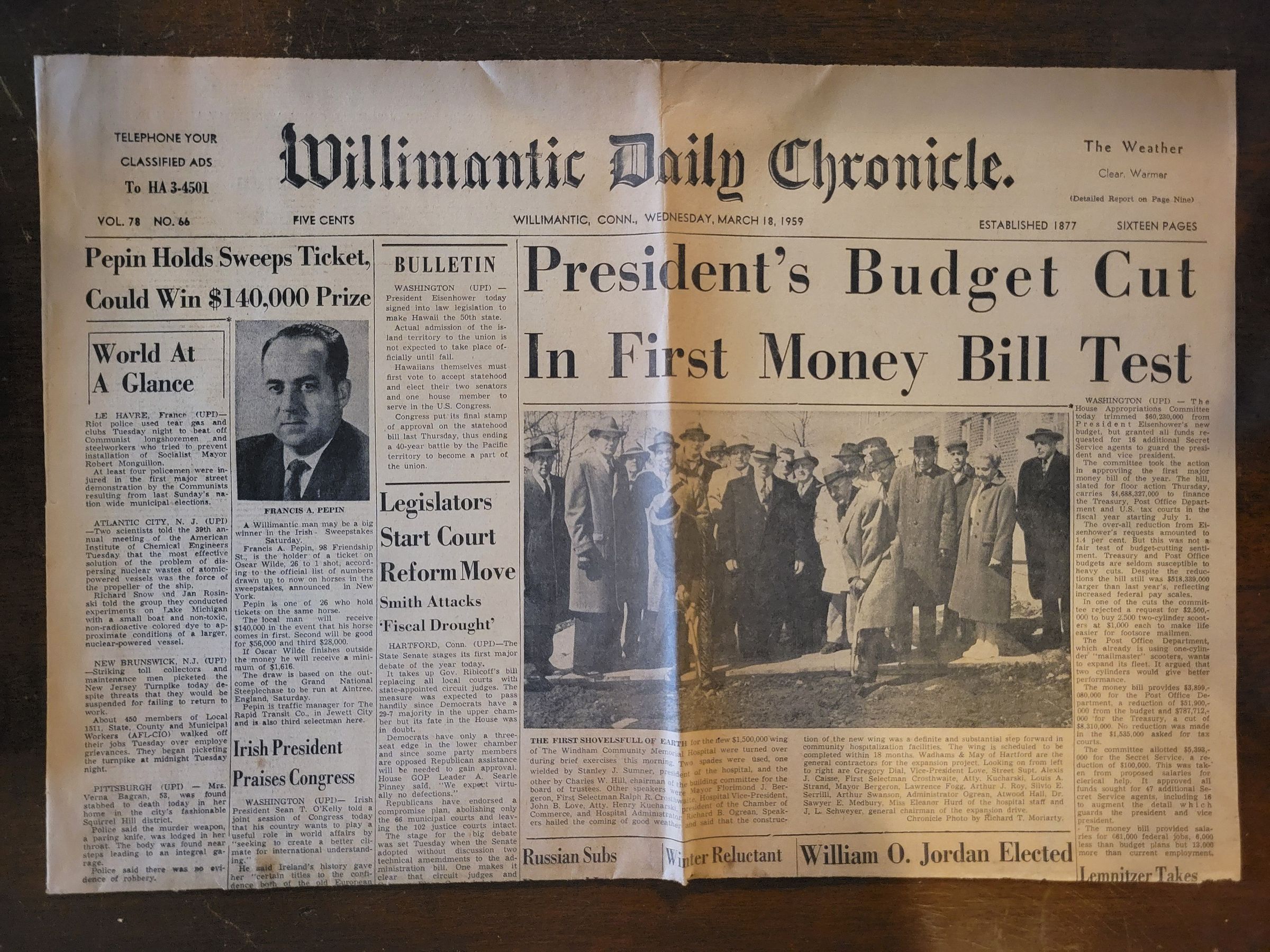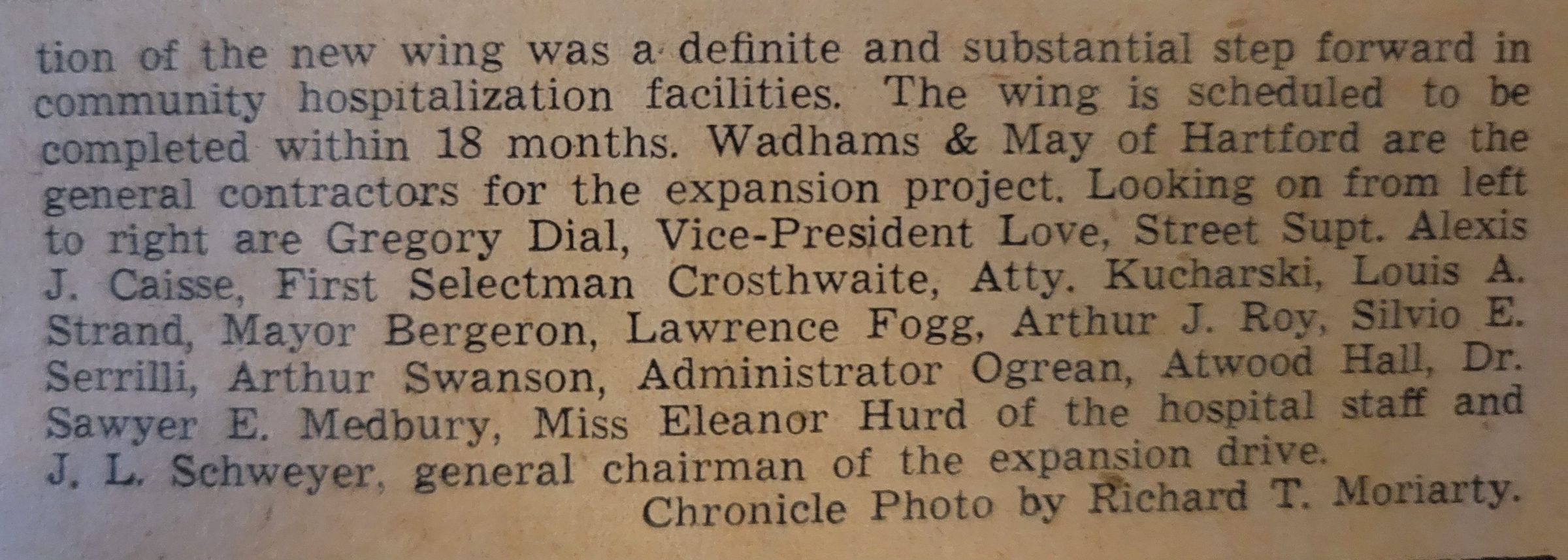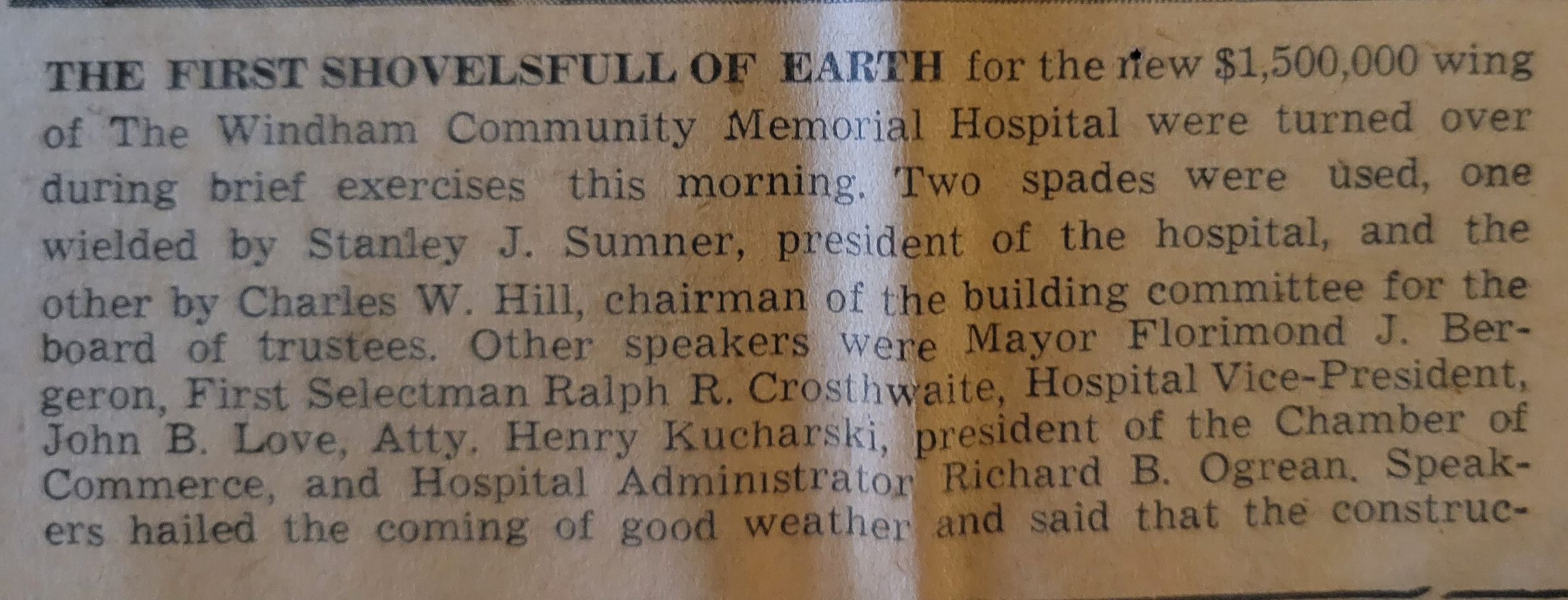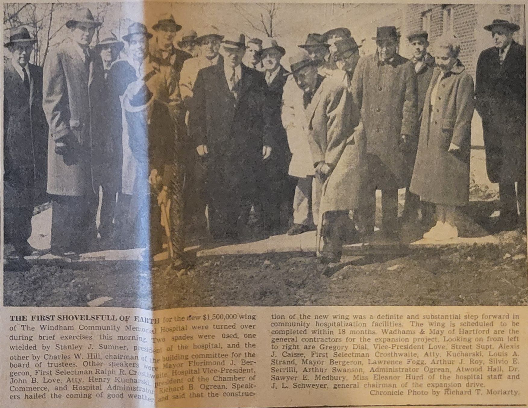 A newspaper article featuring Charles W. Hill, shown digging with a ceremonial shovel at the groundbreaking for the new wing of the Windham County Memorial Hospital. Beside him in the photograph is Stanley J. Sumner, president of the hospital. Charles Hill was the chairman of the building committee. The photograph and article were featured on the front page of the Willimantic Daily Chronicle, March 18, 1959. Photograph by Richard T. Moriarty.Collection