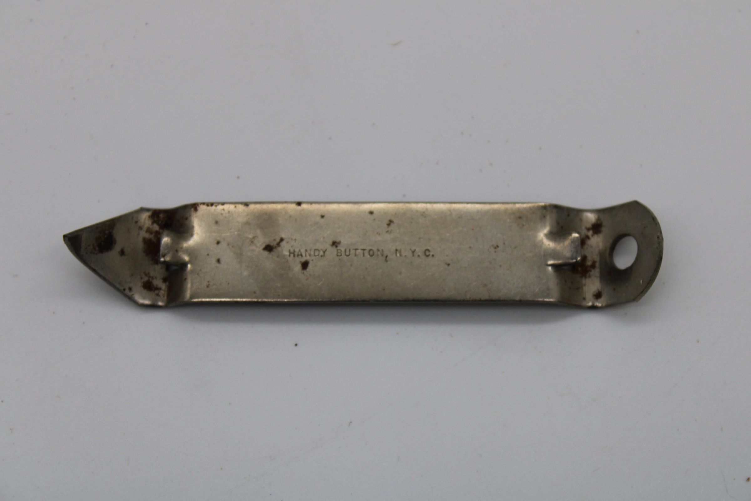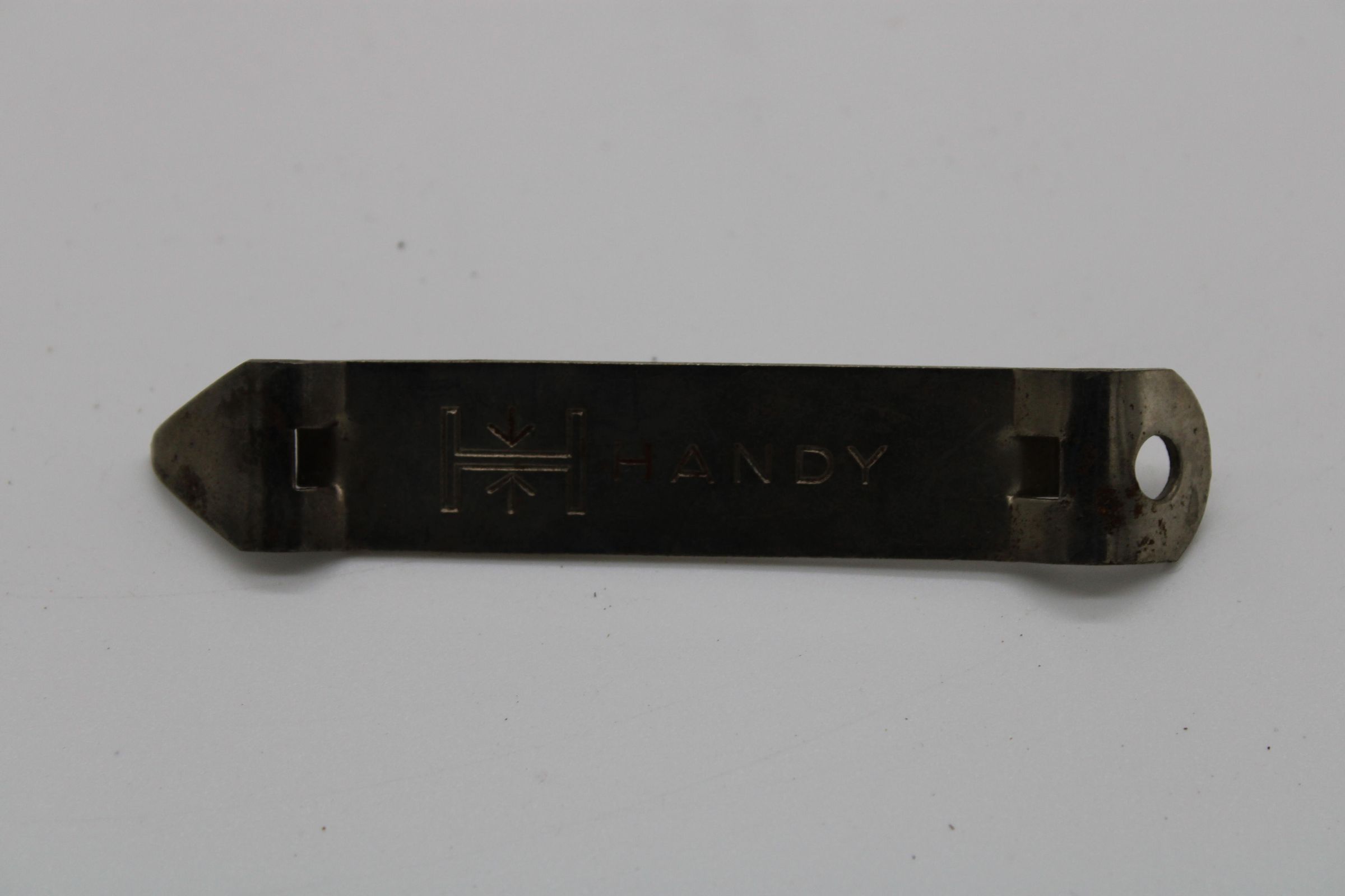 A metal bottle opener. One side has a logo and the word "HANDY" printed on it. The other says, in smaller script "HANDY BUTTON, N.Y.C.".Location