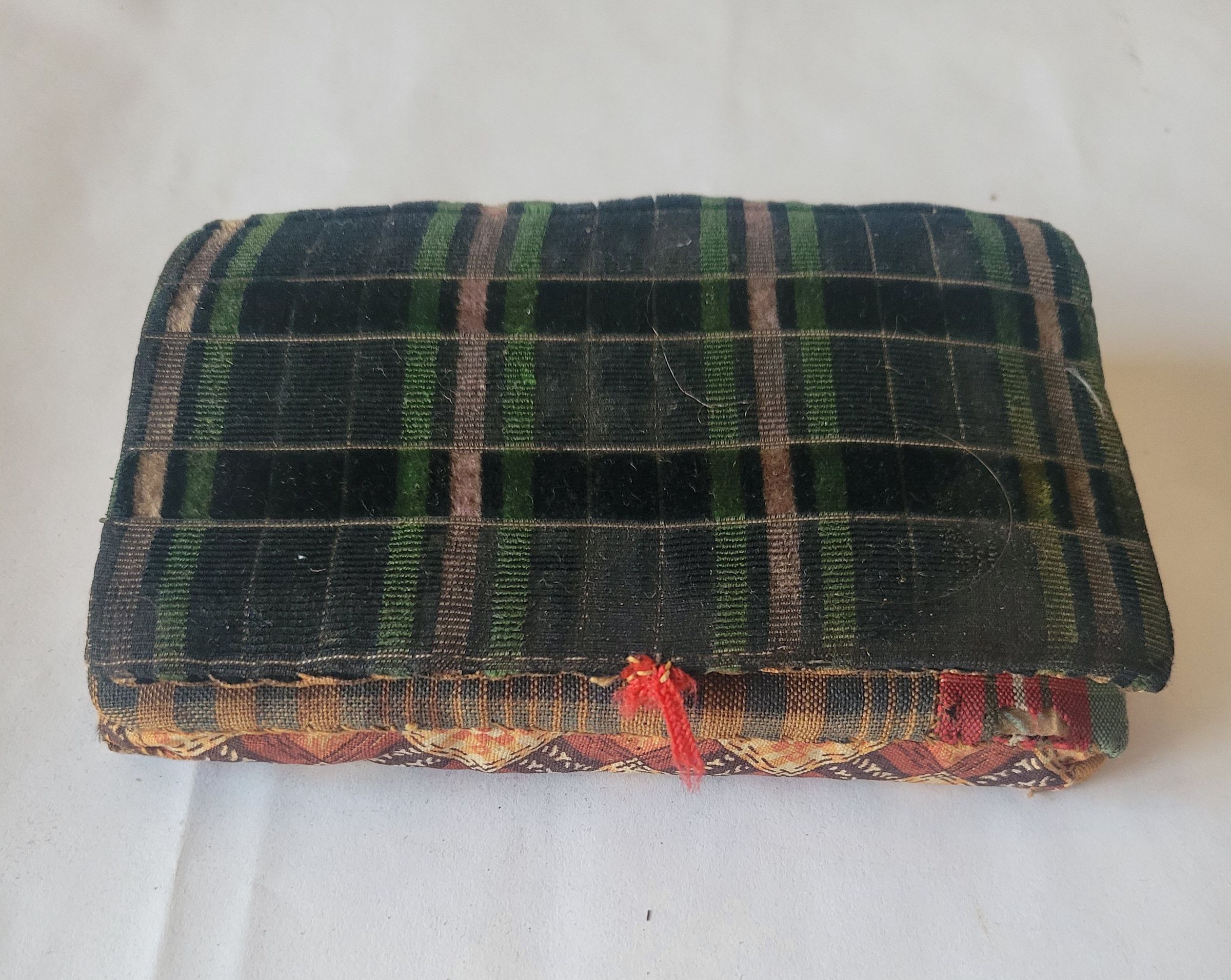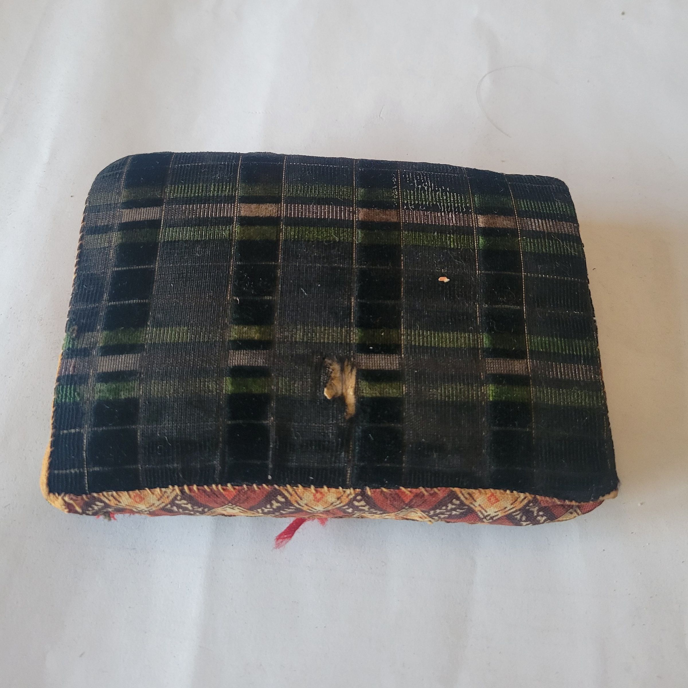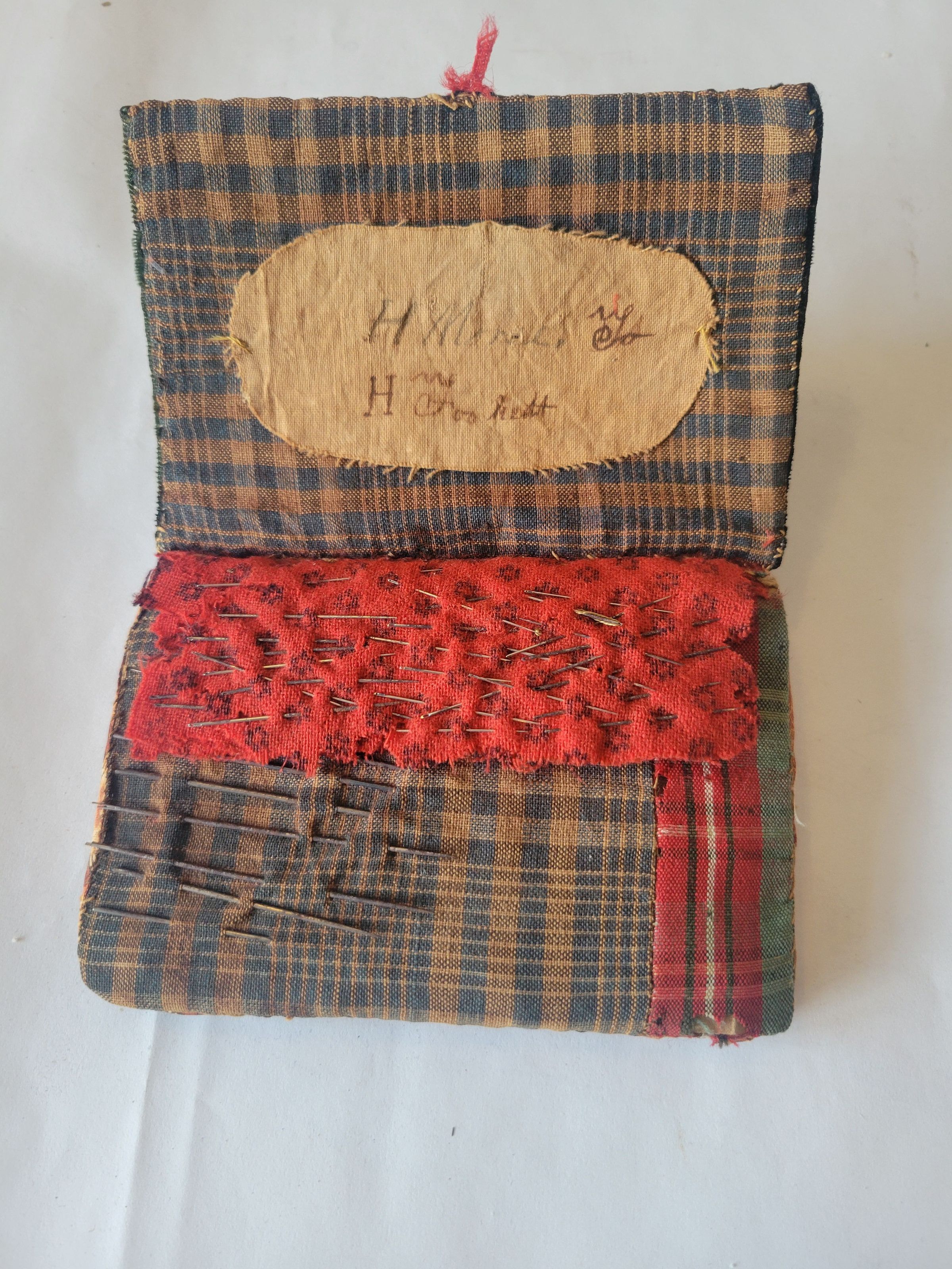 A homemade pincushion made from scraps of fabric to resemble a suit case. There are several pins and needles stuck to the inside, the needles on the main cushion and the pins on a flap of fabric which is severely deteriorated. On the inside of the cover is a beige fabric plaque which is written on in pen in two lines. The letter H is legible at the beginning of each line but the rest is illegible. There is also a worn spot on the back of the piece.Collection
