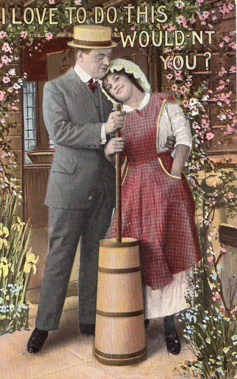 A postcard with the saying I love to do this wouldn't you? with a couple churning butter.Postcard Details