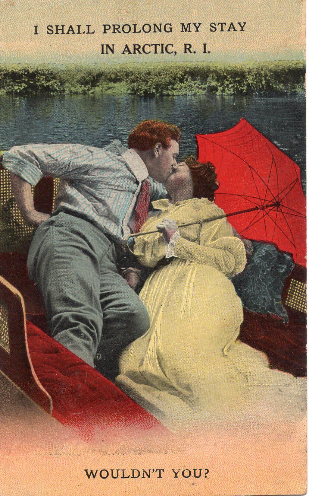 A postcard of a couple on a lake with the words "I Shall Prolong my Stay" "Wouldn't You?" Arctic, R.I. printed on it.Condition