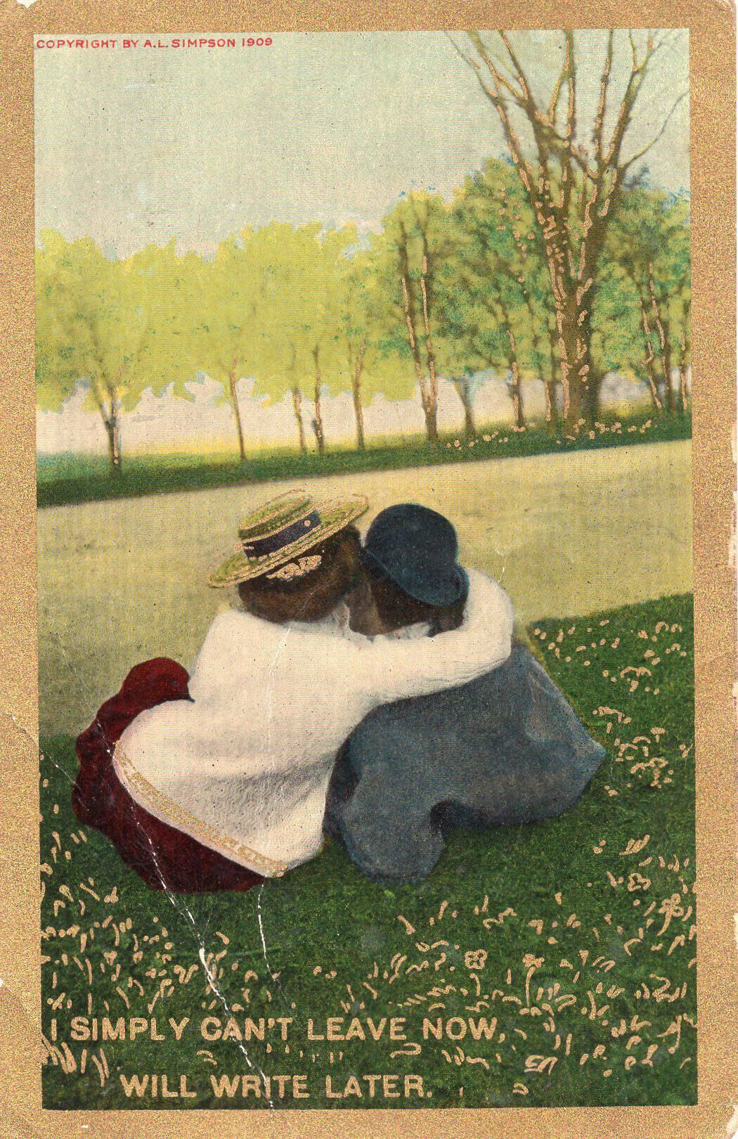 A postcard of a two people hugging in a field and the words "I Simply Can't Leave Now, Will Write Later" printed on it.Condition