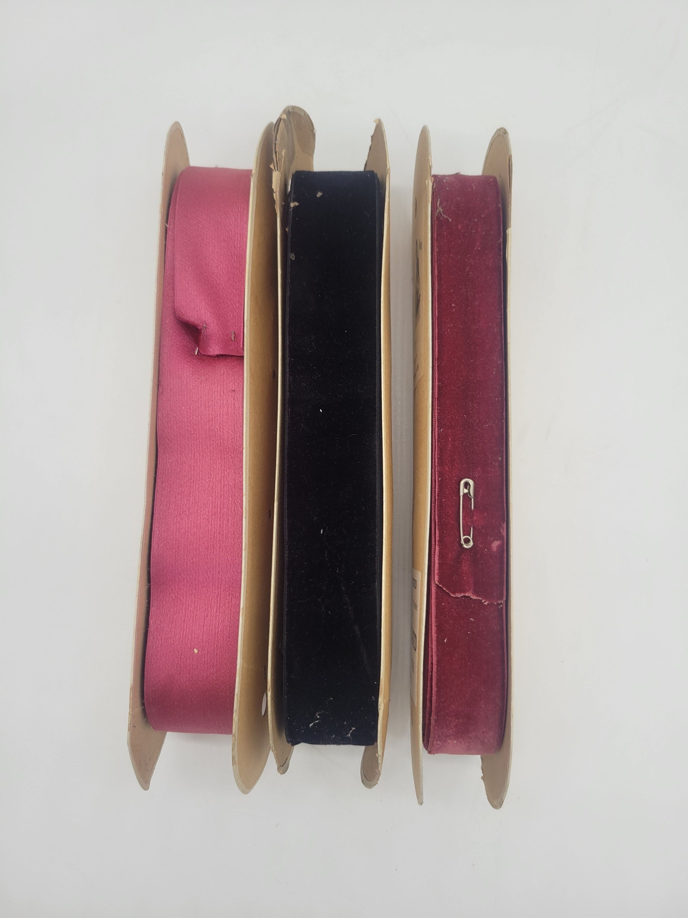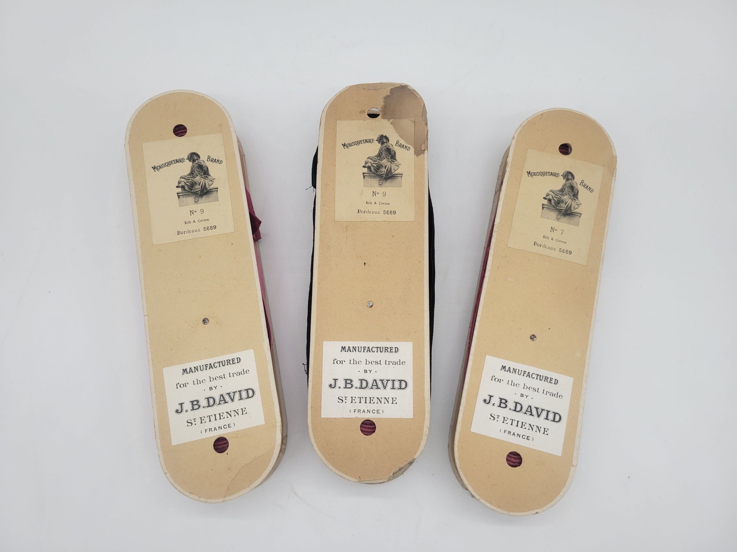 Three spools of ribbon from J.B. David of St. Etienne, France. These spools are from the Mousquetaire (Musketeer) Brand popular in the 1920s and 30s and are all labeled Bordeaux 5689 for the color. The brand label features and engraving of a musketeer. Two spools are also labeled No. 9, while the other is No. 7. The No. 9 spools are velvet 1.25" ribbon, while the other is satin 1". All three spools are essentially the same burgundy color but one spool has some black velvet 1.25" ribbon wrapped over the original ribbon.Collection