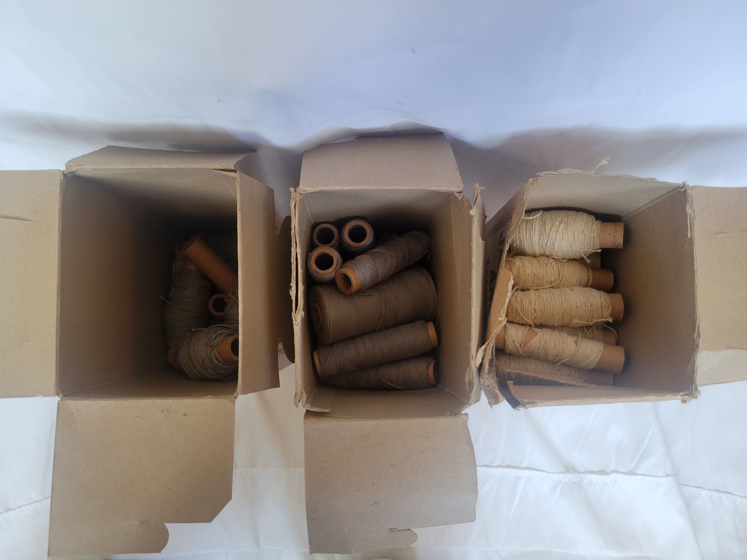 Three brown carboard thread boxes with black and red writing from the January and Wood Company, including a number of spools of thread. The boxes are torn in various places but are mostly intact. Two of the boxes contain a few spools of grey thread and the third box is full of spools of beige thread.