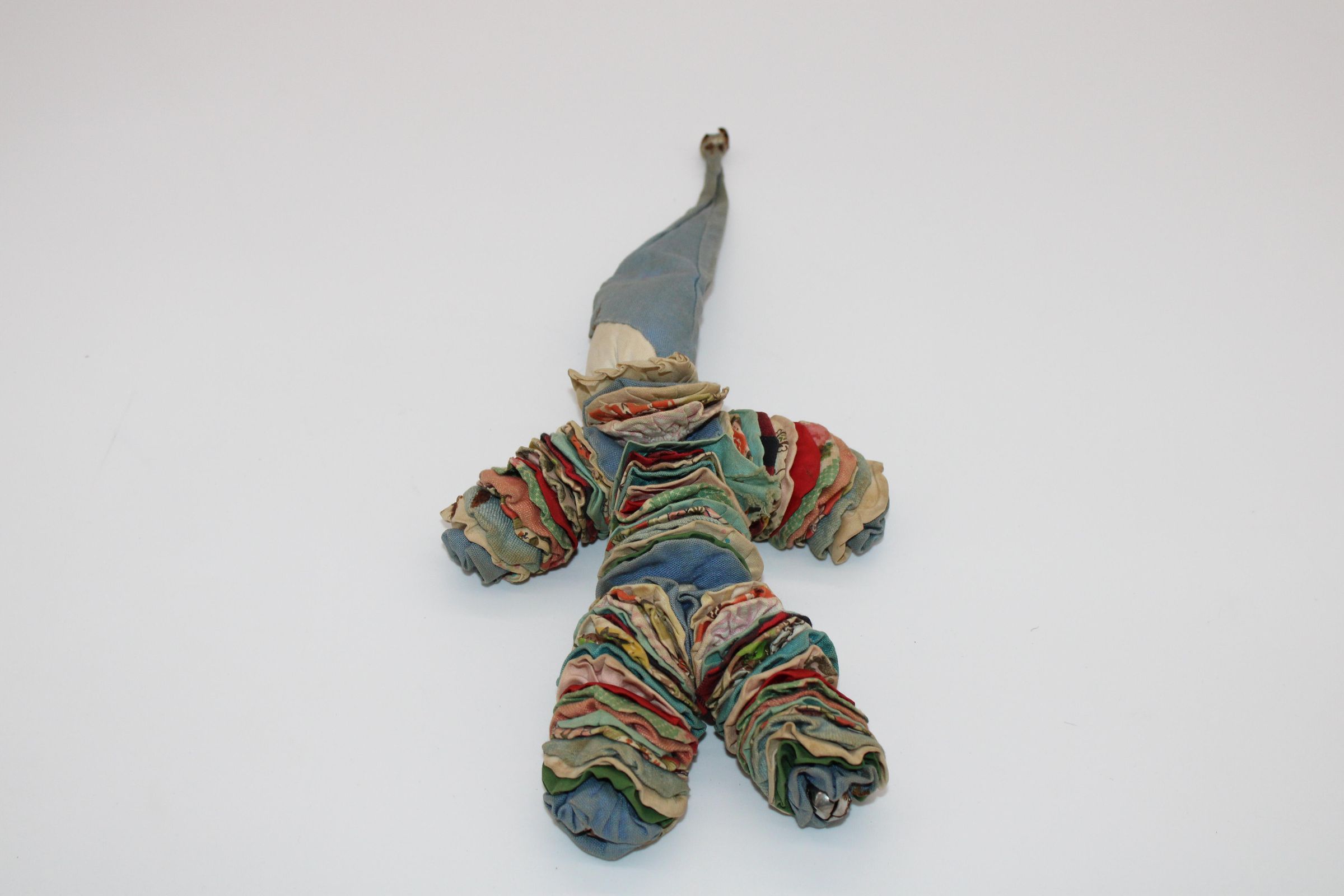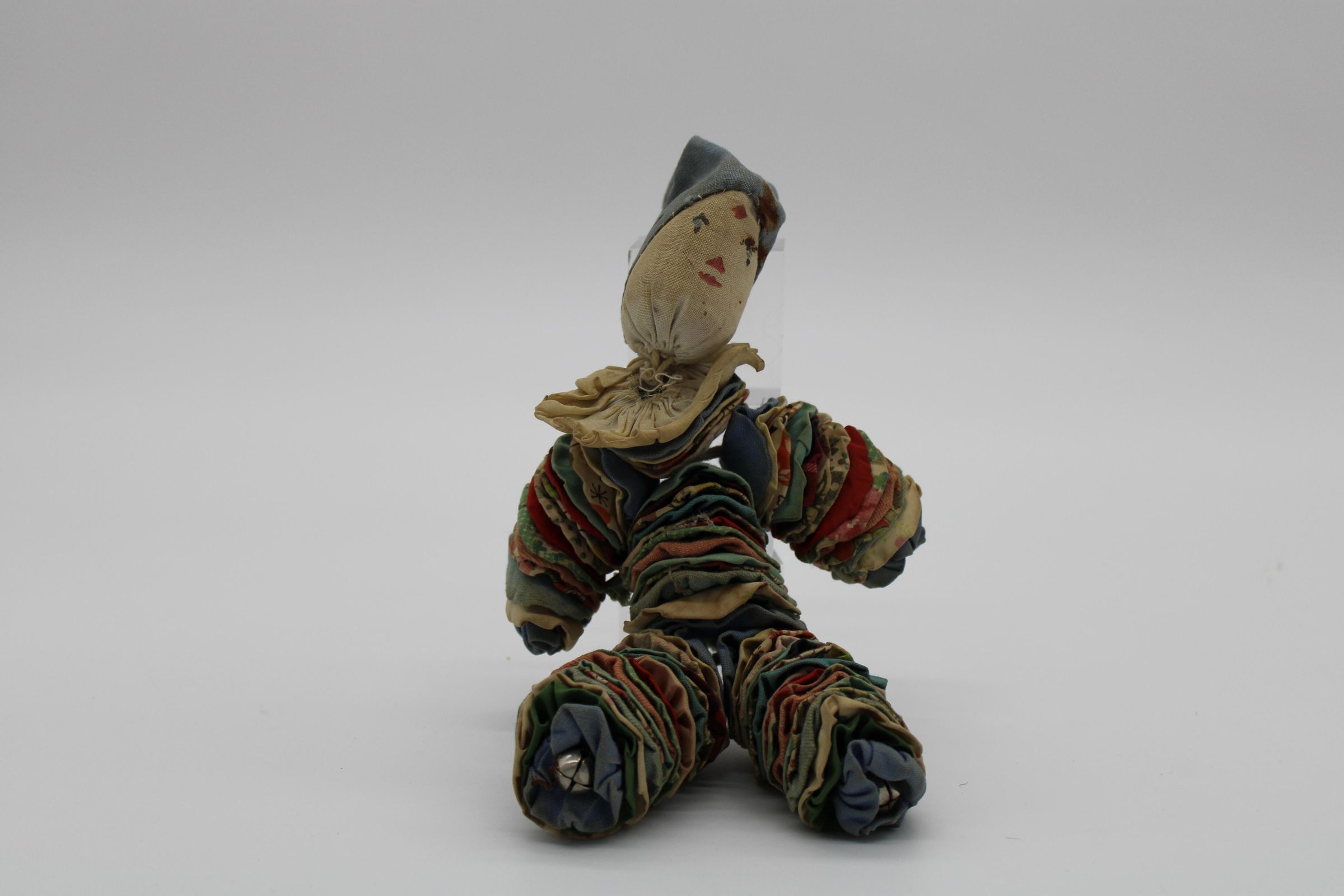 A doll made of rope, fabric, and bells. The limbs are circles of fabric gathered and lined along rope pieces. Each limb has a small, silver bell at the end. The face is painted on. The long, pointy hat is stained at the base and has a bell at the end. Handsewn.Made/Created