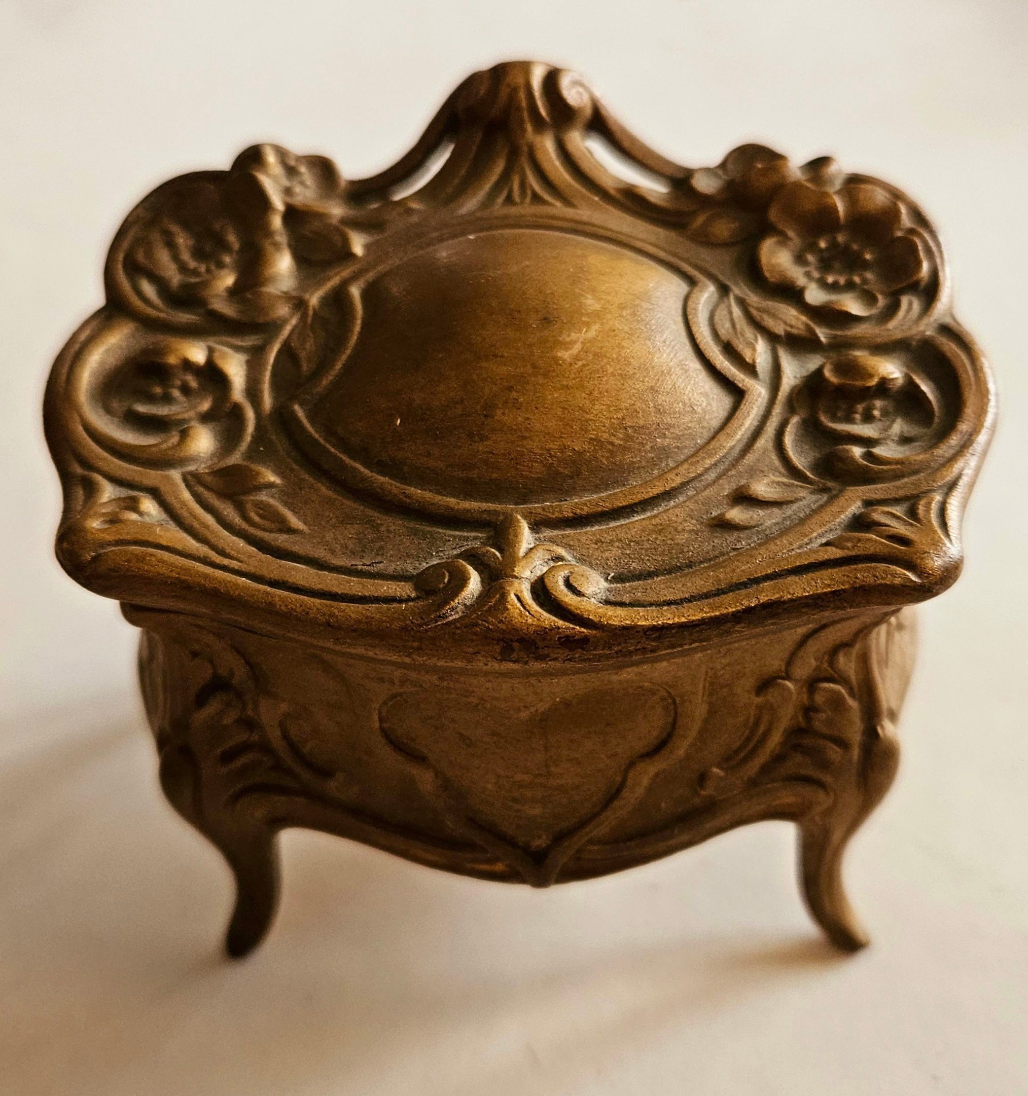 Metal jewelry case or box. An example of Art Nouveau, which flourished from c. 1890 until World War I. Donated with 40 other, similar metal jewelry boxes that belonged to the donor's late mother, who collected them. Eight of the jewelry boxes bear the mark JB. JB was the mark of Jennings Brothers of Bridgeport, CT. Edward (1863-1952) and Edwin Jennings founded the American Jewelry Company in Bridgeport in 1888. In 1890 they changed the name to Jennings Brothers. The company continued to manufacture fine metal items cast from molds: clocks, bookends, statues, metal cases, candelabras, and some silver plate. All Jennings Brothers products were labeled JB. In 1905, the company moved from its original small, wooden building to a larger building on Elm Street, a former gun foundry. Jennings Brothers went out of business in 1953. In the 1960s, its molds were sold to a company in Pennsylvania, which continued to use them, although the newer castings are not considered by collectors to be of good quality. Three others are marked B & W (Brainard & Wilson of Danbury, CT, 1909-1922). Two are marked W. B. Manufacturing Co. (Weidlich Brothers of Bridgeport, CT, 1905-1950; co-founder Charles E. Weidlich previously worked at the Wheeler and Wilson sewing machine company, also of Bridgeport). One is marked W & W. The others do not bear any readable manufacturer's marks.Item Type