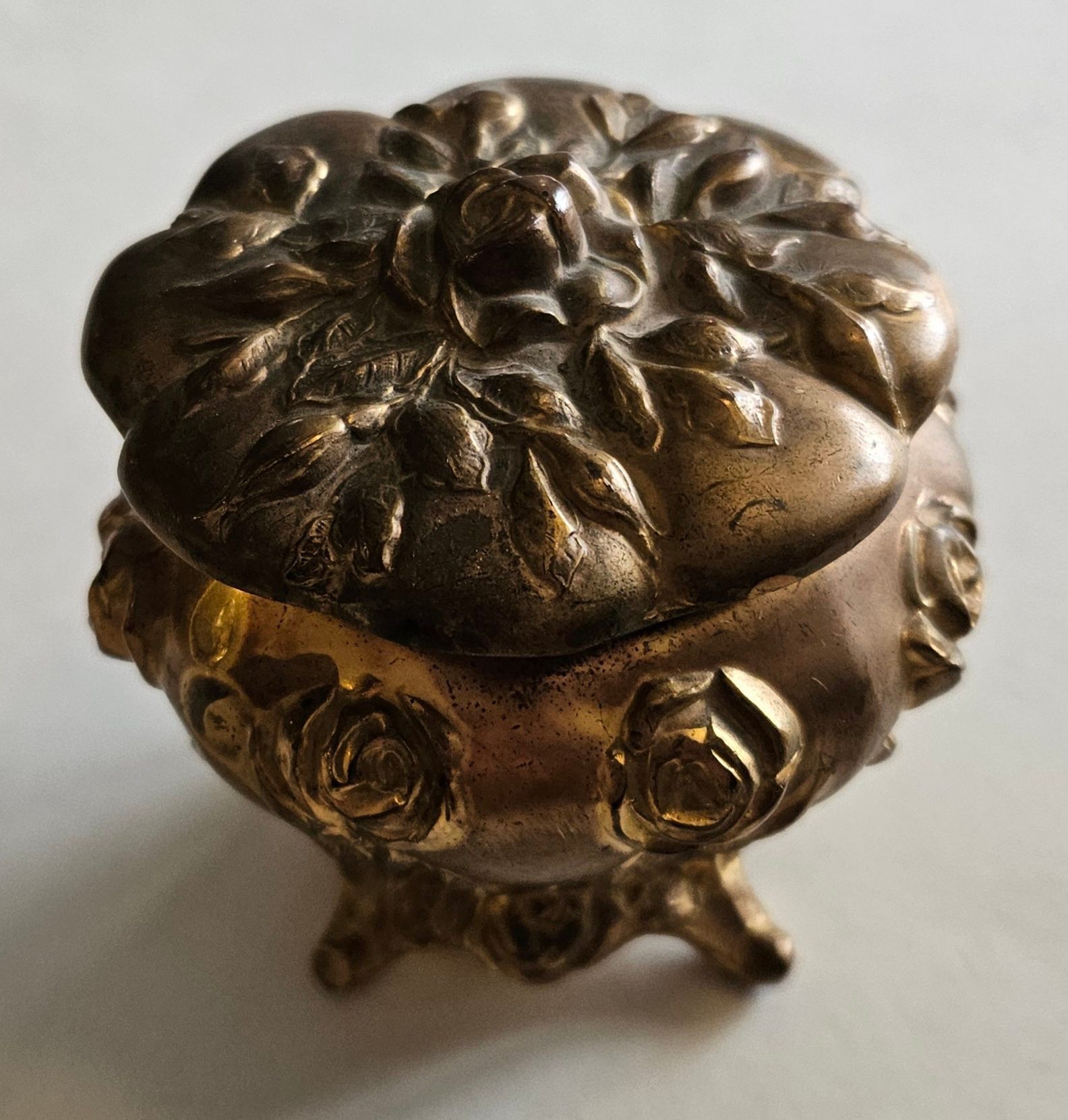 Metal jewelry case or box. An example of Art Nouveau, which flourished from c. 1890 until World War I. Donated with 40 other, similar metal jewelry boxes that belonged to the donor's late mother, who collected them. Eight of the jewelry boxes bear the mark JB. JB was the mark of Jennings Brothers of Bridgeport, CT. Edward (1863-1952) and Edwin Jennings founded the American Jewelry Company in Bridgeport in 1888. In 1890 they changed the name to Jennings Brothers. The company continued to manufacture fine metal items cast from molds: clocks, bookends, statues, metal cases, candelabras, and some silver plate. All Jennings Brothers products were labeled JB. In 1905, the company moved from its original small, wooden building to a larger building on Elm Street, a former gun foundry. Jennings Brothers went out of business in 1953. In the 1960s, its molds were sold to a company in Pennsylvania, which continued to use them, although the newer castings are not considered by collectors to be of good quality. Three others are marked B & W (Brainard & Wilson of Danbury, CT, 1909-1922). Two are marked W. B. Manufacturing Co. (Weidlich Brothers of Bridgeport, CT, 1905-1950; co-founder Charles E. Weidlich previously worked at the Wheeler and Wilson sewing machine company, also of Bridgeport). One is marked W & W. The others do not bear any readable manufacturer's marks.Item Type
