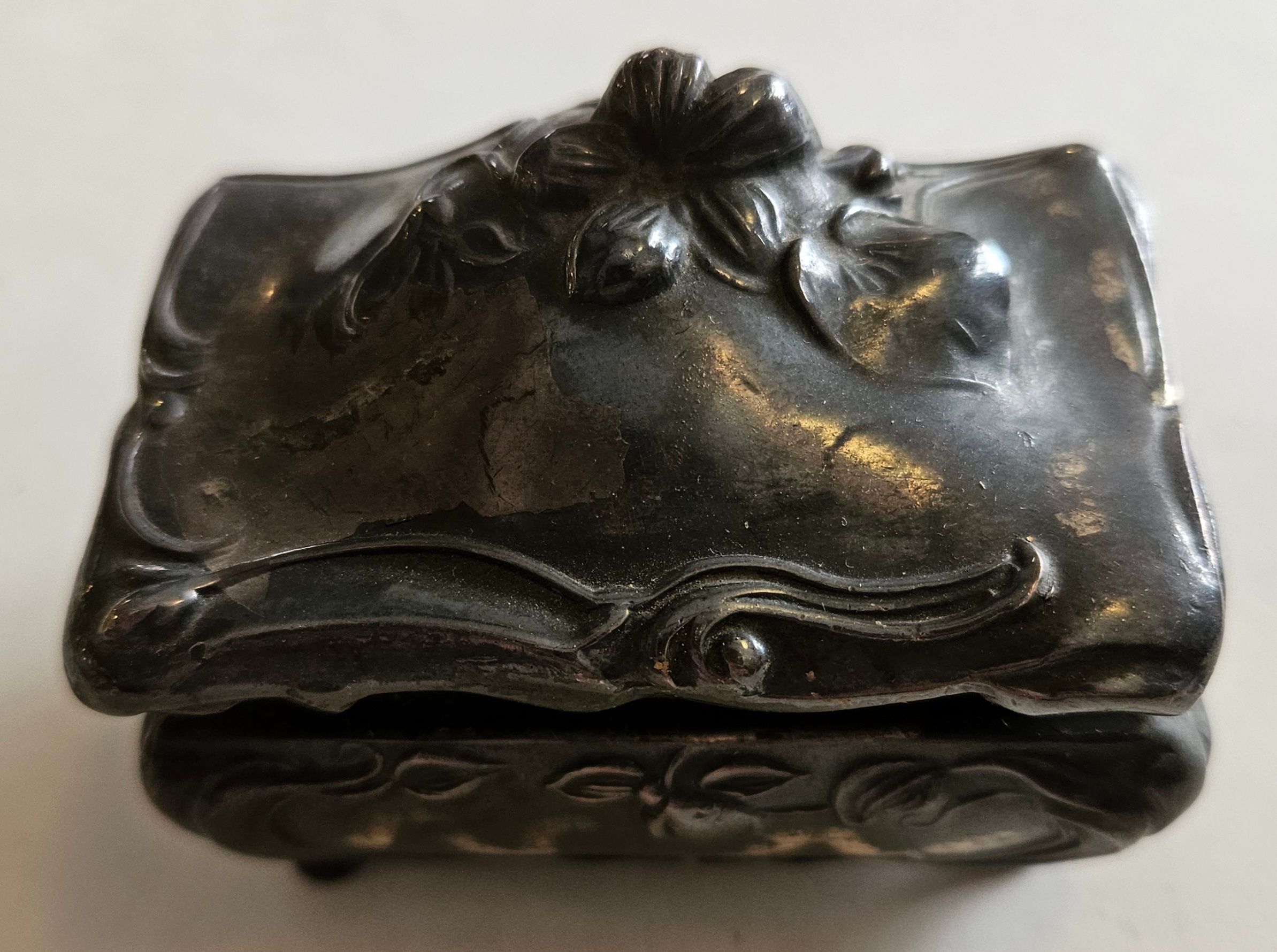 Metal jewelry case or box. An example of Art Nouveau, which flourished from c. 1890 until World War I. Donated with 40 other, similar metal jewelry boxes that belonged to the donor's late mother, who collected them. Eight of the jewelry boxes bear the mark JB. JB was the mark of Jennings Brothers of Bridgeport, CT. Edward (1863-1952) and Edwin Jennings founded the American Jewelry Company in Bridgeport in 1888. In 1890 they changed the name to Jennings Brothers. The company continued to manufacture fine metal items cast from molds: clocks, bookends, statues, metal cases, candelabras, and some silver plate. All Jennings Brothers products were labeled JB. In 1905, the company moved from its original small, wooden building to a larger building on Elm Street, a former gun foundry. Jennings Brothers went out of business in 1953. In the 1960s, its molds were sold to a company in Pennsylvania, which continued to use them, although the newer castings are not considered by collectors to be of good quality. Three others are marked B & W (Brainard & Wilson of Danbury, CT, 1909-1922). Two are marked W. B. Manufacturing Co. (Weidlich Brothers of Bridgeport, CT, 1905-1950; co-founder Charles E. Weidlich previously worked at the Wheeler and Wilson sewing machine company, also of Bridgeport). One is marked W & W. The others do not bear any readable manufacturer's marks.Item Type
