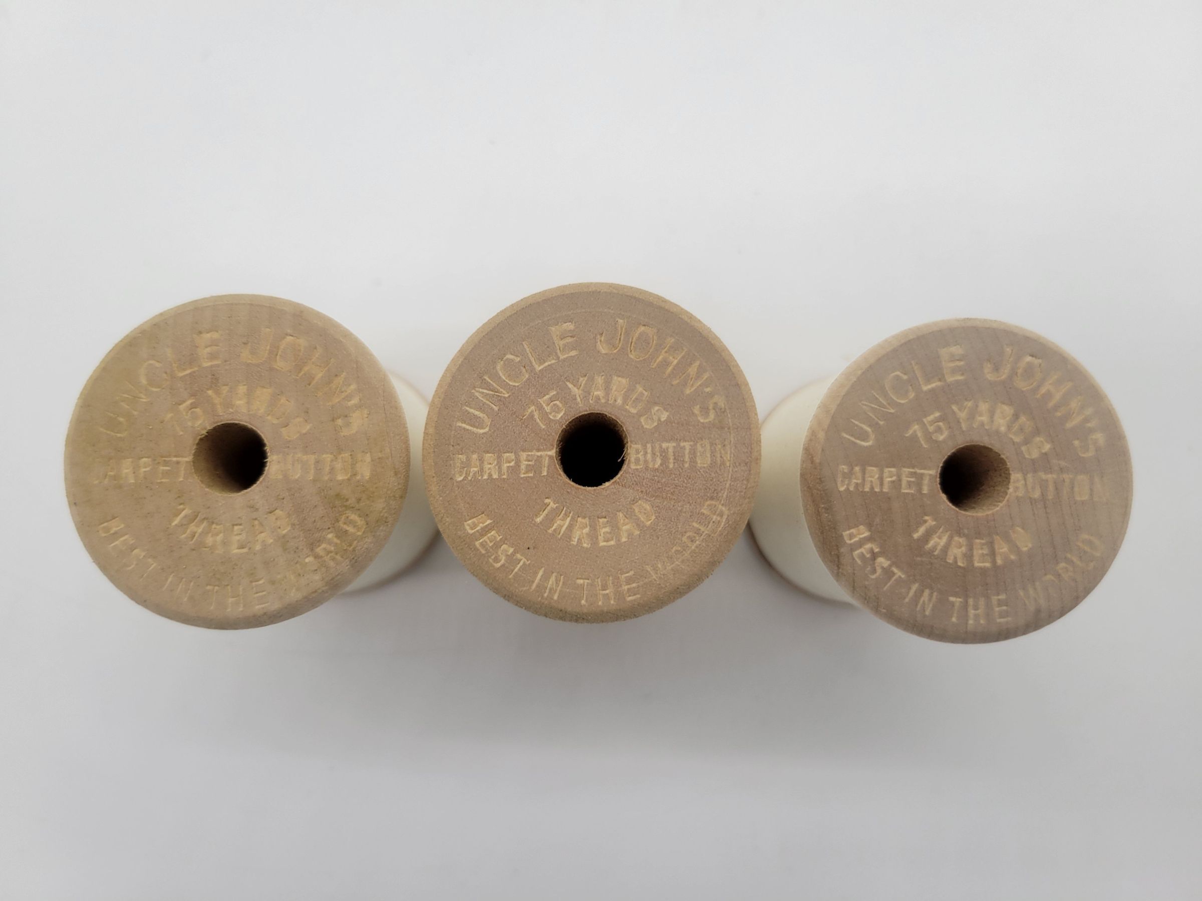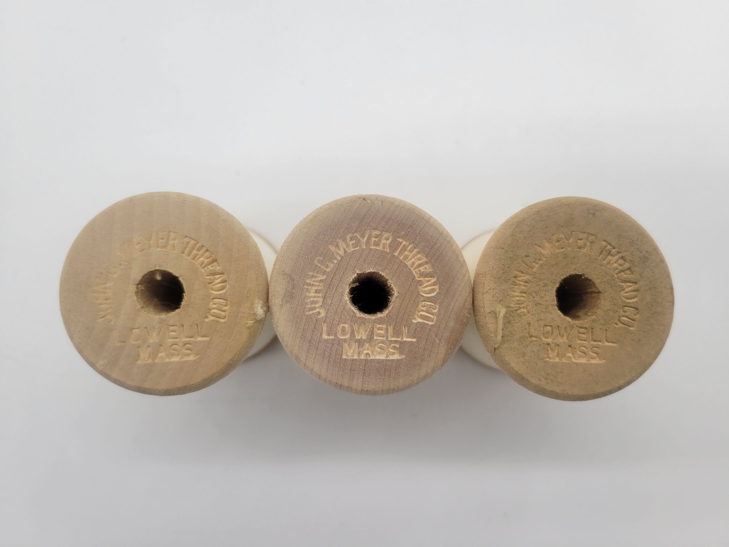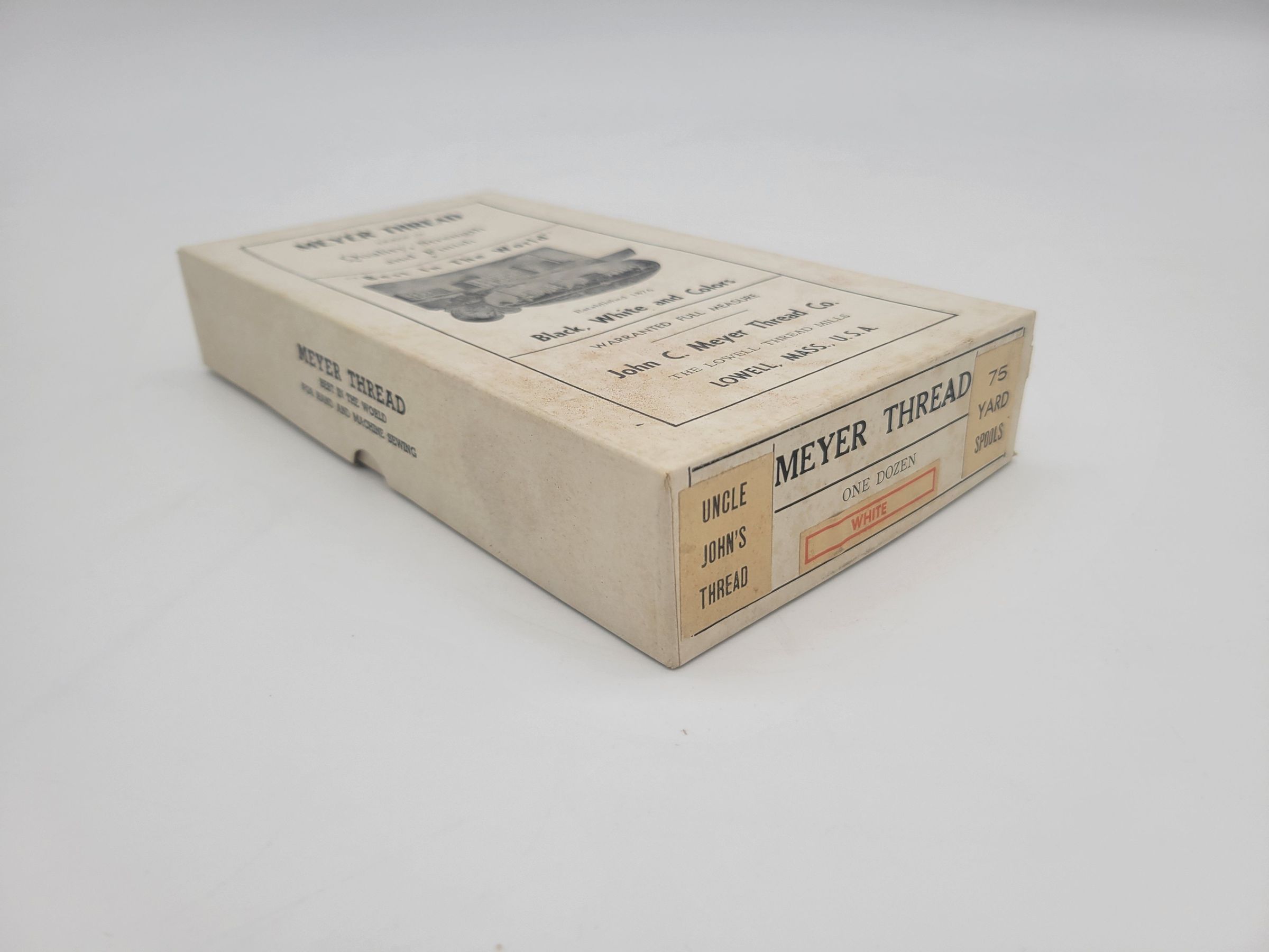 A box of thread from the John C. Meyer Thread Company. The company was founded in 1876 by John C. Meyer in Lowell, MA, though eventually they also operated out of Boston, MA. The company manufactured threads of various kinds, including a silk finish thread widely used in shoe and other leather stitching. The lid of the box reads" Meyer Thread/leads in/Quality, Strength, and Finish" then shows an engraving of the mills in Lowell, MA with the quote "'Best In The World'". The bottom reads "Established 1876/Blac, White, and Colors/Warranted Full Measure/John C. Meyer Thread Co./ The Lowell Thread Mills/Lowell, Mass., U.S.A." The end of the box called this brand "Uncle John's Thread," indicates 75 yards per spool, and one dozen spools per box, though this box only contains three spools. The spools are wooden and "John C. Meyer Thread Co. Lowell, Mass." on one end and "Uncle Johns/75 yards/carpet/button/best in the world" on the other. The box and spools are a little stained but otherwise in good condition.Collection
