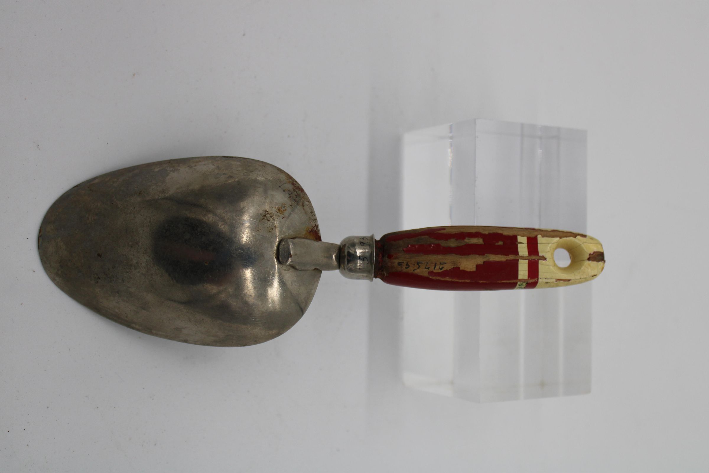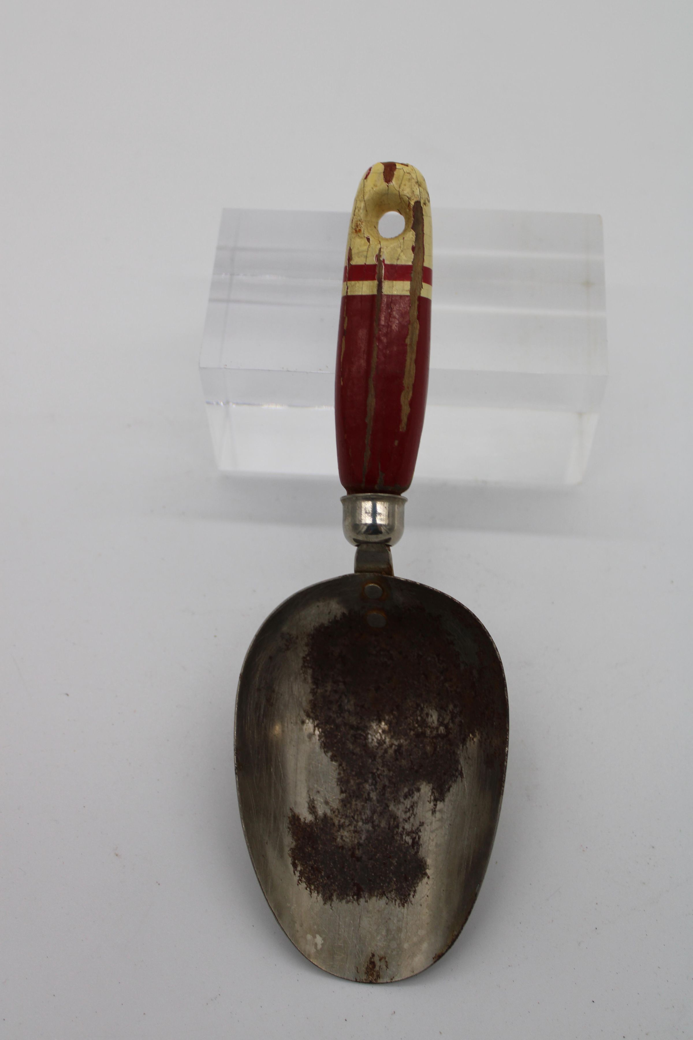 A rusted metal kitchen scoop with a painted red and yellow wooden handle. Likely would have been used for coffee, sugar, and grain.Location