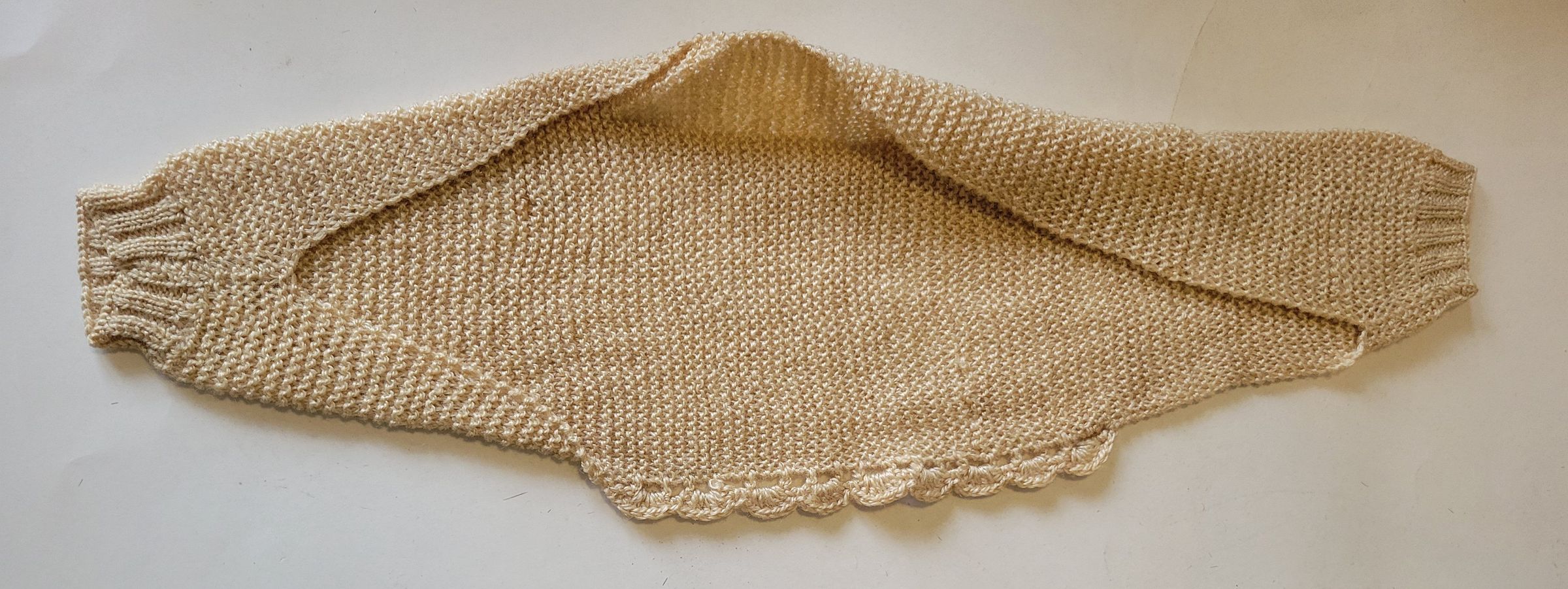 A tan knitted bolero style wrap for an infant.Collection