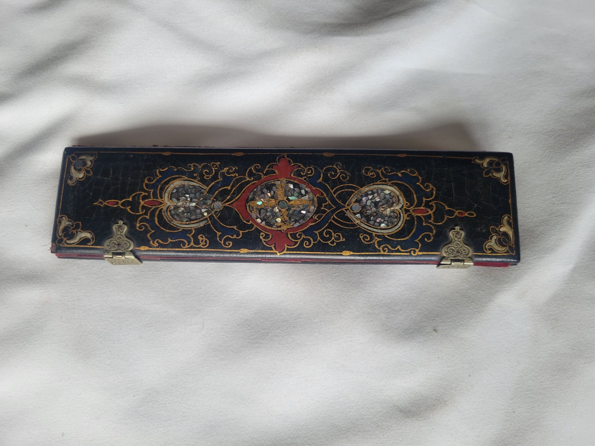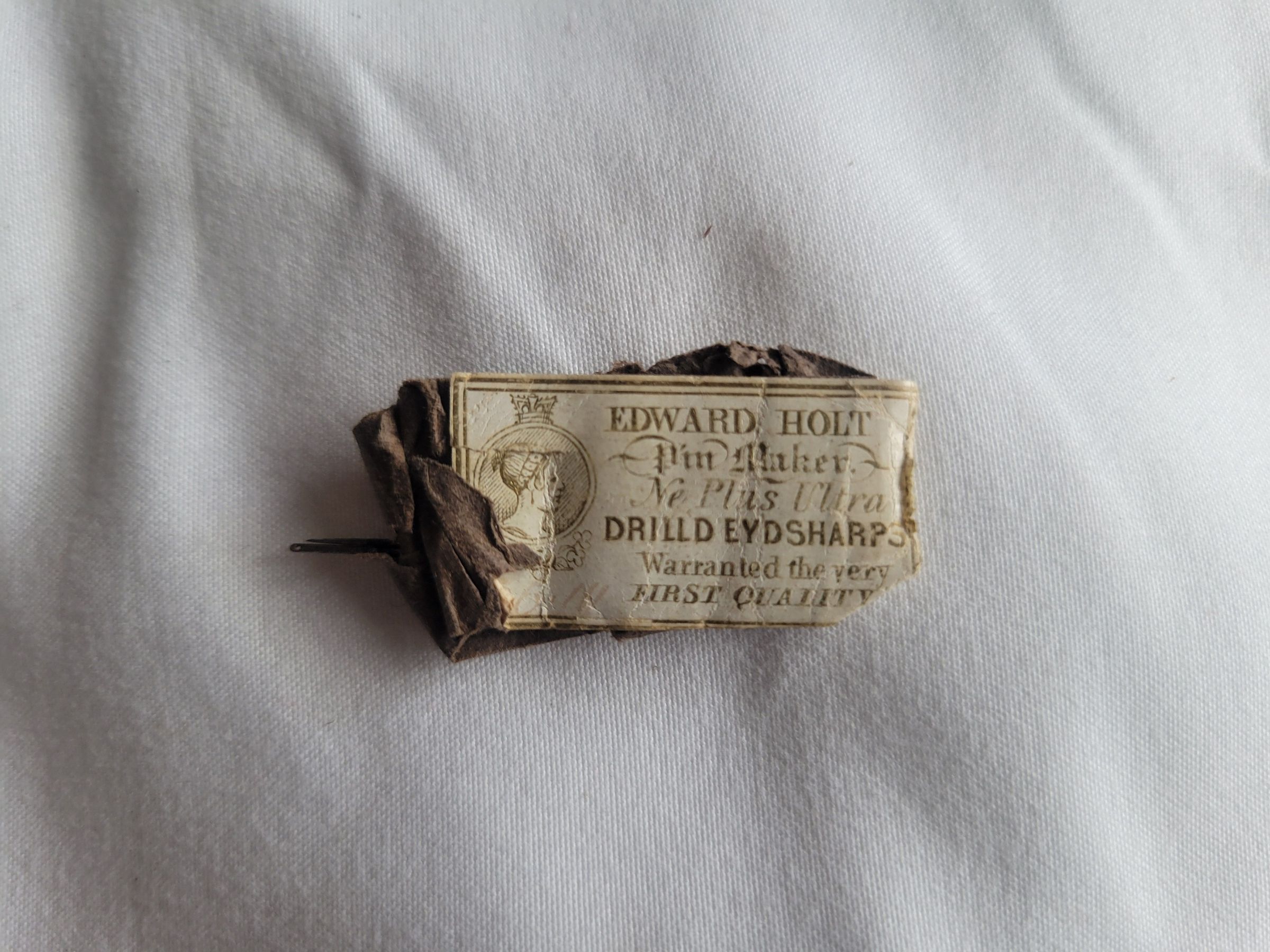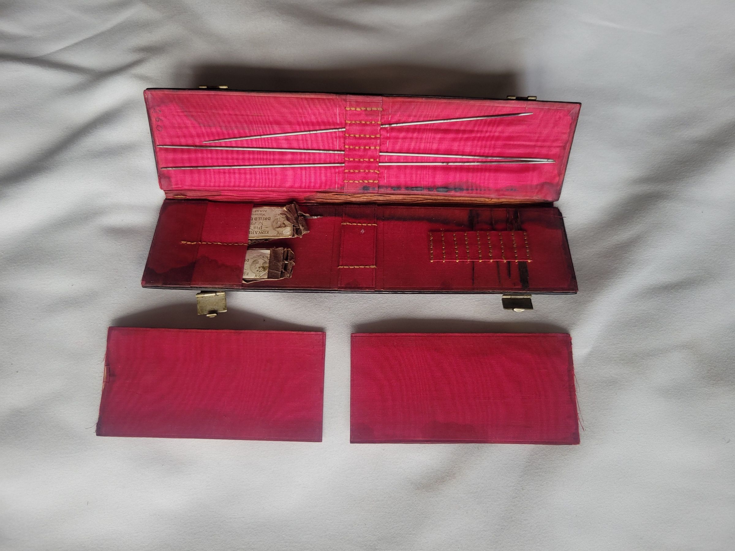 Wooden case with a leather hinge, painted and inlaid with mother of pearl chips. There are two metal clasps to hold the case shut. The inside is lined with red fabric, with slots sewn in meant to hold knitting needles on one side and sewing needles and pins on the other. Between the two sides are two stiff fabric covered panels which keep the sides from touching. In addition to three steel knitting needles and an assortment of bare sewing needles, the kit includes two packs of Edward Holt sewing needles. They are wrapped in brown paper with intact labels which read "EDWARD HOLT/ Pin Maker/ Ne Plus Ultra/ Drilld Eydsharps/ Warranted the very/ FIRST QUALITY." The label also includes the rough portrait of a woman with a crown on top of the border around her.Collection