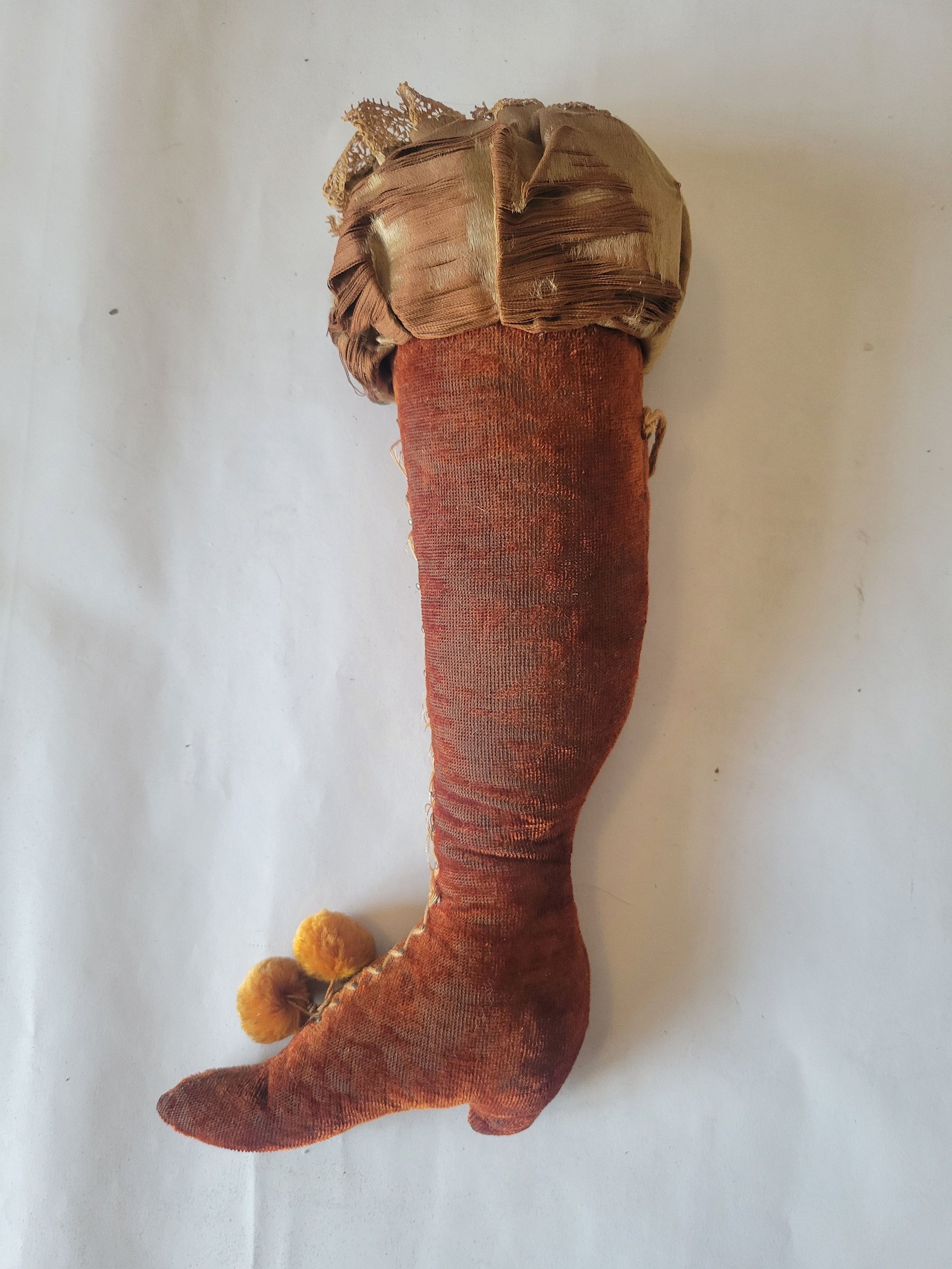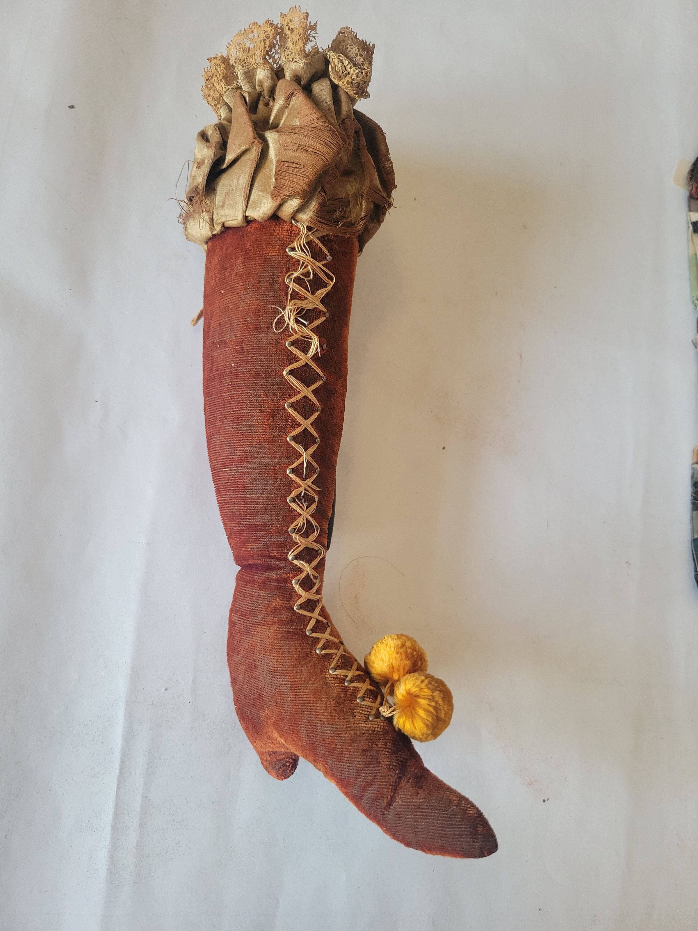 A pincushion in the shape of a ladies' boot, made from orange velvet and other fabric. The top is open, revealing the inner cotton stuffing, and the soft texture of the velvet is largely rubbed off and actively falling away. The laces are made of several strands of thread with pins holding them in place.Use