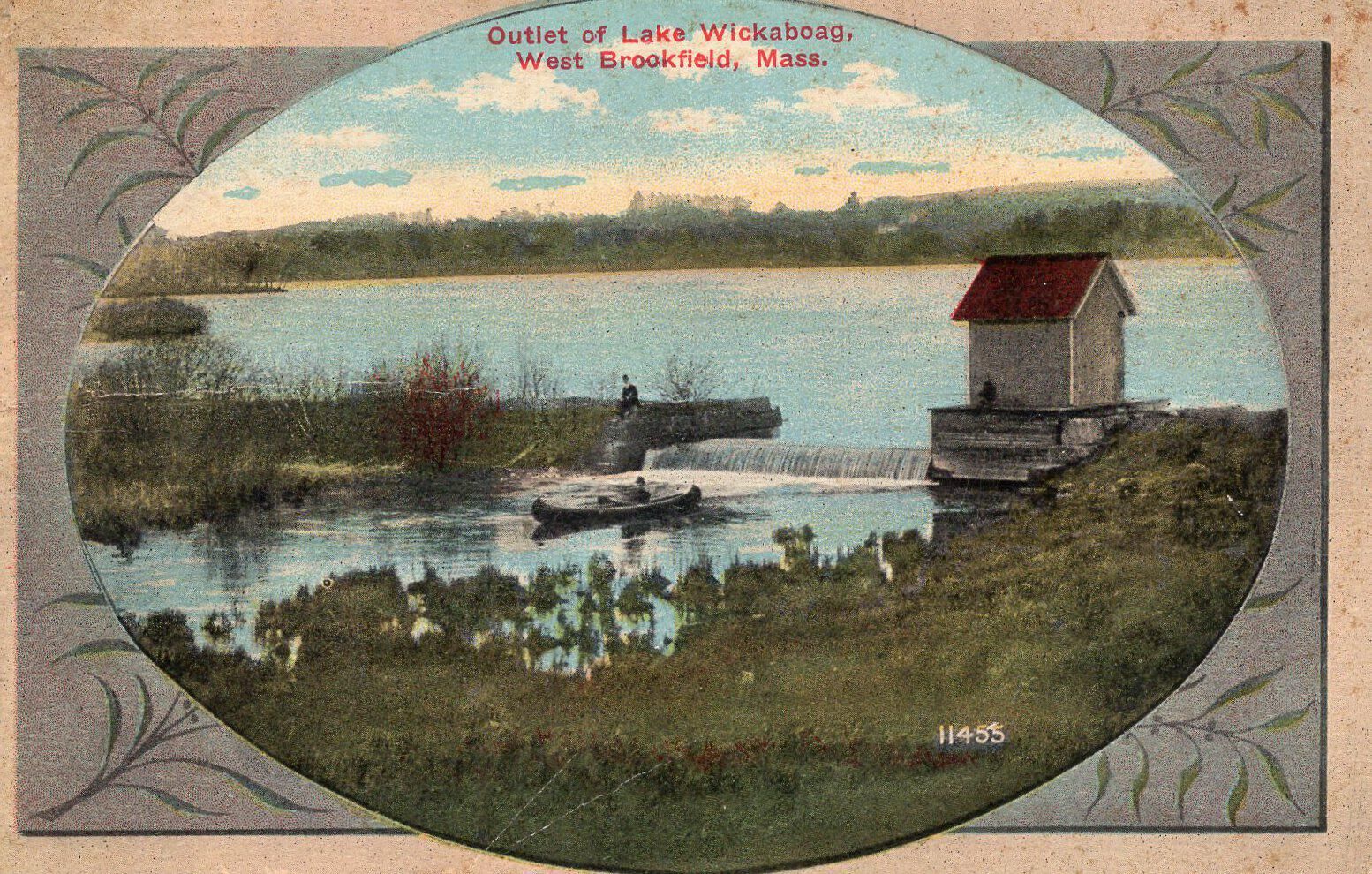 A postcard of the outlet of Lake Wickaboag in West Brookfield, Mass.Condition