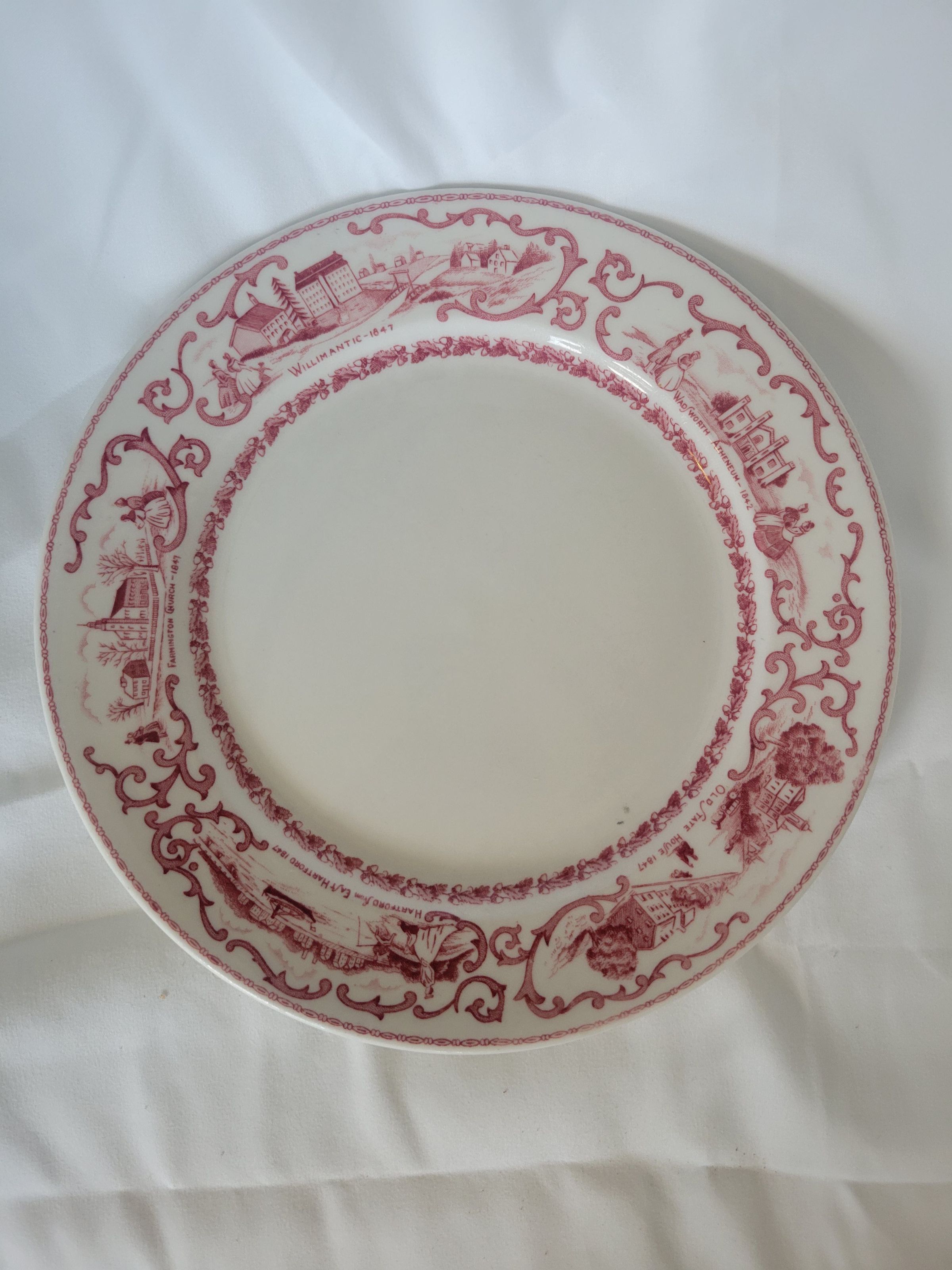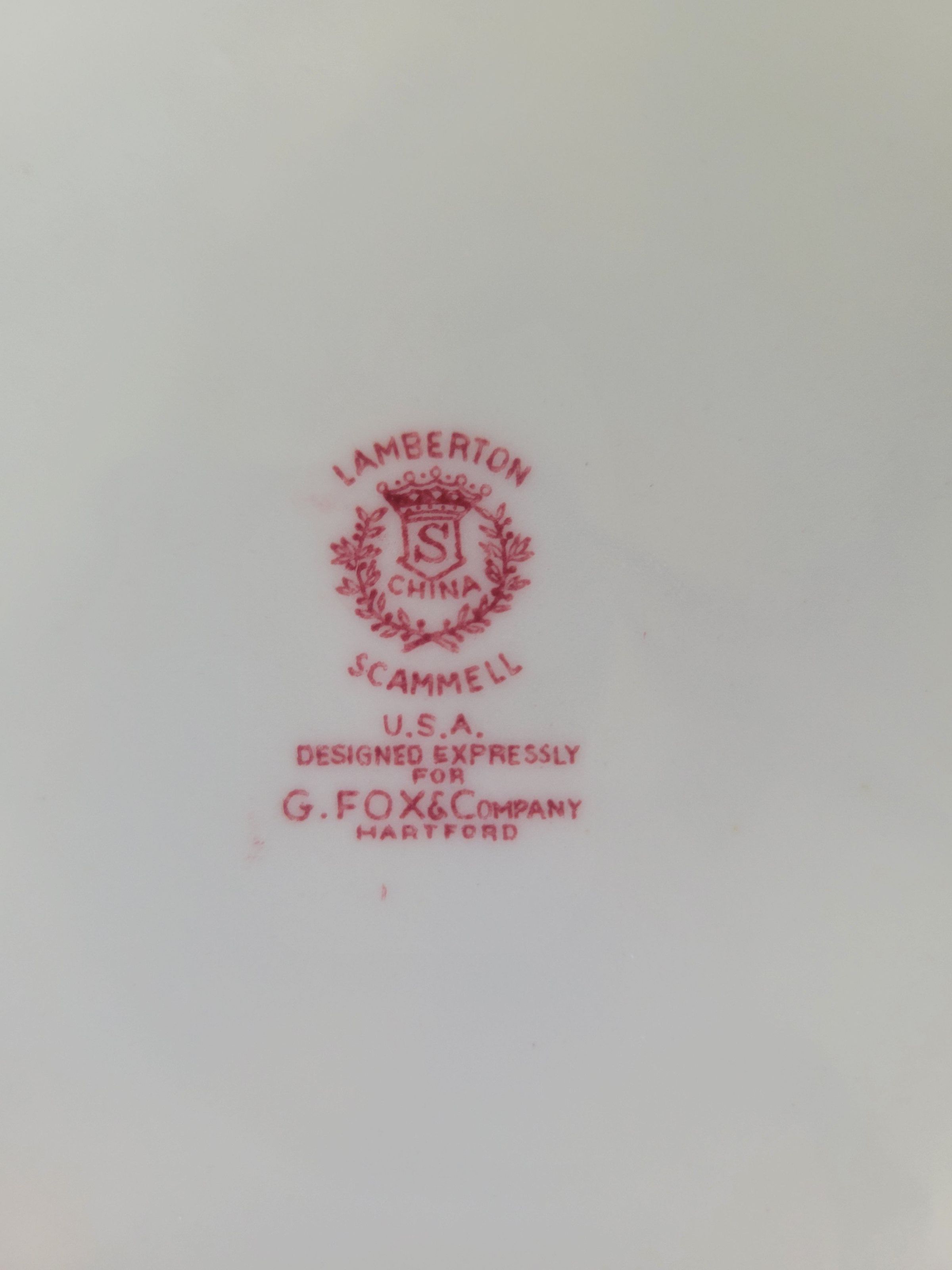This Lamberton Scammell plate was commissioned by G. Fox & Co., a very large department store in Hartford, CT, around the 1930s. This exclusive scrollwork pattern was featured on a number of dinnerware items including plates, creamers, and salt and pepper shakers. The rim features illustrations of Hartford and surrounding areas around the time of the store's opening in 1847, while the inner ring shows the leaves and acorns of Connecticut's Charter Oak.Collection