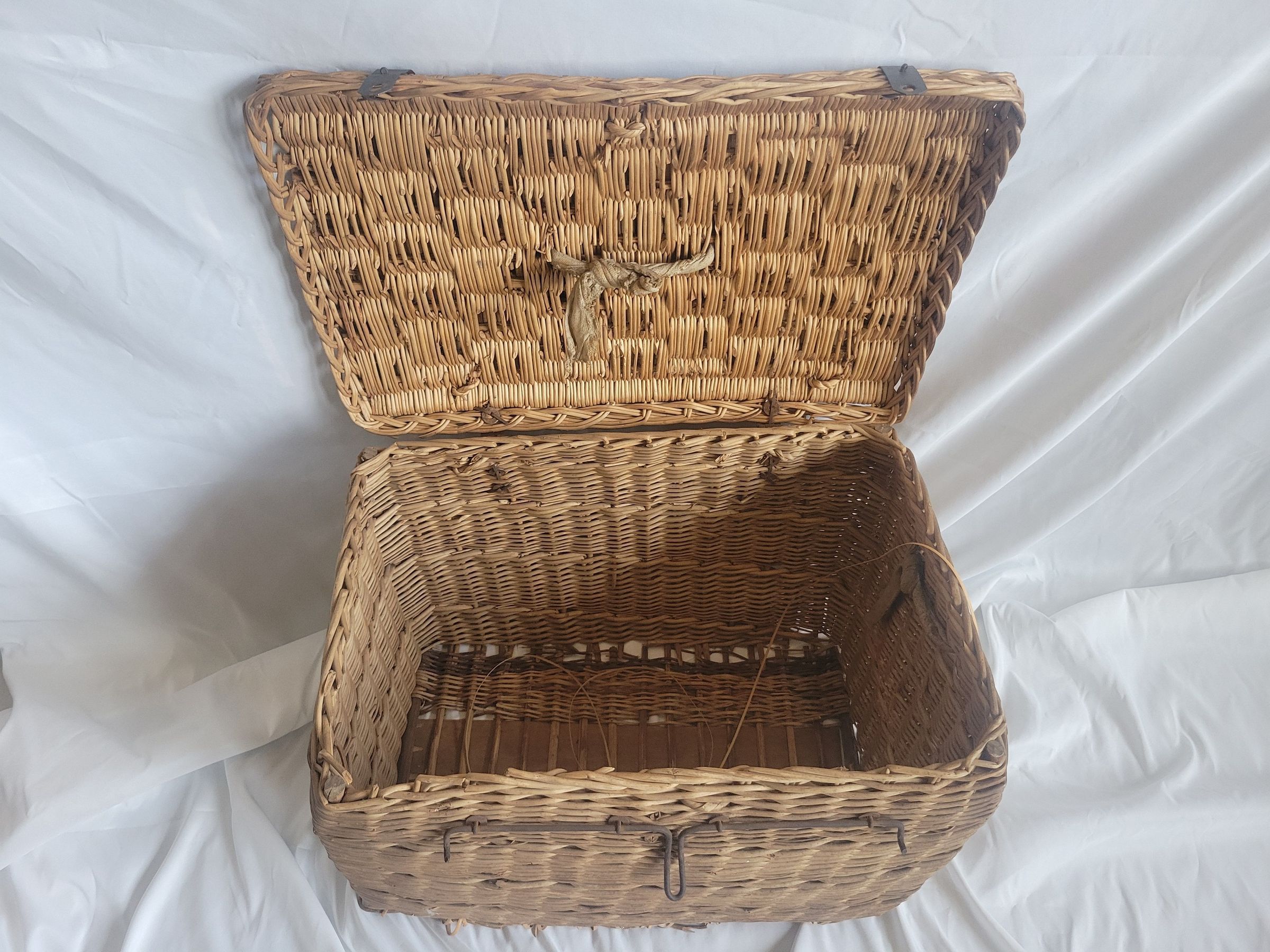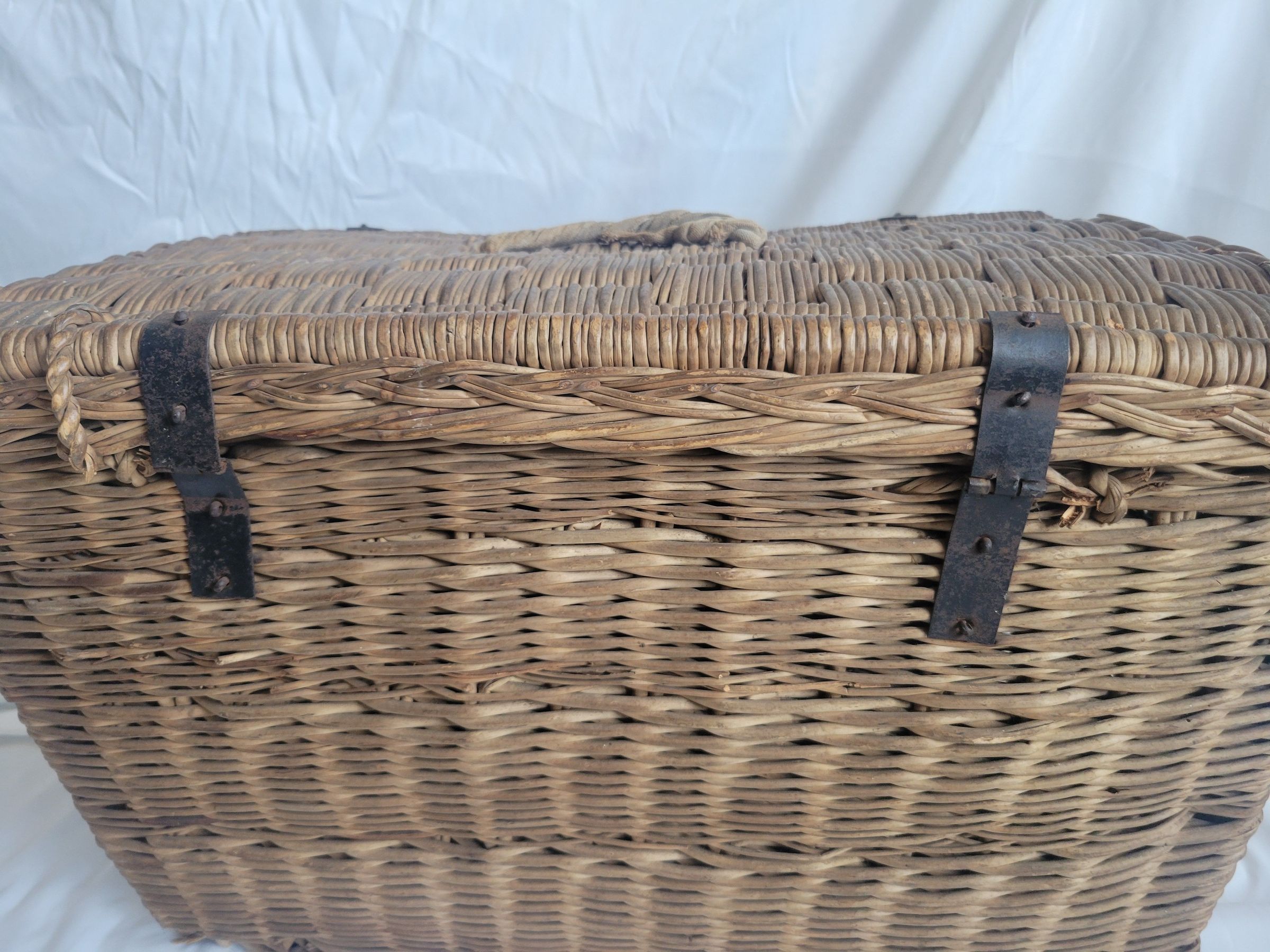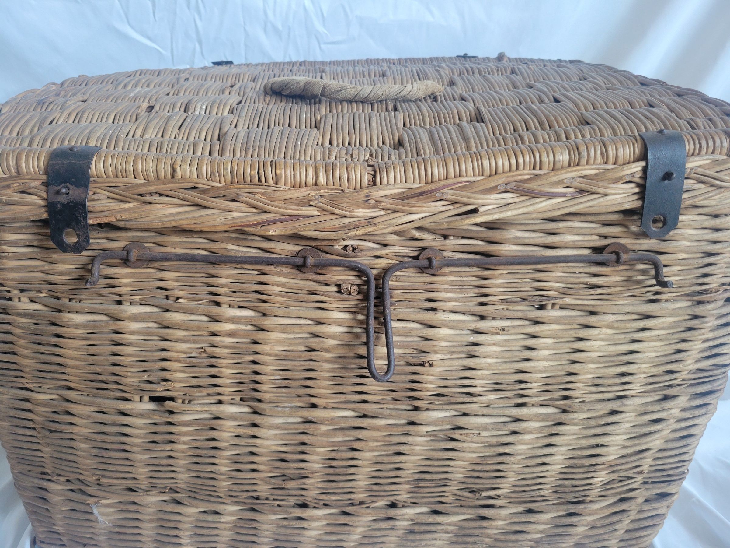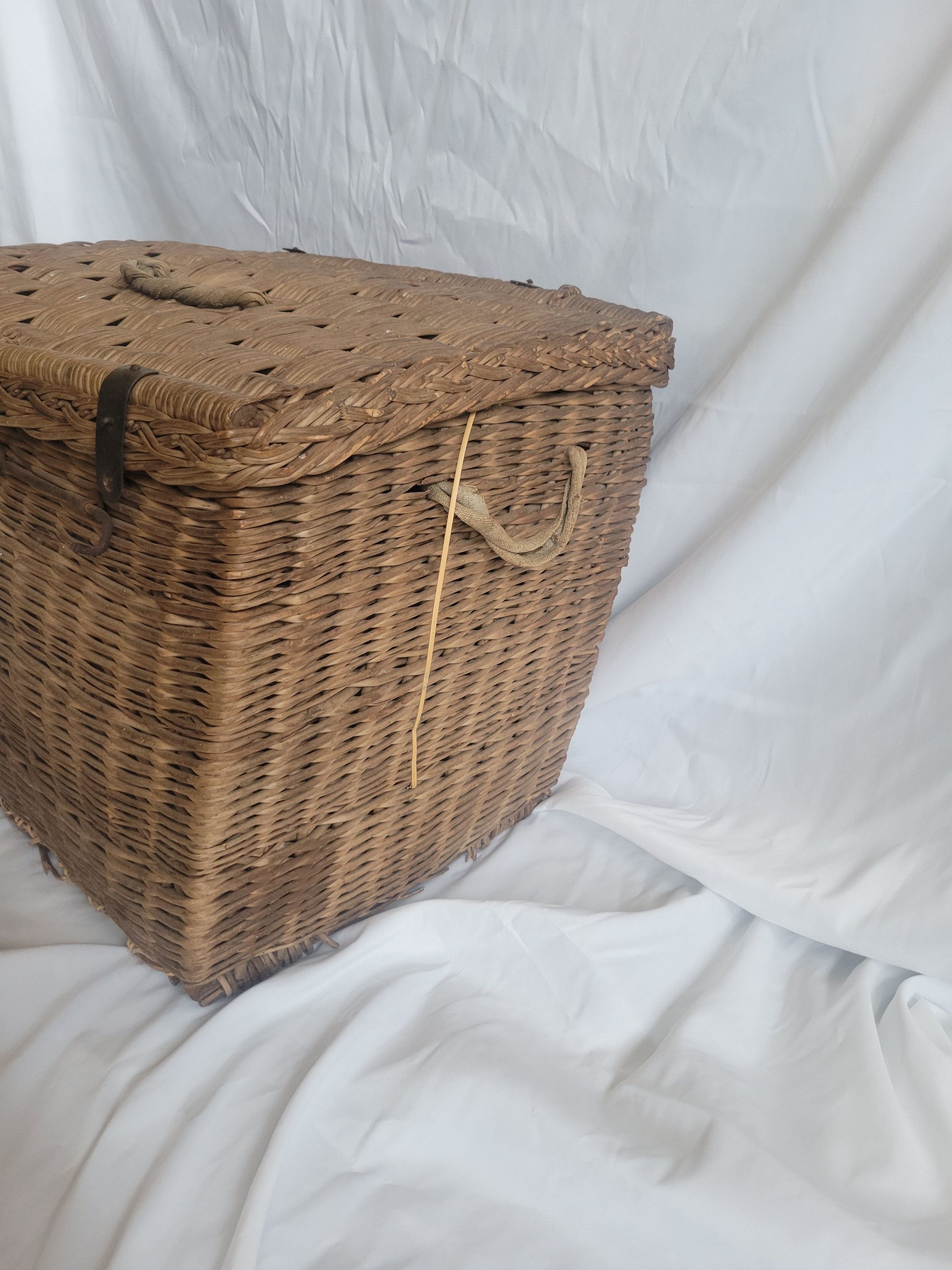 A large woven basket with metal hinges and closure. The handles at the top and right side of the basket are made from twisted fabric, there is no handle on the left side. The bottom of the basket is loosening, with some pieces missing, but the basket is otherwise in good condition.Collection