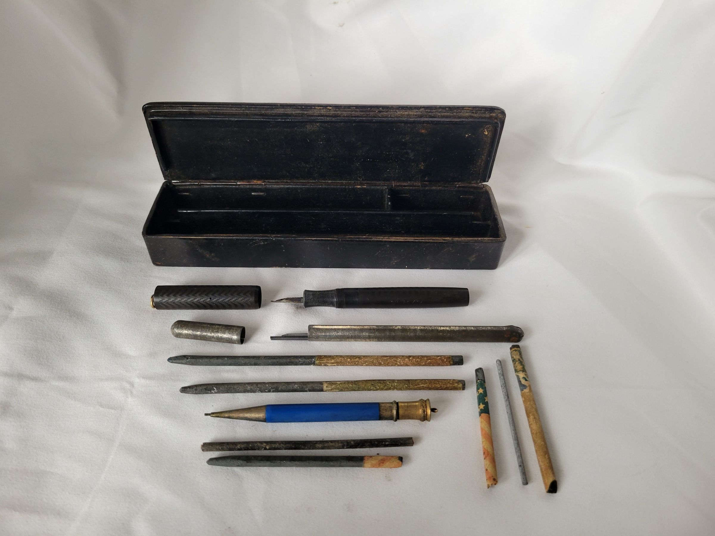 A pencil box with a color illustration of children sitting on a log. Inside are a Servo fountain pen, a mechanical pencil with a container holding extra lead, and several slate pencils. Slate pencils were common in the later 19th century. The ones wrapped in an American flag pattern were manufactured to encourage patriotism, especially in the immigrants who were flooding into the country at the time.Collection