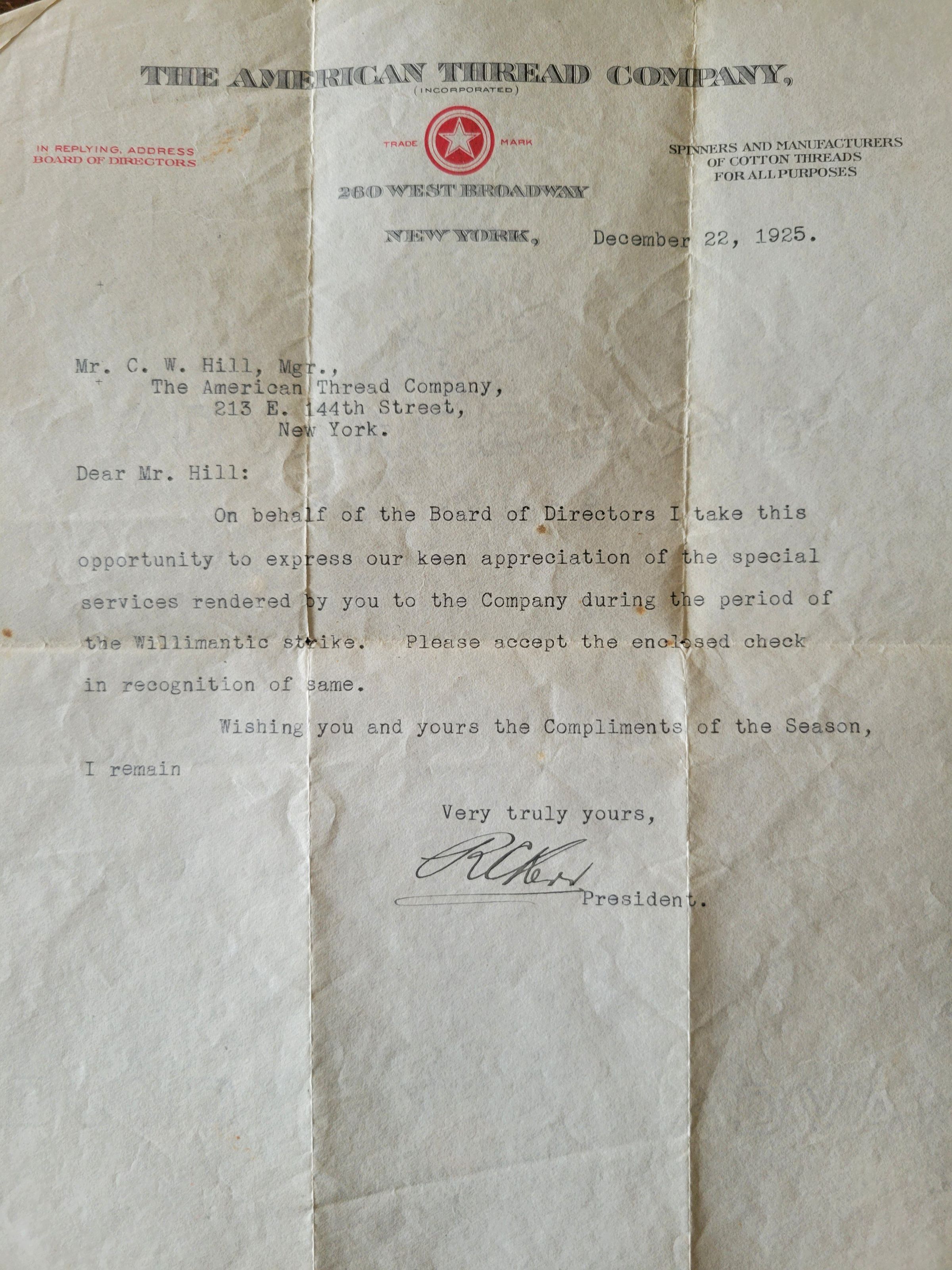 A letter of appreciation from R.C. Kerr, president of the American Thread Company, to Charles W. Hill for "special services rendered" during the workers' strike of the Willimantic plant. The letter mentions an enclosed check. Dated December 22, 1925. Typewritten on onionskin paper, creased from being folded in half and then in thirds.Subject Place