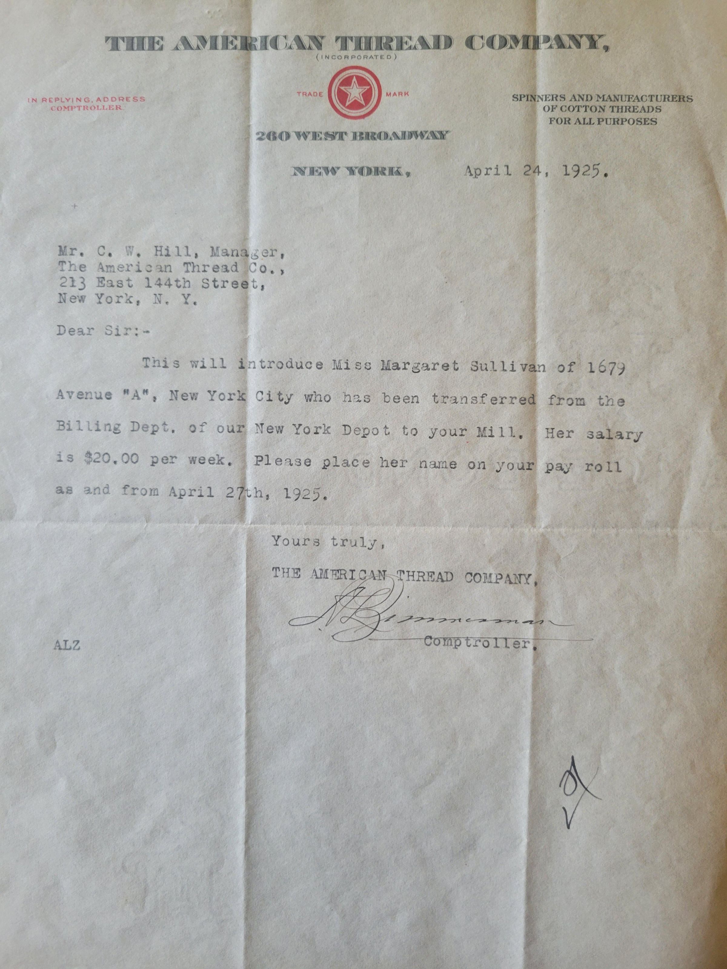 A letter to Charles W. Hill, manager of the American Thread Company mill in NY from company comptroller A.L. Zimmerman. The letter is to let Hill known that a new employee, Margaret Sullivan, will be joining his workforce, it is dates April 24, 1925. The letter is typewritten on onionskin letterhead, folded in half and then in thirds. The watermark on the paper includes a coat of arms featuring the letter "B" and "Advance Bond." On the bottom right third of the paper there is what may be an initial and a check mark, both written in pen.Collection