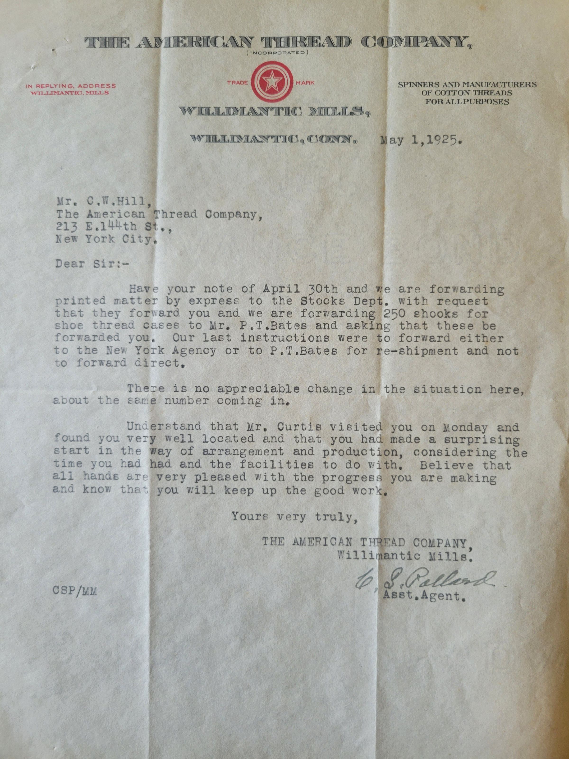 A letter to Charles W. Hill from an Assistant Agent of the American Thread Company in Willimantic. The letter mentions "Mr. Curtis," likely Don Curtis, plant manager in Willimantic, seeing Hill's success in setting up operations in a sister facility in NY where the letter was sent. Letter is dated May 1, 1925. This comes very shortly after the union workers of the Willimantic plant voted to strike (March 5, 1925). The letter is typewritten on onionskin letterhead, folded in half and then in thirds. It has a staple mark in the upper left corner. The watermark on the paper includes a coat of arms featuring the letter "B" and "Advance Bond"Collection