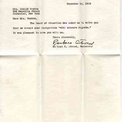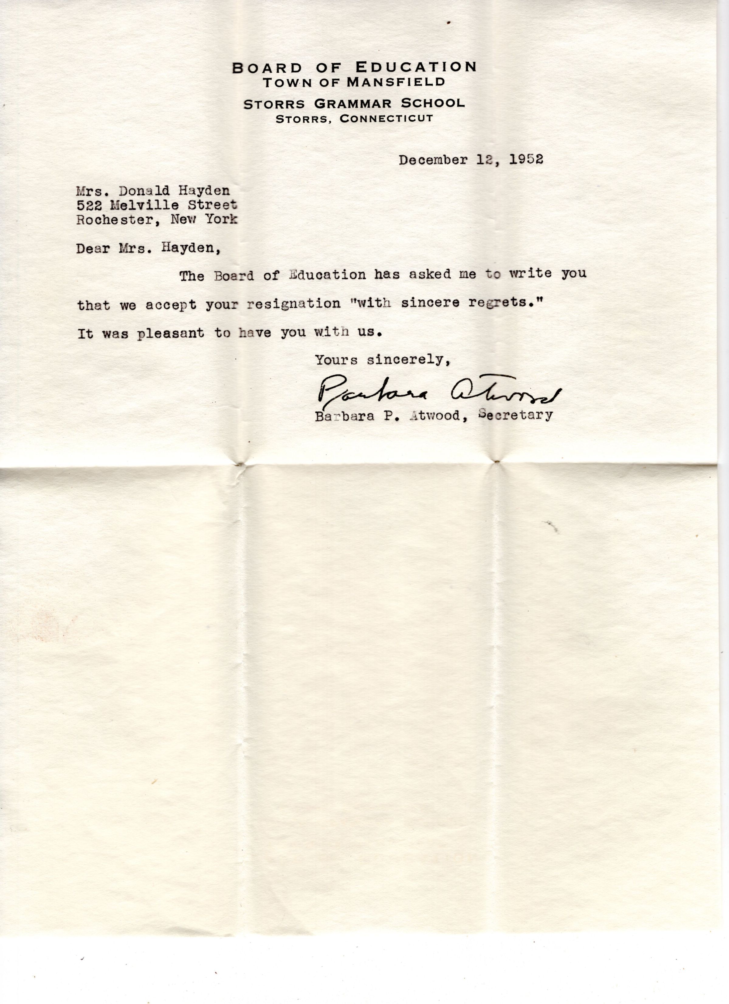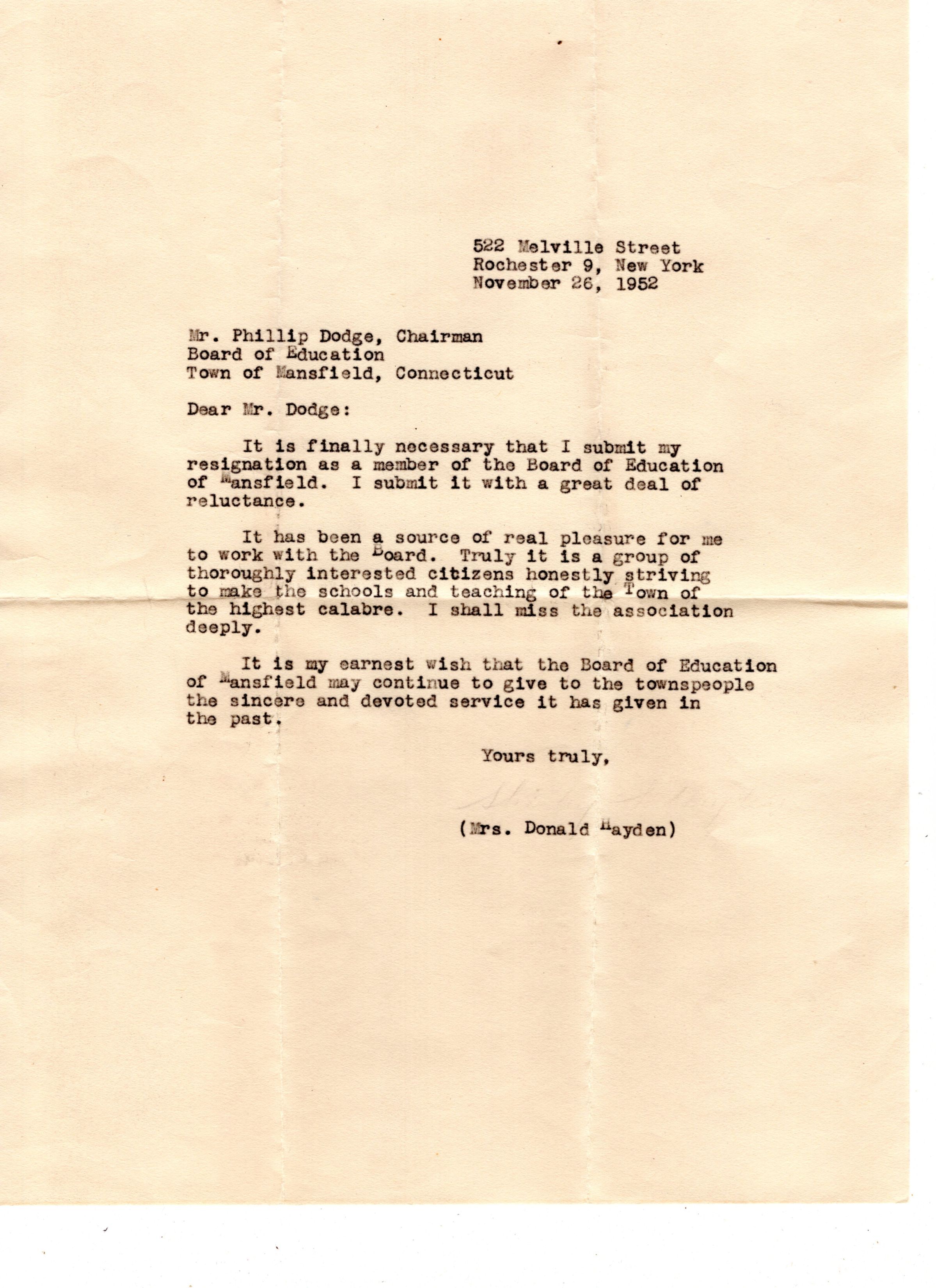 A copy of the letter sent by Mrs. Donald Hayden to the Mansfield, CT Board of Education in regards to her resignation from the board; as well as the reply sent from Mr. Phillip Dodge, Chairman of the Board of Education. Also included is the stamped envelope in which the reply came. The letters are yellowed but otherwise in excellent condition, the envelope is torn across the top.Location