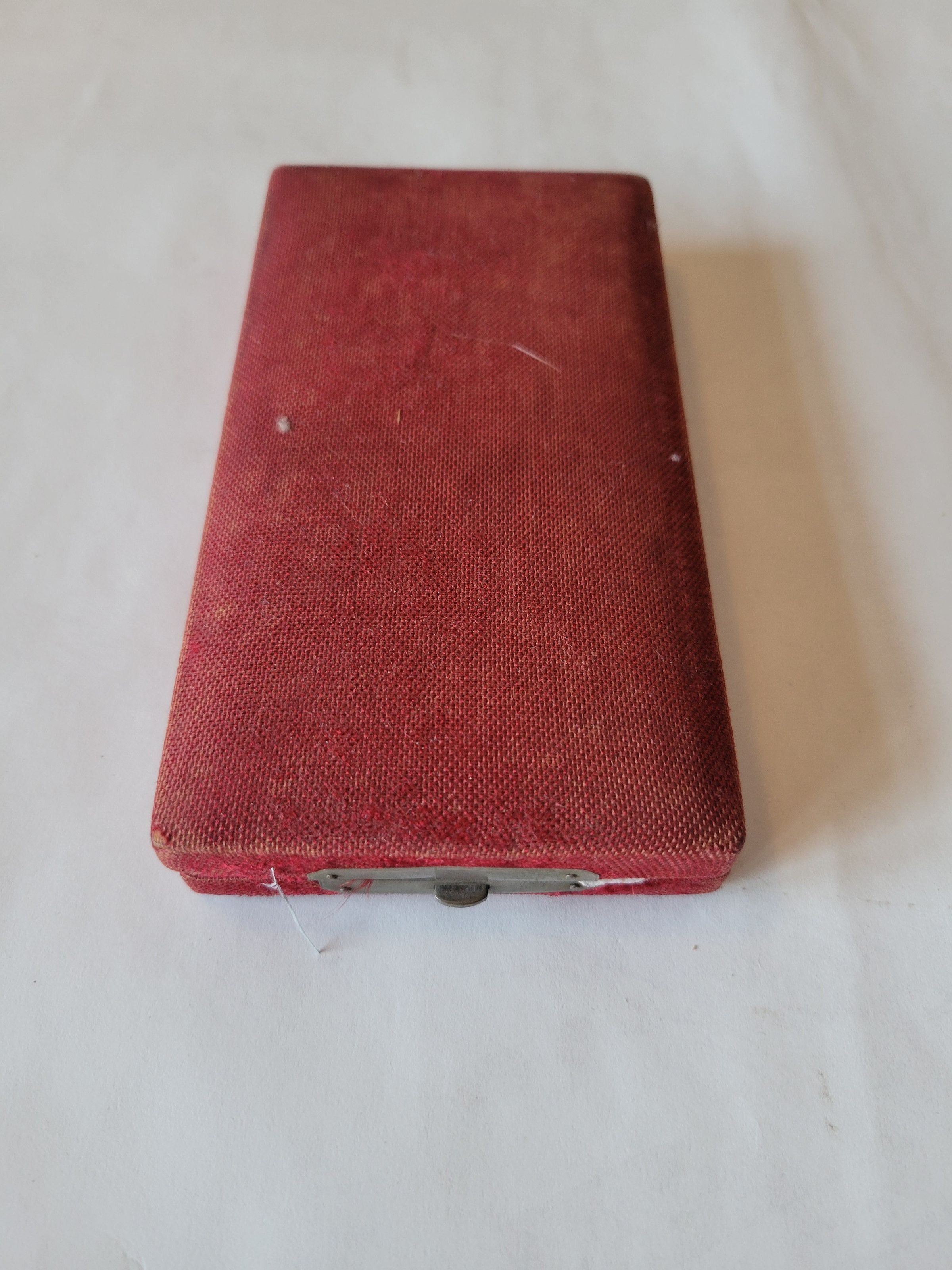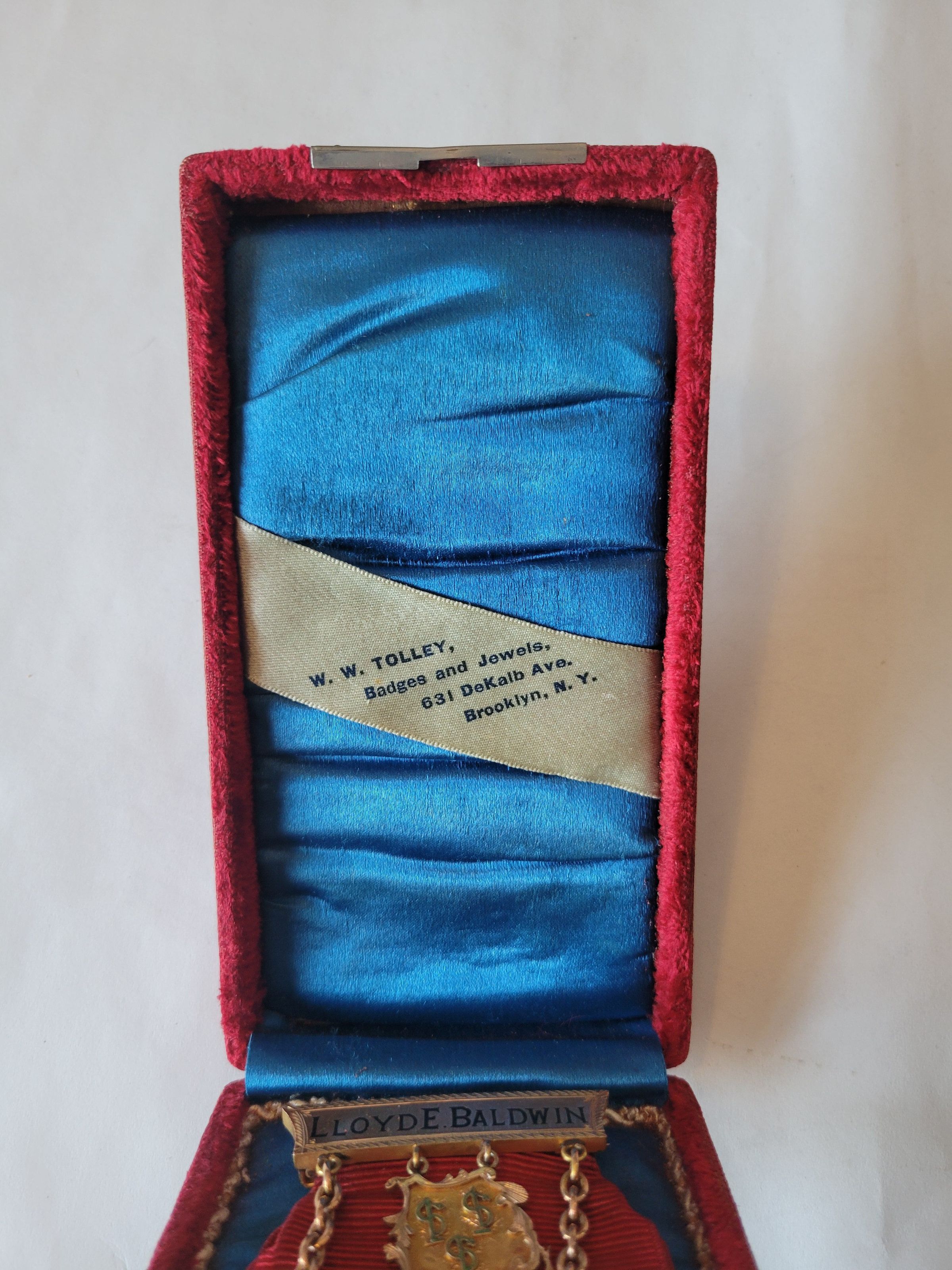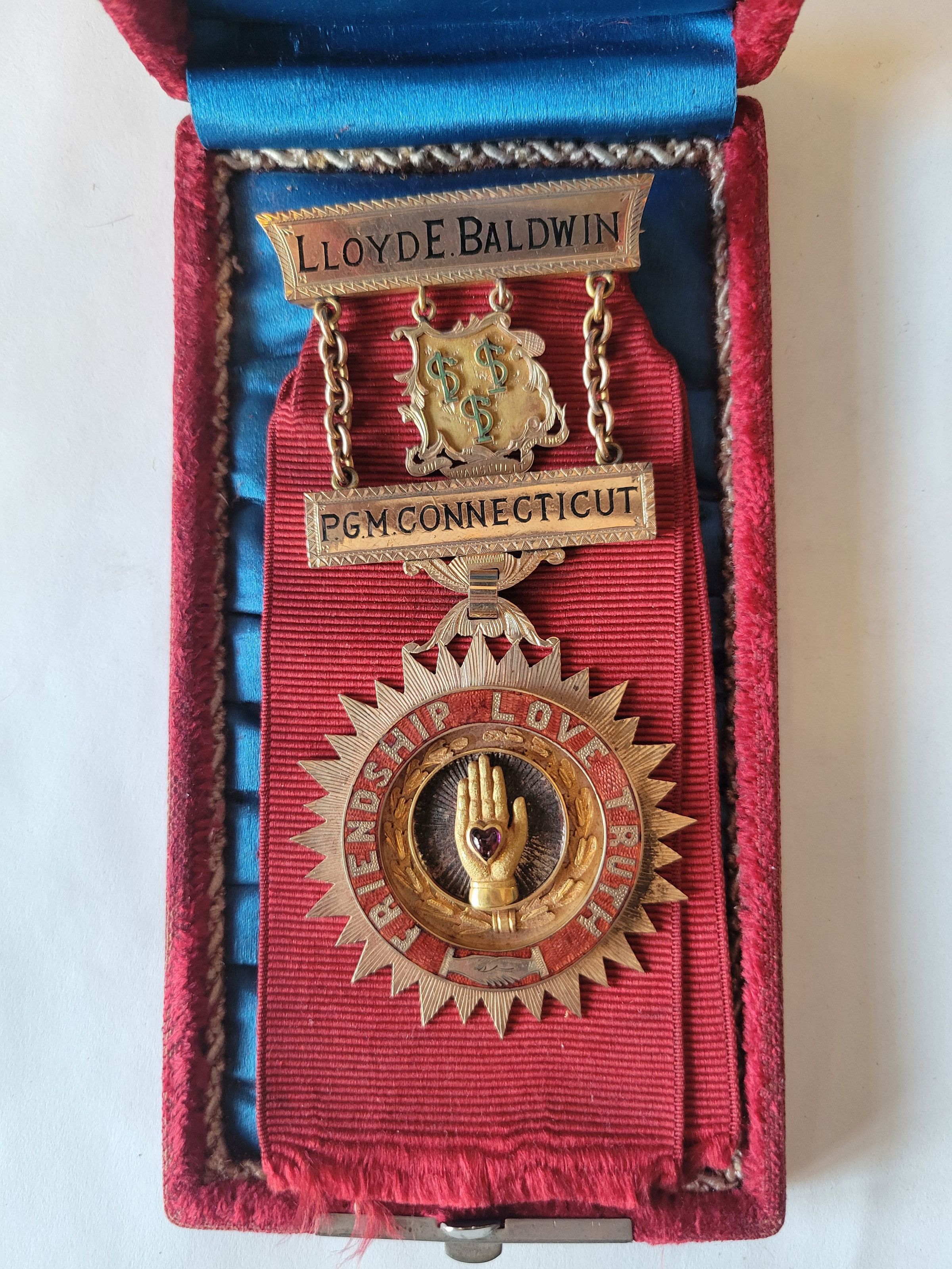 A badge commemorating Lloyd E. Baldwin of Willimantic, born 1810, as Past Grand Master (P.G.M.) of the Independent order of Odd Fellows. Baldwin was, among other things, a builder and contractor, known for his sketches of Willimantic as it was in the year 1850. The Independent Order of Odd Fellows is a fraternal organization based on the tenets of Friendship, Love, and Truth. The badge itself is pinned in a faded red cloth covered box with a metal clasp. The inside of the case is blue satin, labeled on the inside lid with a ribbon indicating the maker, W.W. Tolley Badges and Jewels of 631 DeKalb Ave, Brooklyn, NY.