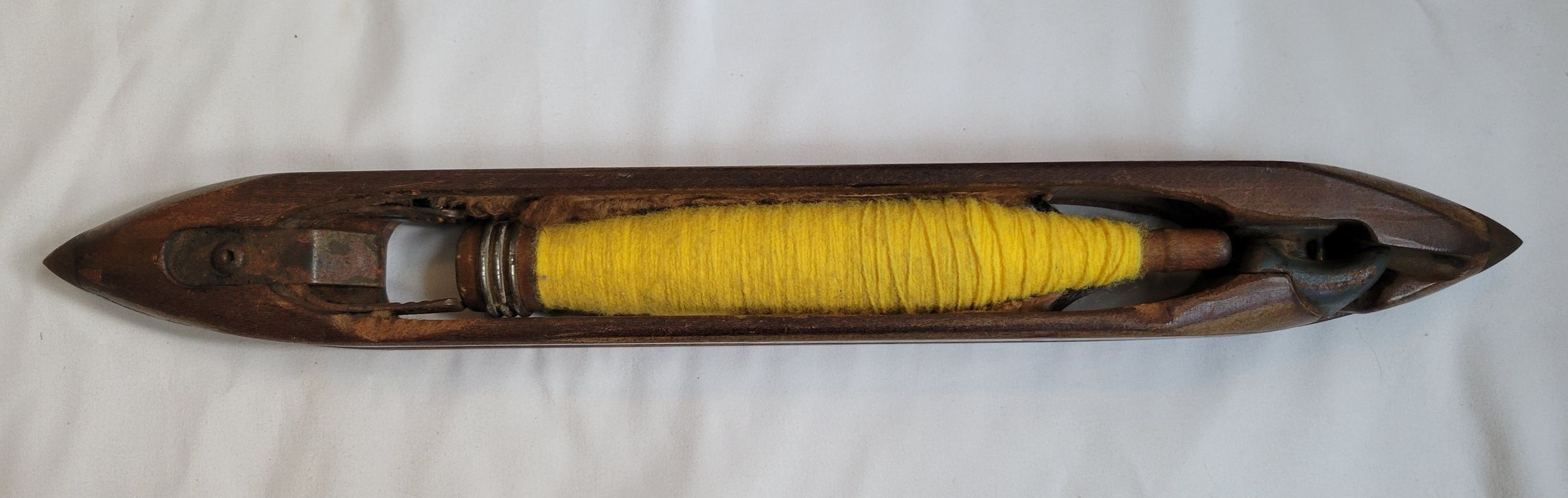 A shuttle that would have been used on a large industrial loom. The shuttle itself measures approximately 12 inches and holds a bright yellow thread. In weaving, the shuttle carries the weft thread from one side of the work to the other.Collection