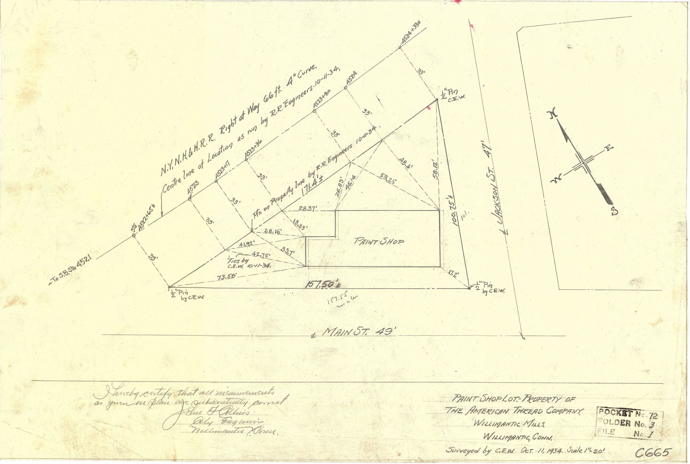 Lot map showing the ATCO Paint Shop and lot, corner of Main and Jackson Streets, also bordered by right of way of New York, New Haven, & Hartford Rail Road. American Thread Company, Willimantic Mills, Willimantic, CT. Scale: 1 in. = 20 ft. Gives dimensions of streets. Surveyed by C.E.W., an ATCO engineer, and certified correct by Willimantic City Engineer John F. Collins.Collection