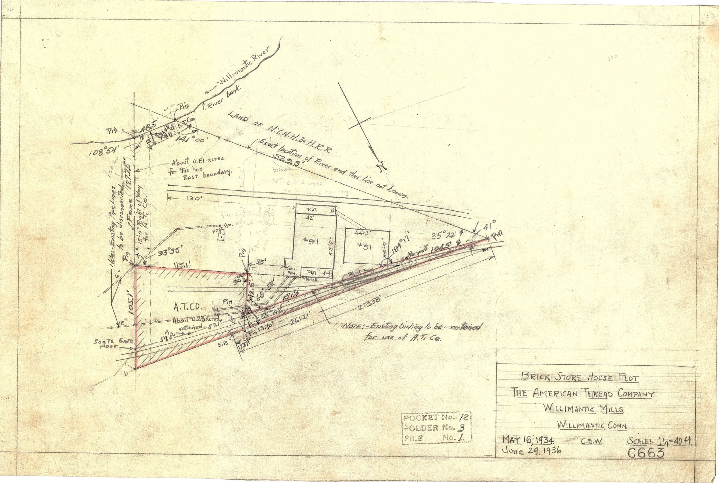 Lot map of Brick Store House plot, American Thread Company, Willimantic Mills, Willimantic, CT. Scale: 1 in. = 40 ft.