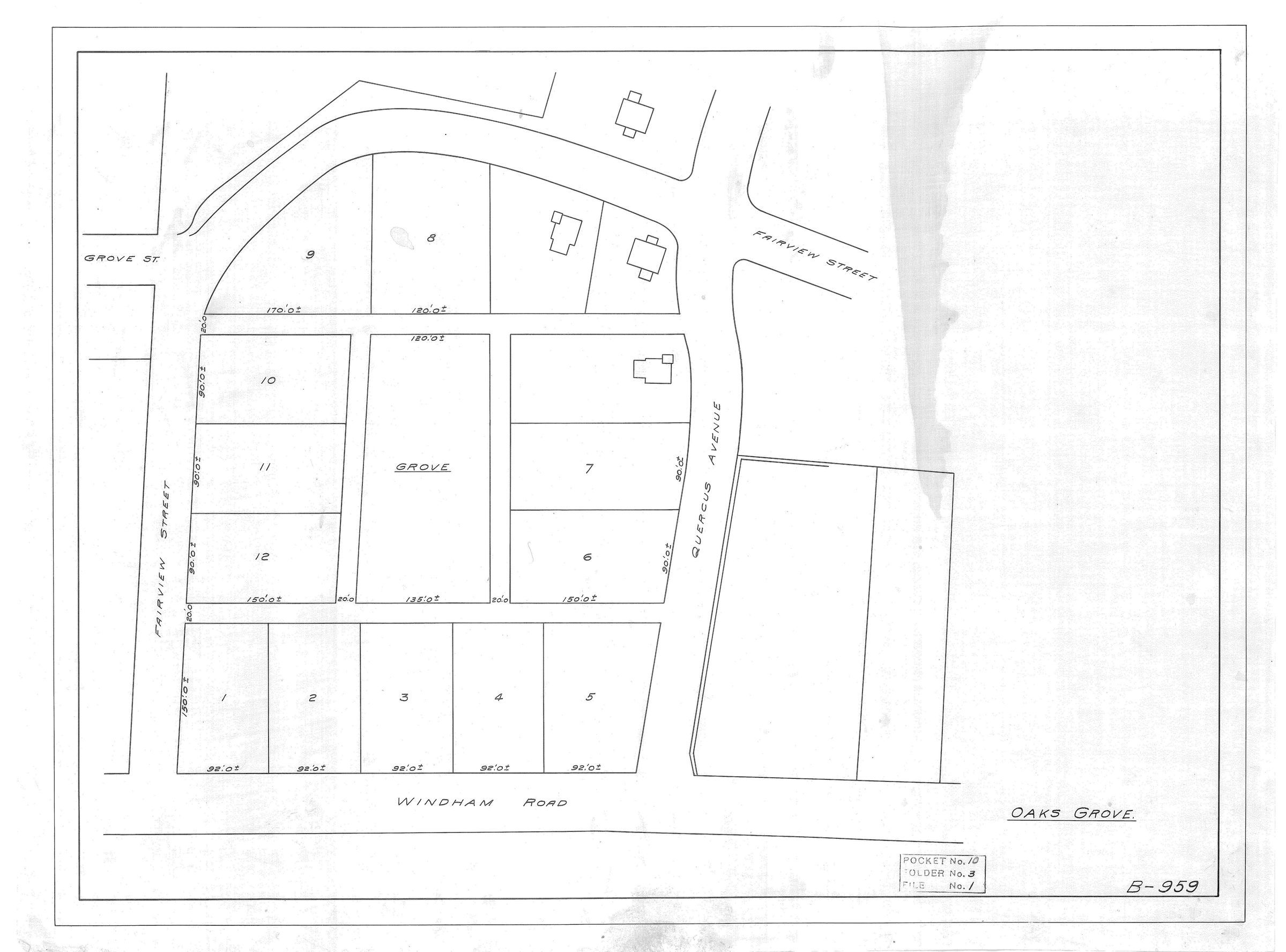 Lot map of Oaks Grove, showing parts of Windham Road, Fairview Street, Grove Street, and Quercus Avenue. A middle lot, not bordering any street, is labeled "Grove." Scale not given. This property was developed by the Willimantic Linen Company c. 1880 into a neighborhood of worker cottages, called the Oaks.Collection
