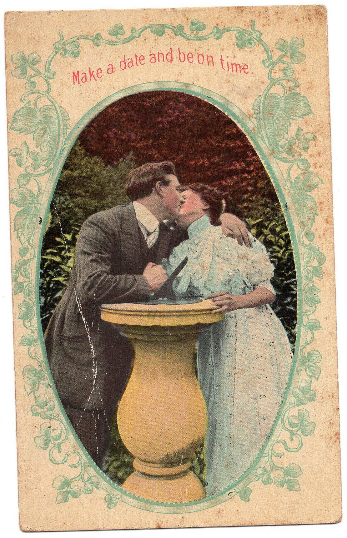 A postcard of a couple with the words Make a Date and be on Time printed on it.Condition