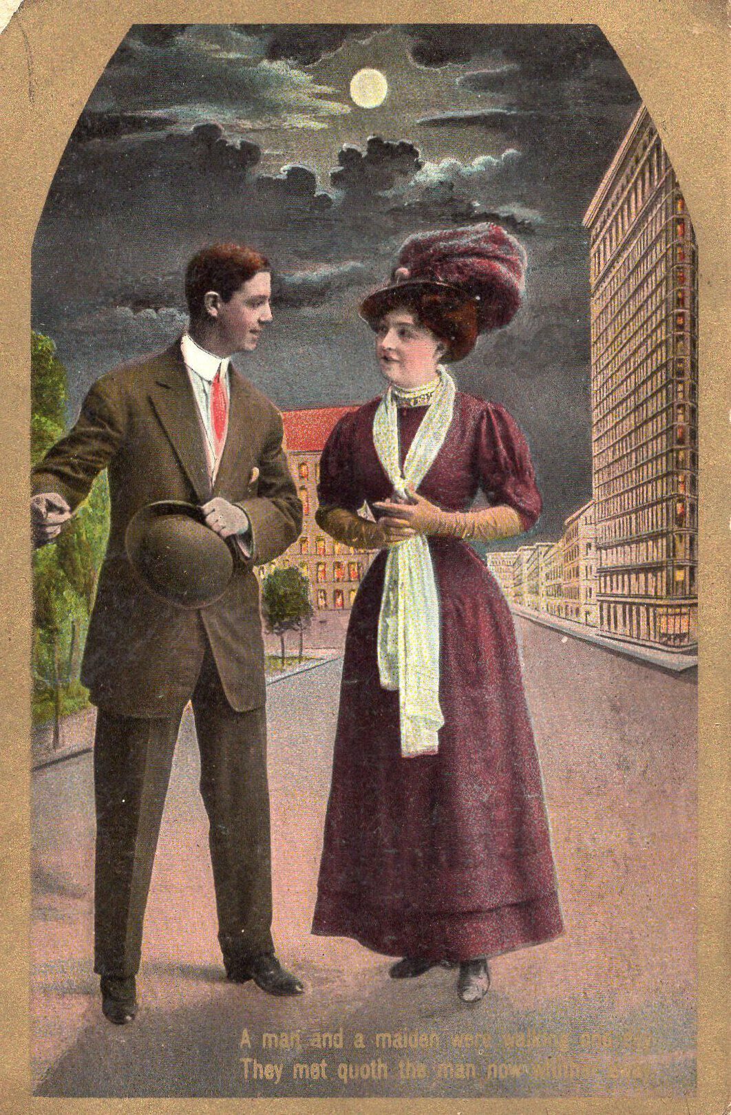 A postcard of a man and woman walking at night with the words "A man and a maiden were walking one day. They met quoth the man now withered away" written on the postcard.Postcard Details