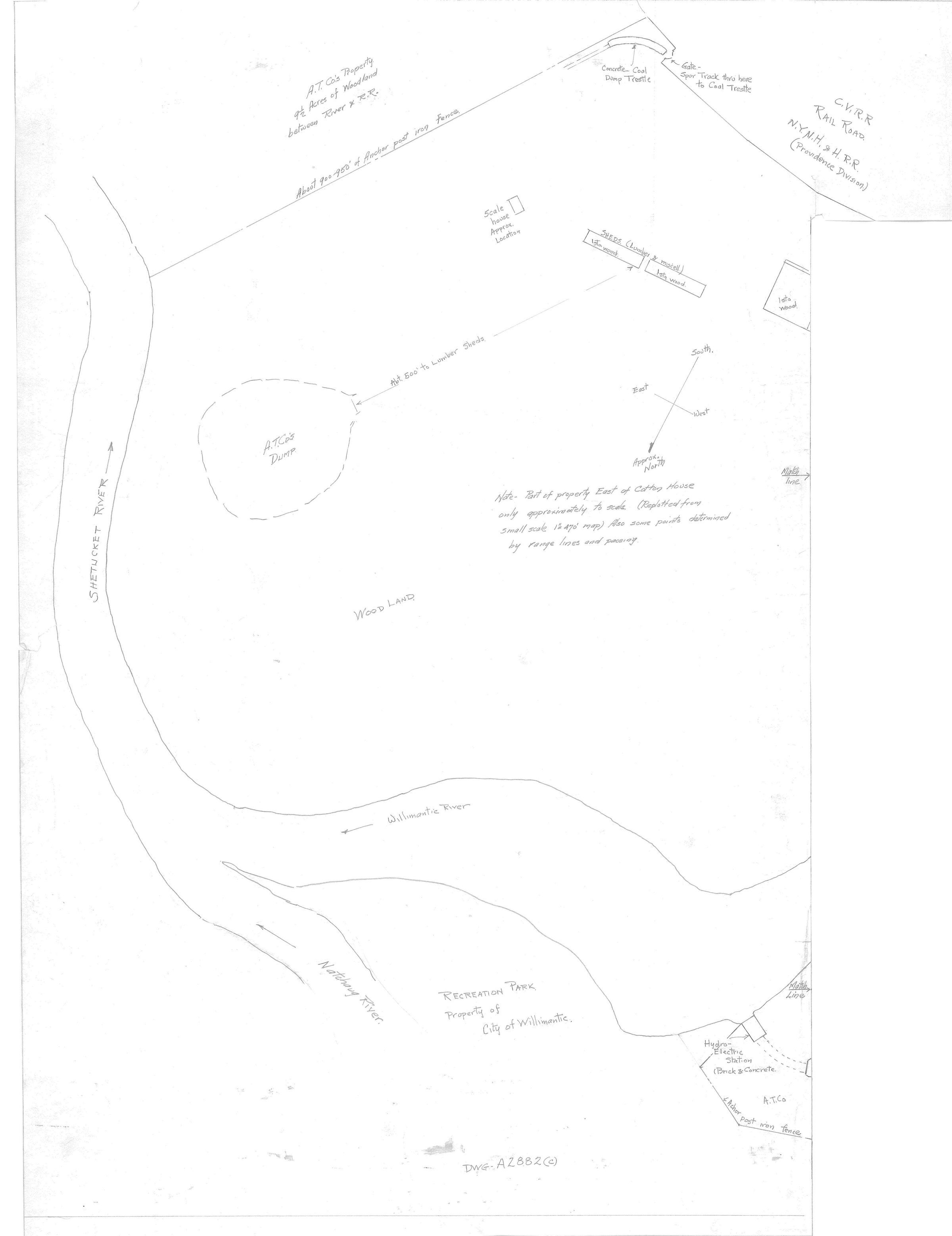 Sketch map showing the location of the hazardous waste dump of the American Thread Company, Willimantic Mills, Willimantic, CT. Only approximately to scale; replotted from a small scale 1 in. = 470 ft. map; some points determined by range lines and pacing. Drawn by an ATCO engineer.Collection