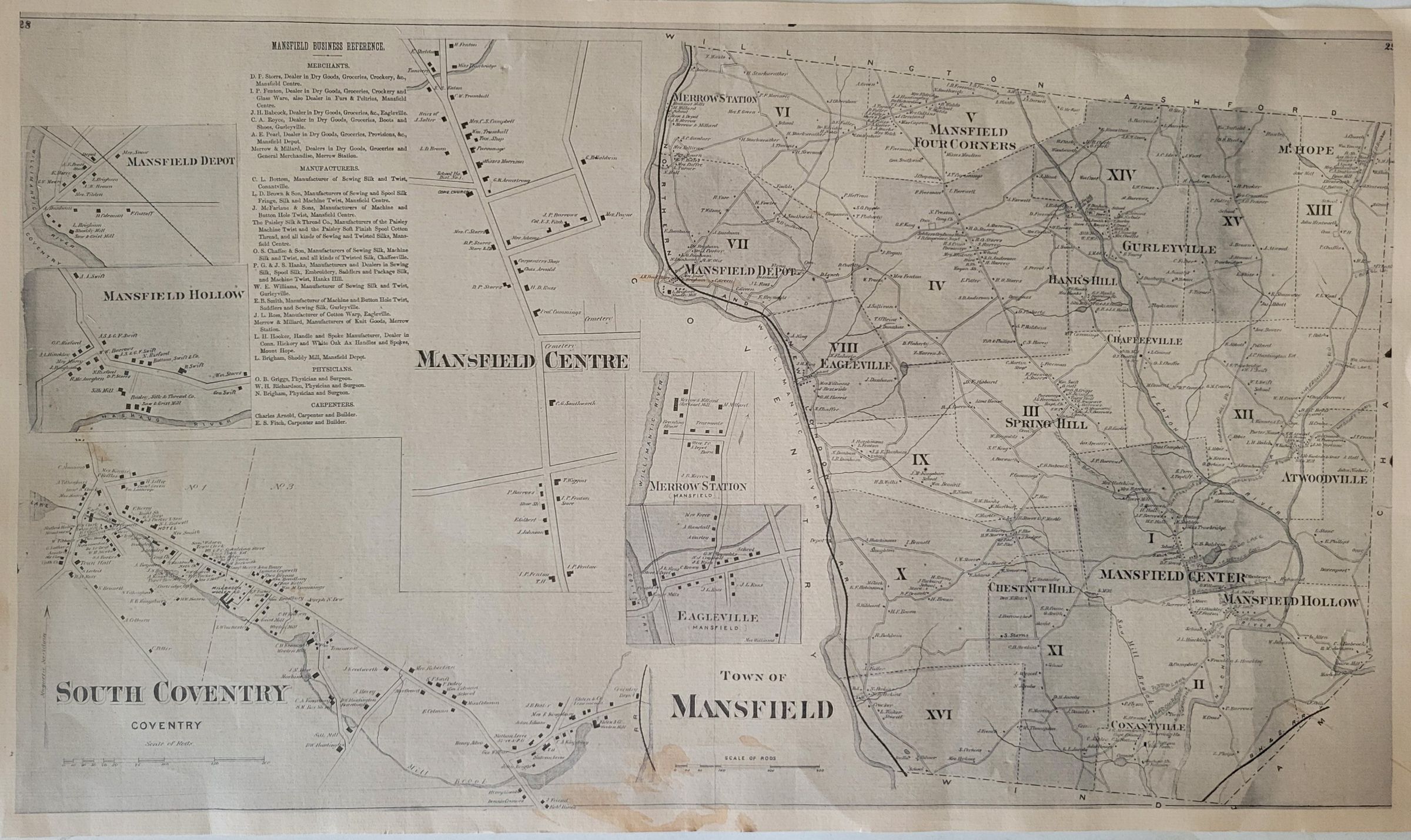 A map of South Coventry, Mansfield Centre [sic], and Mansfield, circa 1905. The map includes a list of local merchants, manufacturers, physicians, and carpenters. It is printed on thick cardstock and is stained at the bottom center.Collection