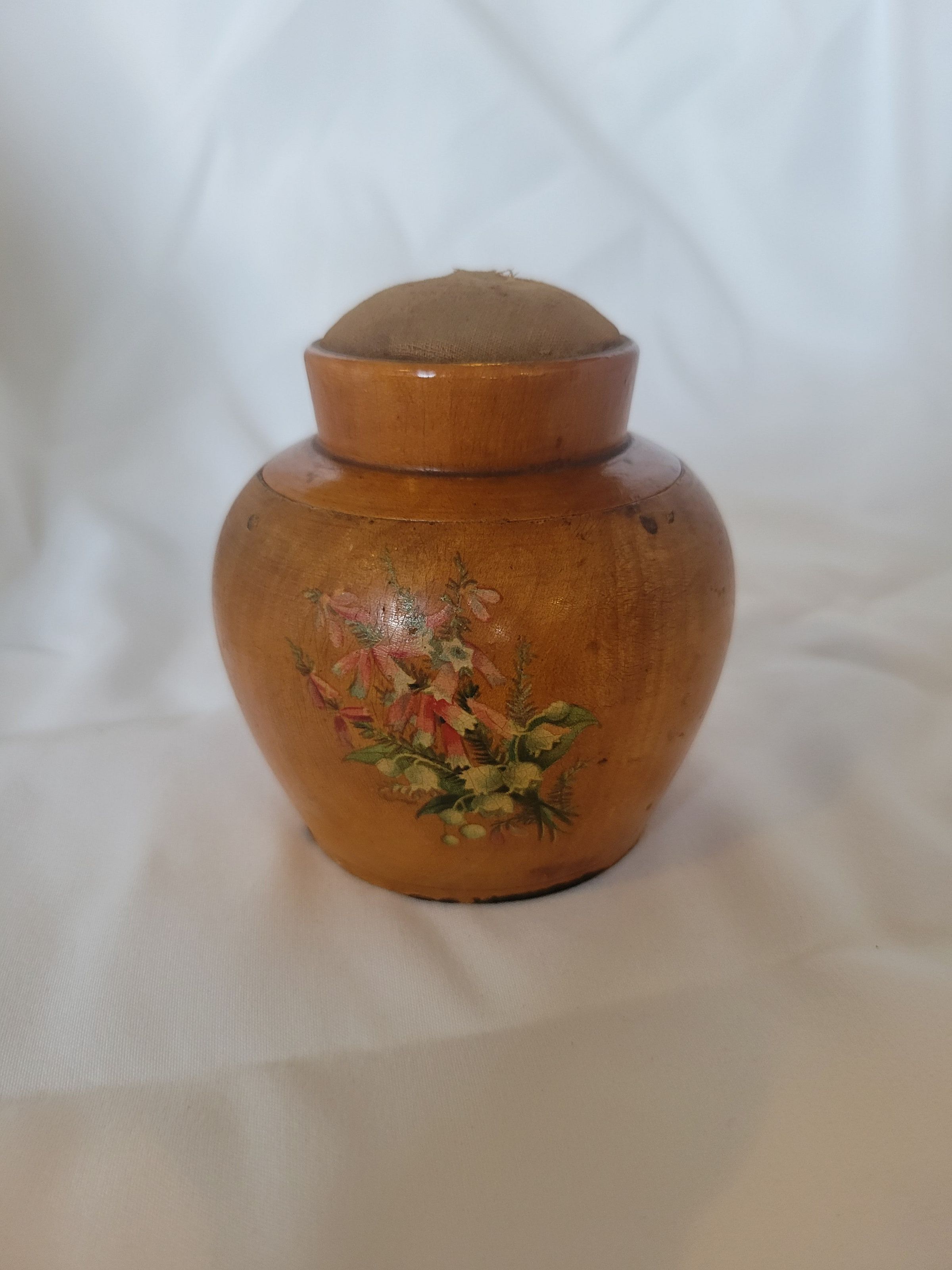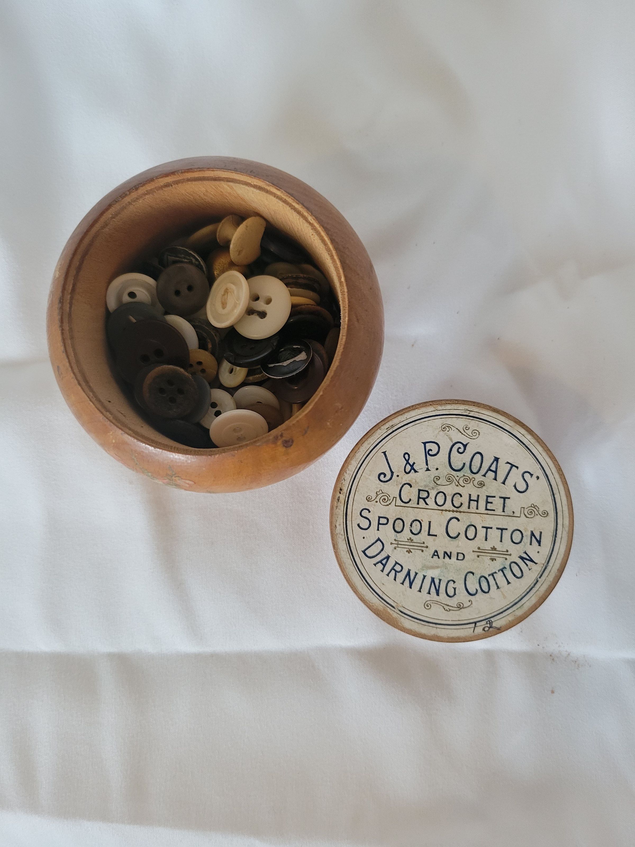 A Mauchline ware container with a fitted wooden lid and a pin cushion on top. Mauchline ware was very popular in the mid to late 19th century, and fell out of fashion in the early 20th century. From goldingyoung.com, "Usually made from sycamore, the early decoration was transferred on and the later pieces used actual photographic prints which advertised areas, generally in Scotland but elsewhere, basically as tourist pieces with transfers of coastal towns and land marks proving popular as were famous buildings and places associated with Robert Burns and Sir Walter Scott." Mauchline ware generally takes the form of sewing notions and snuff boxes but can also be found on other various vessels. This piece features a color transfer of a bouquet of flowers. On the inside of the lid there is a label for J&P Coats. James Coats established his business in 1802, and his sons, James and Peter, took the thread making business over from their father in 1830. The company still exists today as the Coats Group. Inside the vessel is a collection of buttons of various types.Collection