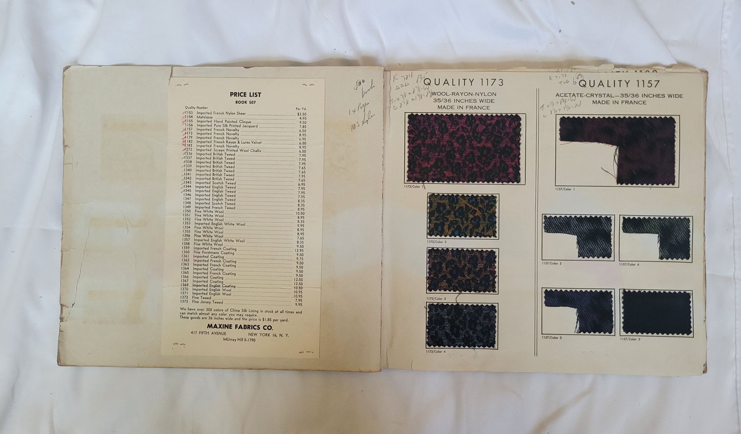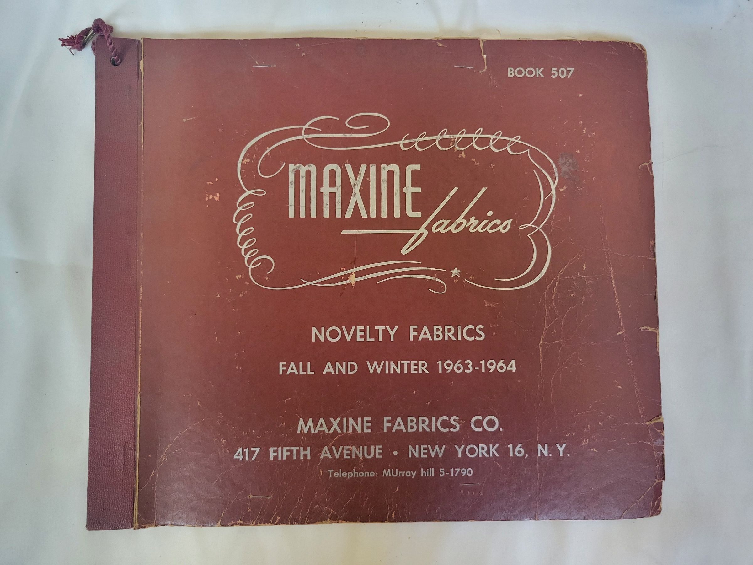 A sample book from Maxine Fabrics, fall and winter 1963-64, book 507. This book contains novelty fabrics with unique patterns and textures used for many different types of clothing. The inside cover features a pricing list per yard for all of the fabrics, the rest of the book is dedicated to samples. All samples are on the right side page, the left being black. Each sample has an accompanying number, though the only names they are given is "color 1, 2, 3" etc. Some of the samples are missing or damaged. The book's covers and pages are wrinkled and torn around the edges, though the binding is solid, featuring a short length of looped maroon cord fed through at the top.Use