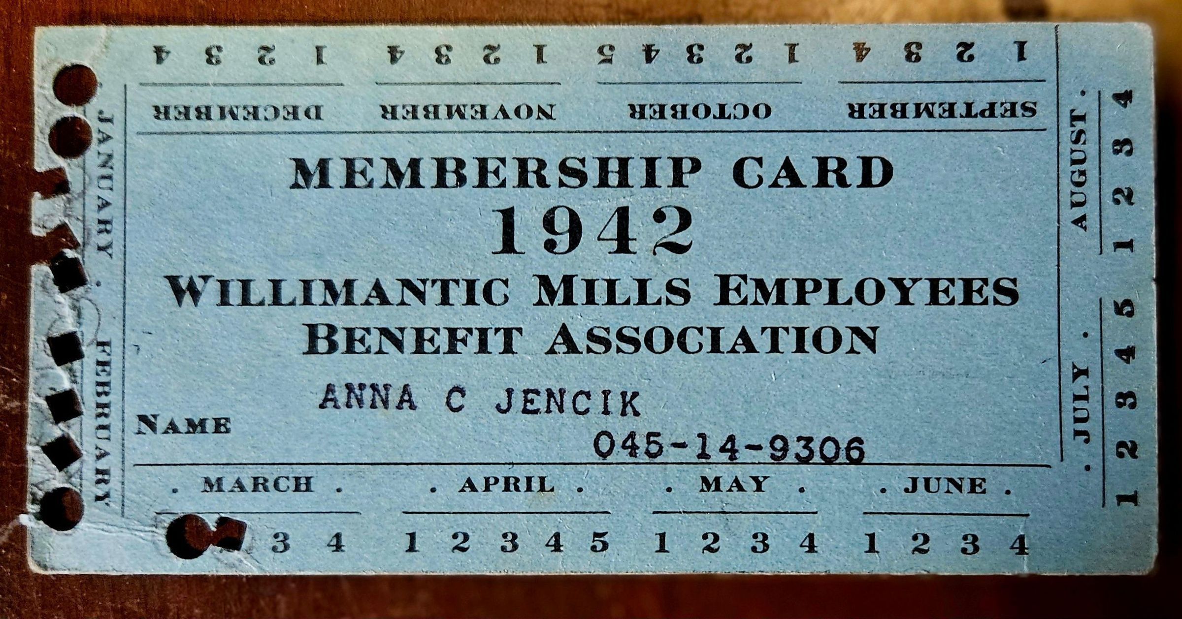 Membership card, declaring that Anna C. Jencik was a member of the Willimantic Mills Employees Benefit Association. Willimantic Mills refers to the Willimantic, CT, plant of the American Thread Company. The card is dated 1942.Collection