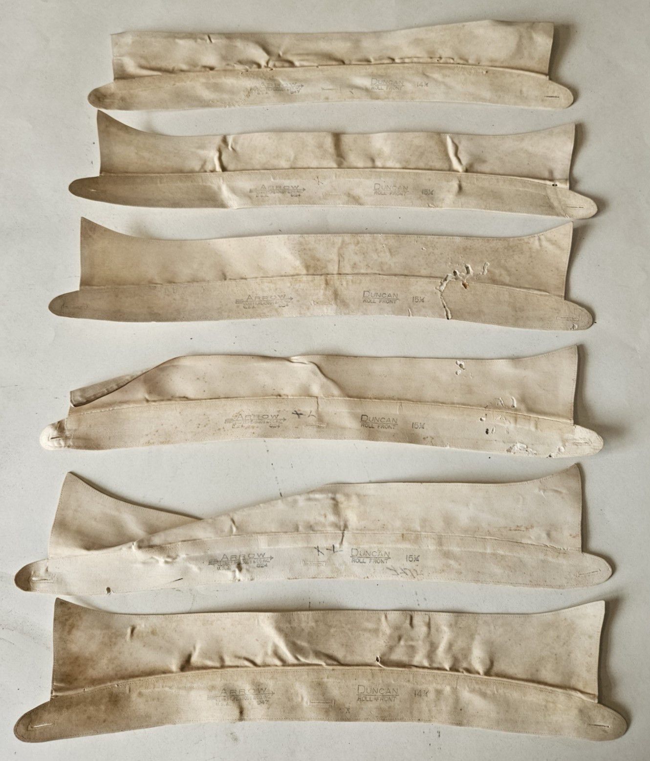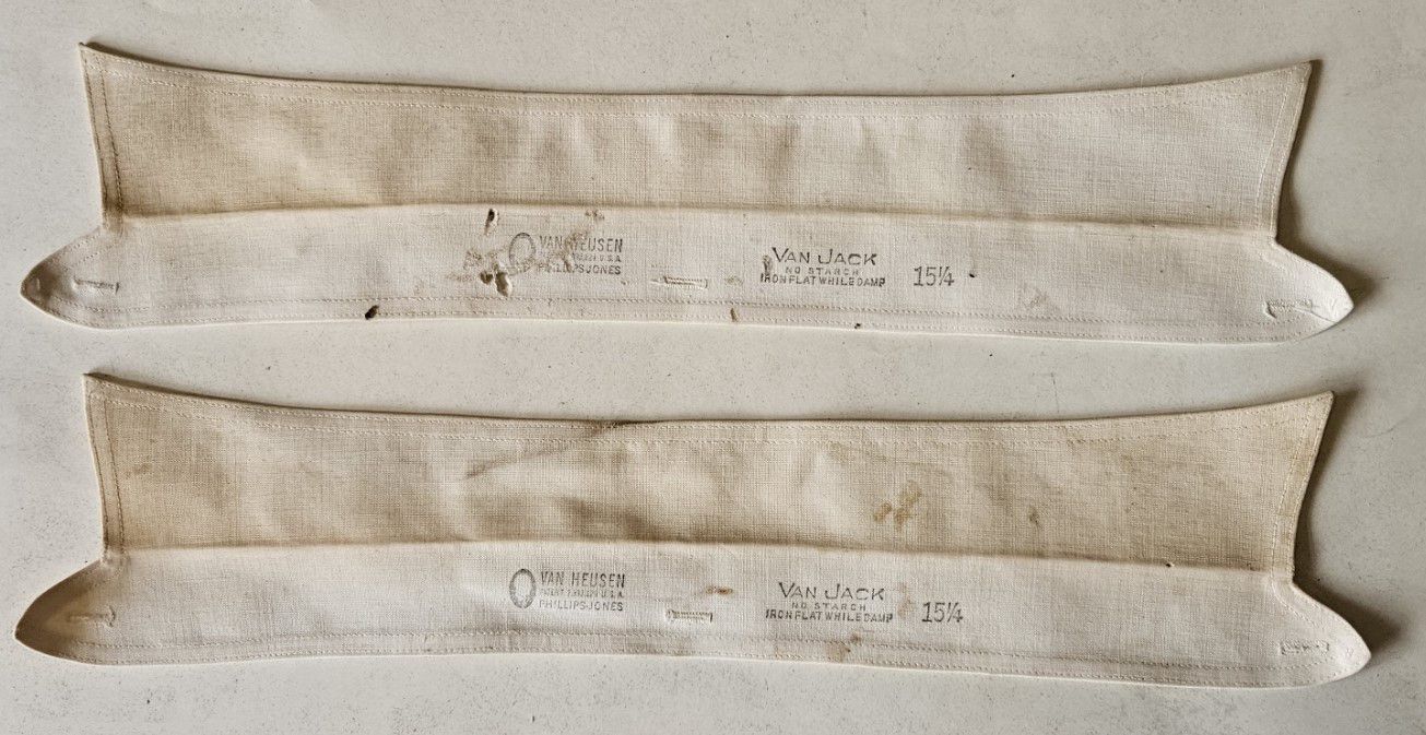 Eight men's shirt collars: two Van Heusen / Phillips-Jones Van Jack no-starch (iron flat while damp) 15 1/4; six Arrow Duncan 15 1/4. Fair condition. Found with other garments in cellar of 151-F Pond Road in Franklin, CT. Some garments are marked RR. Donor believes the garments had belonged to Marjorie Burnham Ayer Robbins, born 1897, in whose home the garments were found, and/or the Robbins family into which she she married. RR could have been Marjorie's second husband, Roger Robbins.