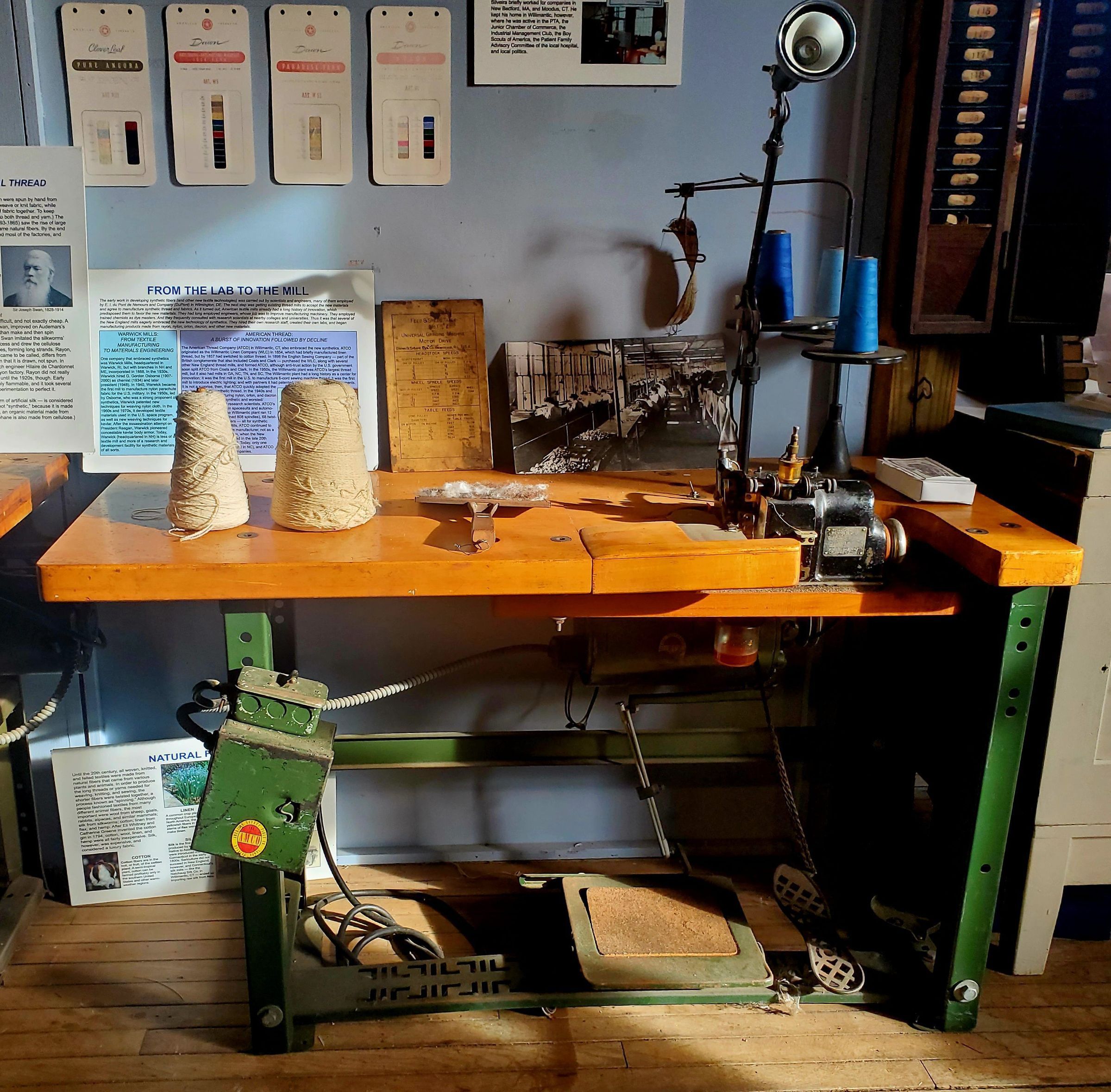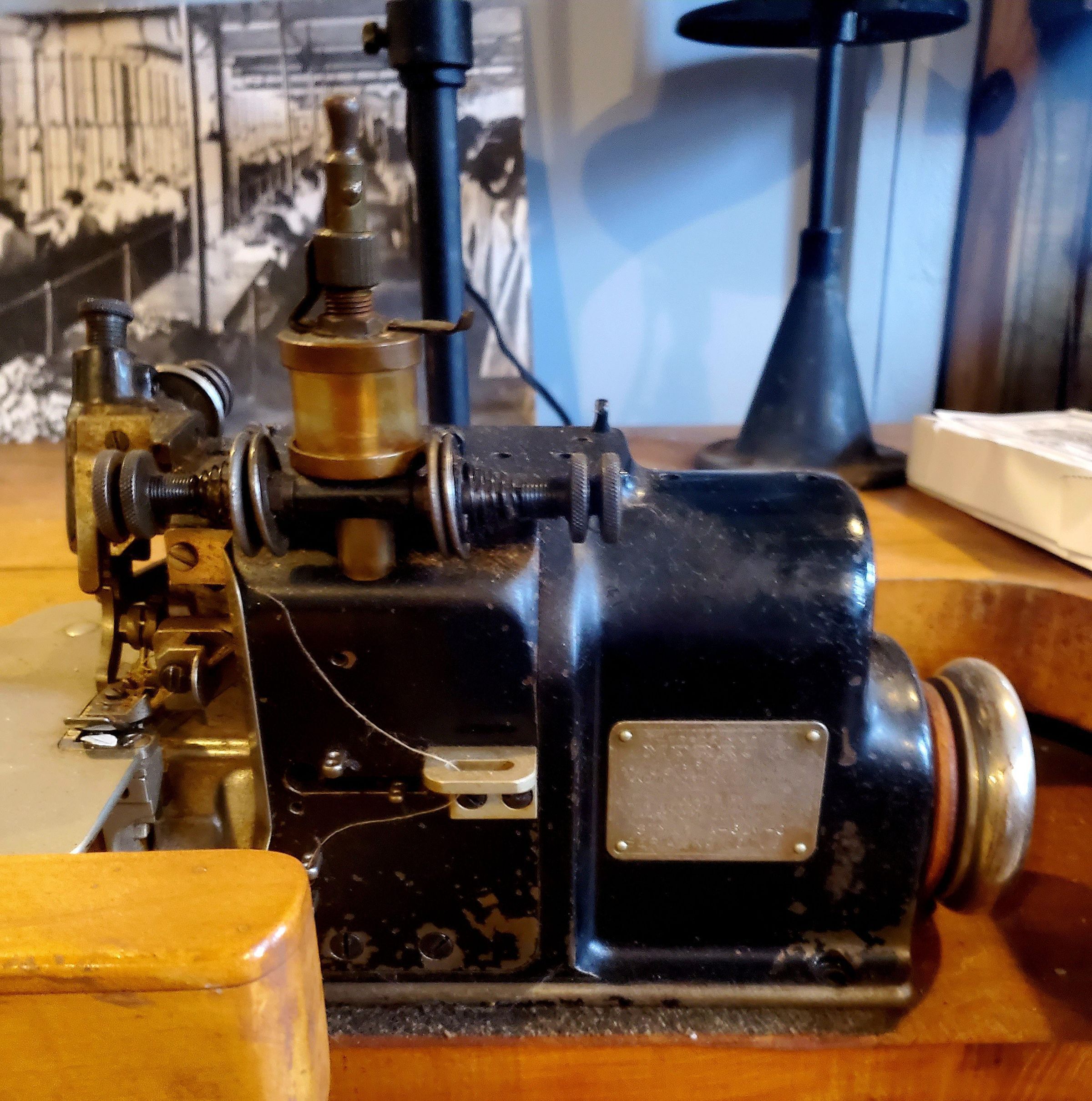 Industrial serger overlock sewing machine and table, manufactured by the Merrow Company. "Made by the Merrow Machine Co., Hartford, Conn., USA. Style A-3DW-3. Serial No. 69005." Merrow began manufacturing its "A" line in 1932, and moved to Wethersfield, CT, in 1972. Although based today in Fall River, Massachusetts, the Merrow Sewing Machine Company, which manufactures industrial sewing and crochet machines, got its start in Mansfield, Connecticut. In the early 19th Century, Joseph Merrow established a gunpowder mill in Mansfield, CT. An explosion destroyed the mill in 1837. He then decided to build a knitting factory on the same site in what is now the village of Merrow, using water power from the Willimantic River. The knitting mill opened in 1838. Two years later in 1840, Merrow added a machine shop to build machinery for his factory. At first Merrow used native wool, which he sorted, scoured and dyed, picked, carded, and spun into yarn and knitted into hosiery. Merrow delivered the stockings throughout New England using two-horse wagons. Following the gold rush of 1849, he sent shipments of goods by sail to San Francisco. During the Civil War, the company did an enormous business making woolen stockings for the Union Army. In 1877 the Merrow Company patented the first crochet machine. To accommodate its steady growth, in 1892 the company relocated to Hartford, Connecticut. It continued to grow. In 1964 it opened a subsidiary, Franklin Industries, in Georgia, and in 1972 acquired the Arrow Tool Company in Wethersfield, Connecticut. The company moved to Newington, Connecticut, in 1982, and to Wareham, Massachusetts, in 2004 and Fall River, MA in 2010. See https://millmuseum.org/sewing-revolution/.