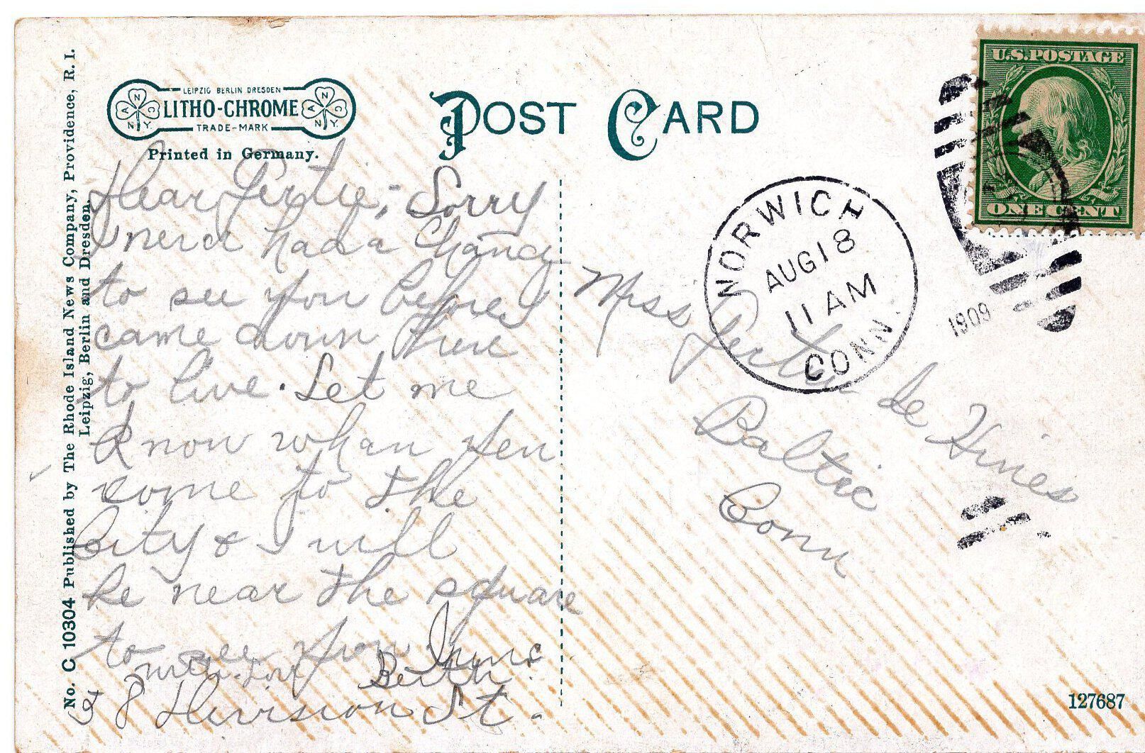 This postcard was printed in Germany in 1909 for Norwich CT.Created By