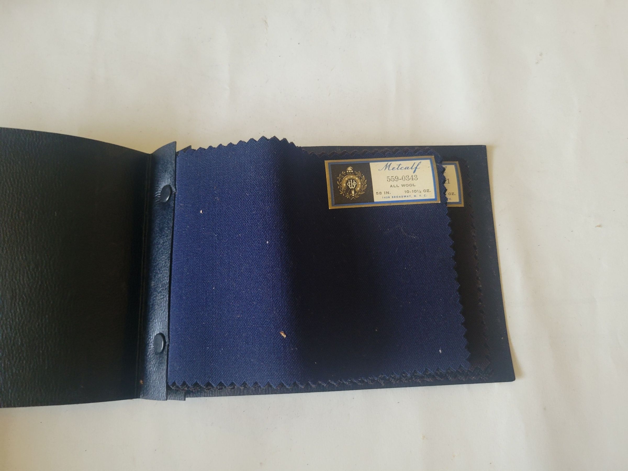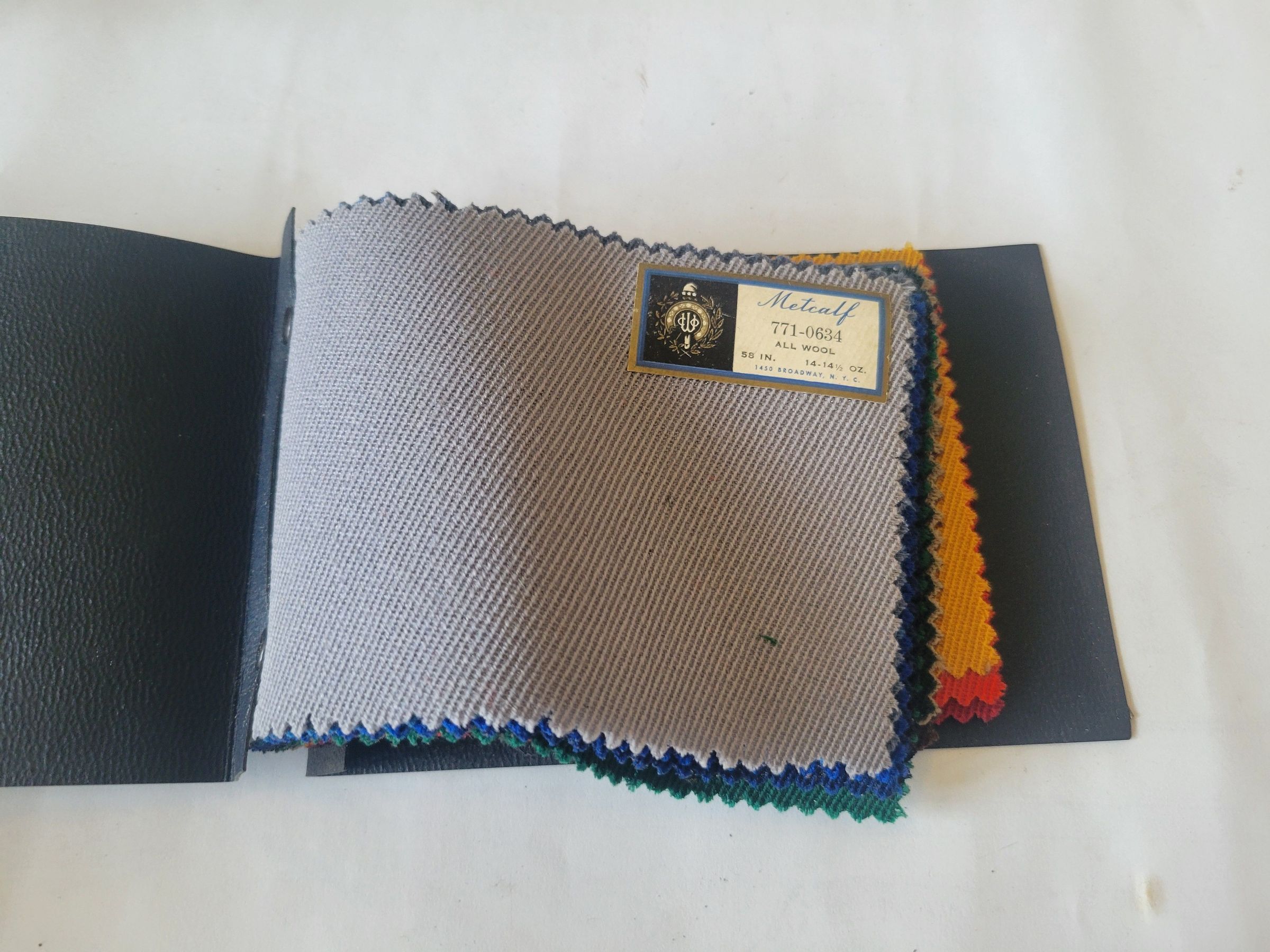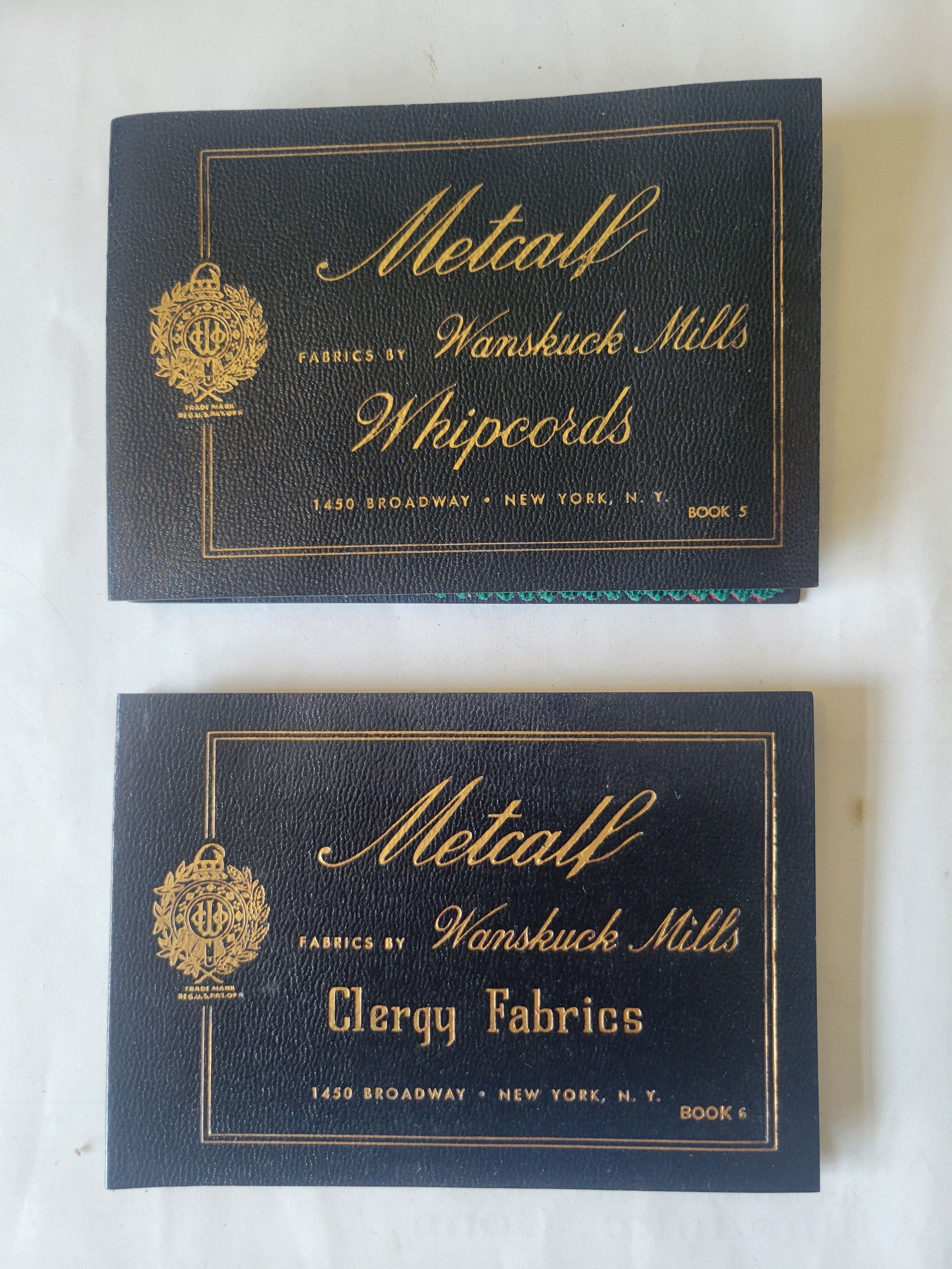 Two sample books from the Metcalf Company, a selling agent for Wanskuck Mills of Providence, RI. One book, labeled book 5, is filled with colorful samples of whipcord fabric. Whipcord is a durable cotton fabric used mostly for outdoor fabrics, pants, and workers' garments. It is a common alternative to duck cloth. The other book, labeled book 6, is filled with a few black and navy samples of clergy fabric. As the name suggests, clergy fabric refers to fabric used to make the clothing worn by priests or other members of the clergy. Each sample in both books bares a sticker with the Metcalf logo as well as the catalog number for the fabric, the fabric's width and weight, and the company's address, 1450 Broadway New York, NY. The Metcalf company later became Metcalf Brothers and Company. Wanskuck Mills were founded in Providence, RI in 1862 and grew as a textile company until 1957 when they stopped creating textiles, though the company continued to exist as a conglomerate.Collection